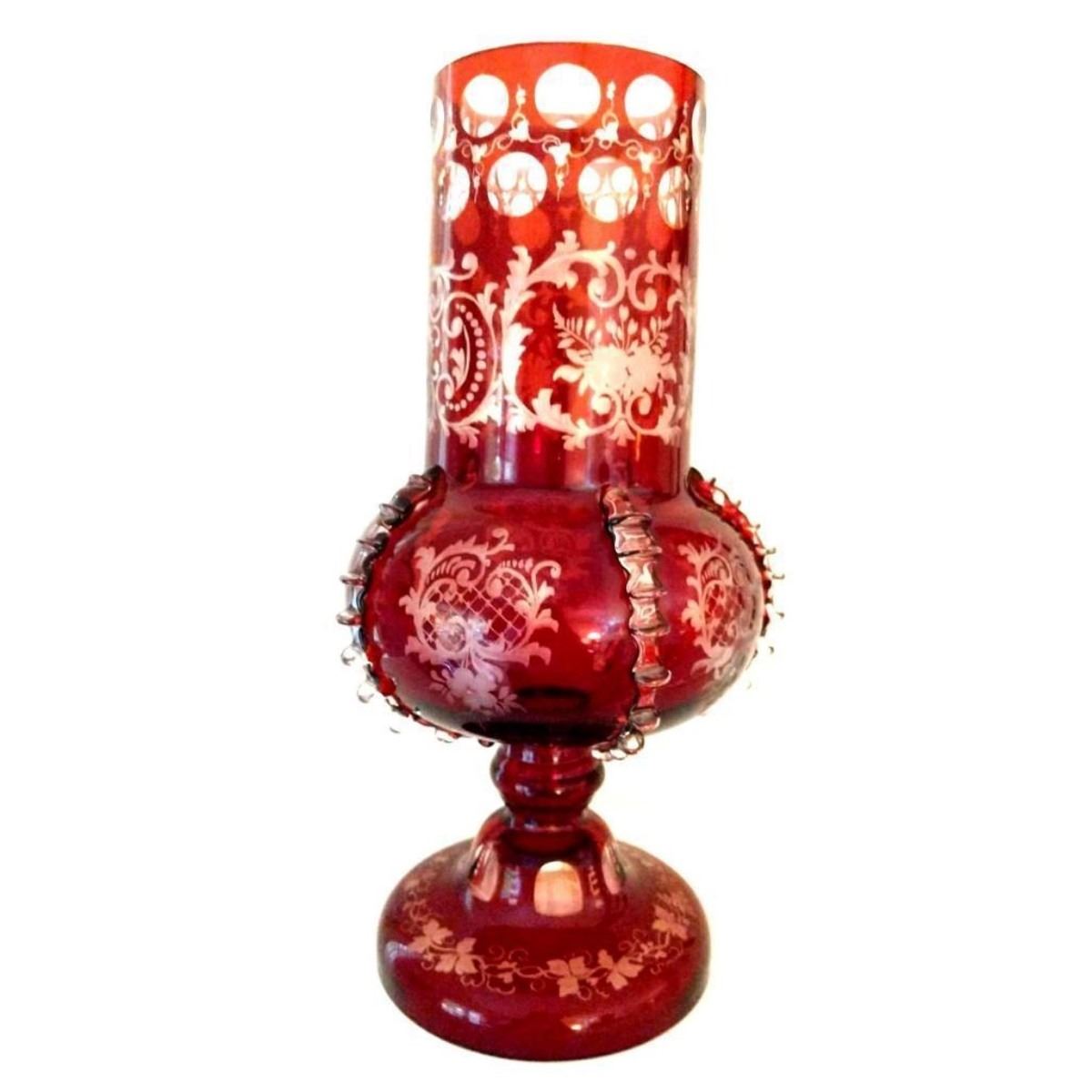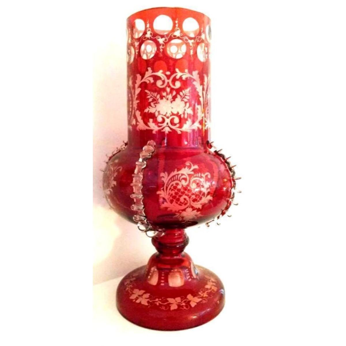 A Pair of Two Bohemian Ruby Glass Luster From The Late 19th Century. The Bohemian Style Offers the Clear Cut Design and Contrasting Ruby Color For A Beautiful Centerpiece For Your Mantle or Dinning Area.