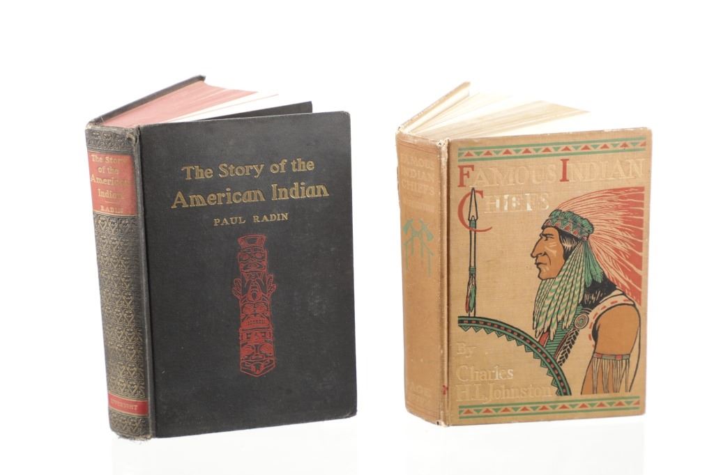 Featured in this lot pair of books on Native American Indians. The first book is a 1909 First Edition of “Famous Indian Chiefs” by Charles H. L. Johnston. The book is a collection of biographies of famous chiefs such as Pontiac, King Philip, Tecumseh, their histories, battles, treaties, sieges, and struggles with the whites for the possession of America. Featuring an illustrated cover, exhibiting scuffing and fading to the covers, intact pages, loose spine, age tanning observed. Measures 6"W x 8.25"L x 1.75"D. The second book is, "The Story of the American Indian" By Paul Radin. First printed in 1927, this is the 1944 "Enlarged Black and Gold" edition, with a 1934 preface from the author. An account of Indian culture from the rise of the Mayan civilization, and of the great tribal movements that have taken place on these continents. Featuring an illustrated gold gilt hardcover with slight scuffing noted. Intact deckled pages with age tanning, measures 6"W x 8.75"L x 1.5"D. Collective weight is 3lb, 10oz.