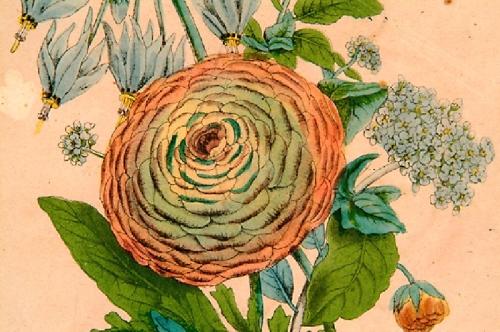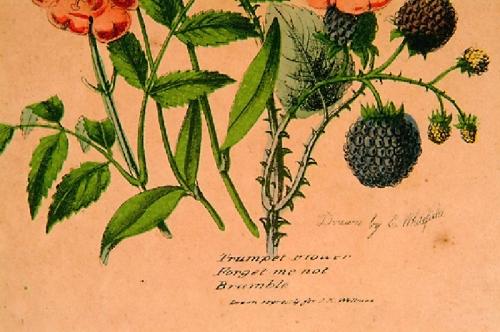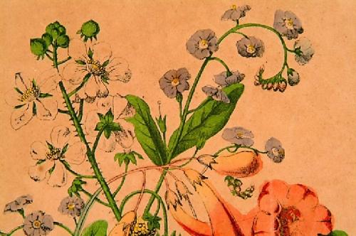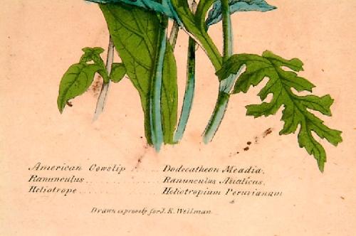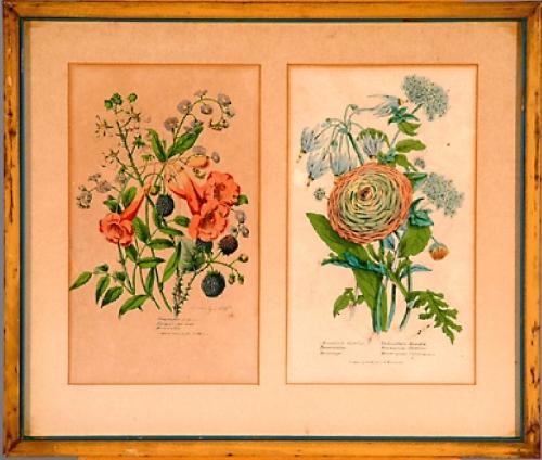 Whitefield, Edwin (British ? - 1892) drawn expressly for J.K. Wellman. Pair of handcolored, double matted and framed botanical prints with acid burn and some foxing. Color is good. Number one of the pair: on left: Symphylum Orientals, on right: The Blu
