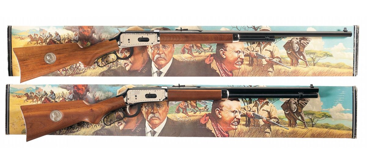 A) Manufactured in 1969 with the standard markings and features of the Theodore Roosevelt commemorative. Consecutive serial number to "B" gun in this lot. With box numbered to gun with papers and shipping box numbered to both guns.