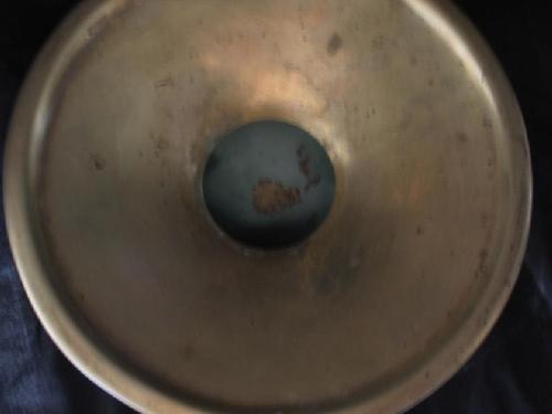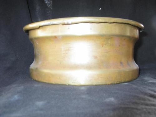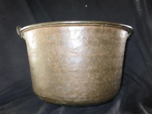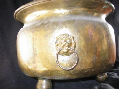Antique hammered brass kettle with lion's head handles, 9" by 12 1/2"; Antique hammered brass kettle, 7 7/8" by 11 1/2", Antique brass spittoon, 4 1/2" by 10 1/4".