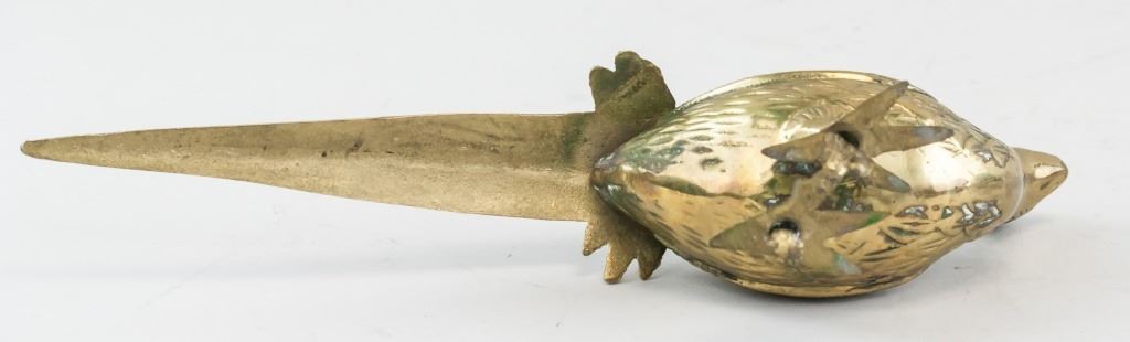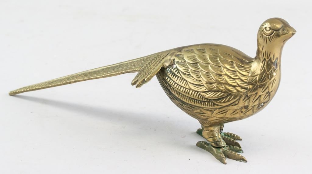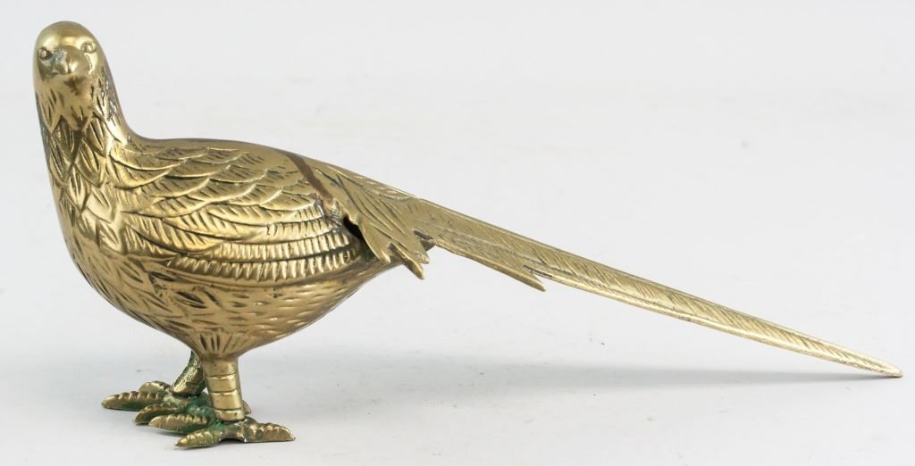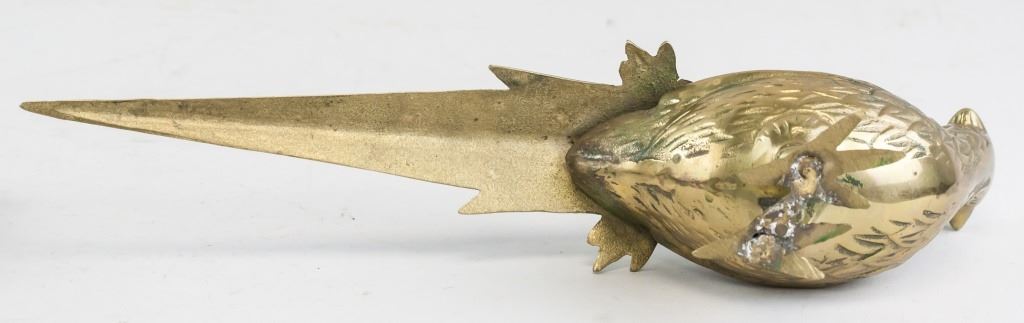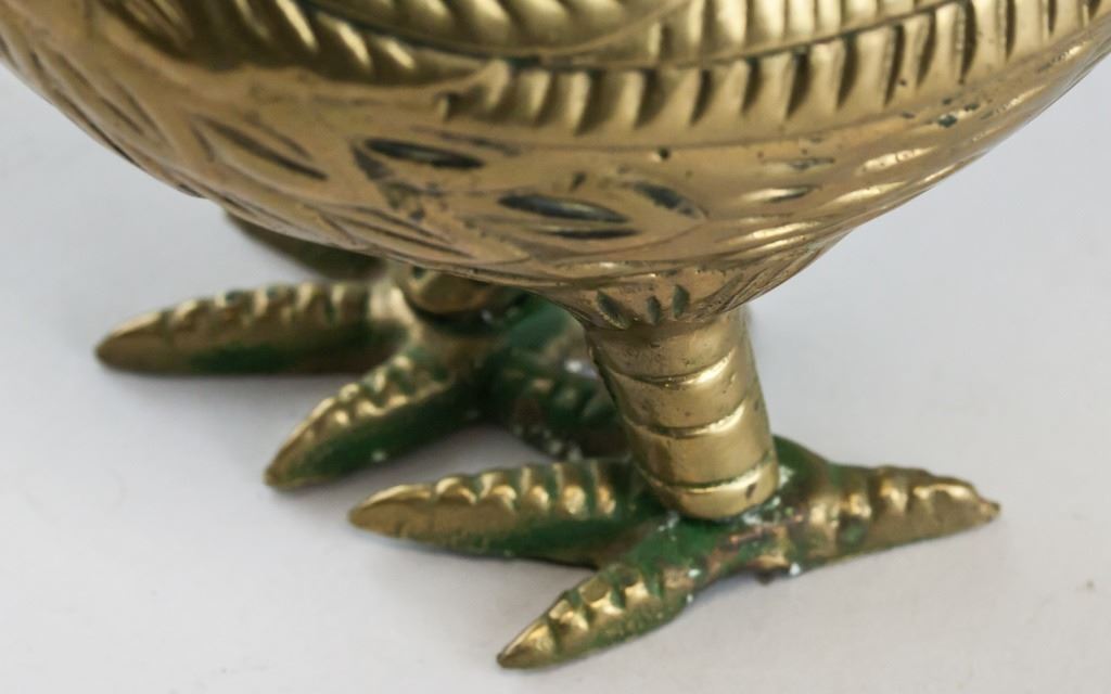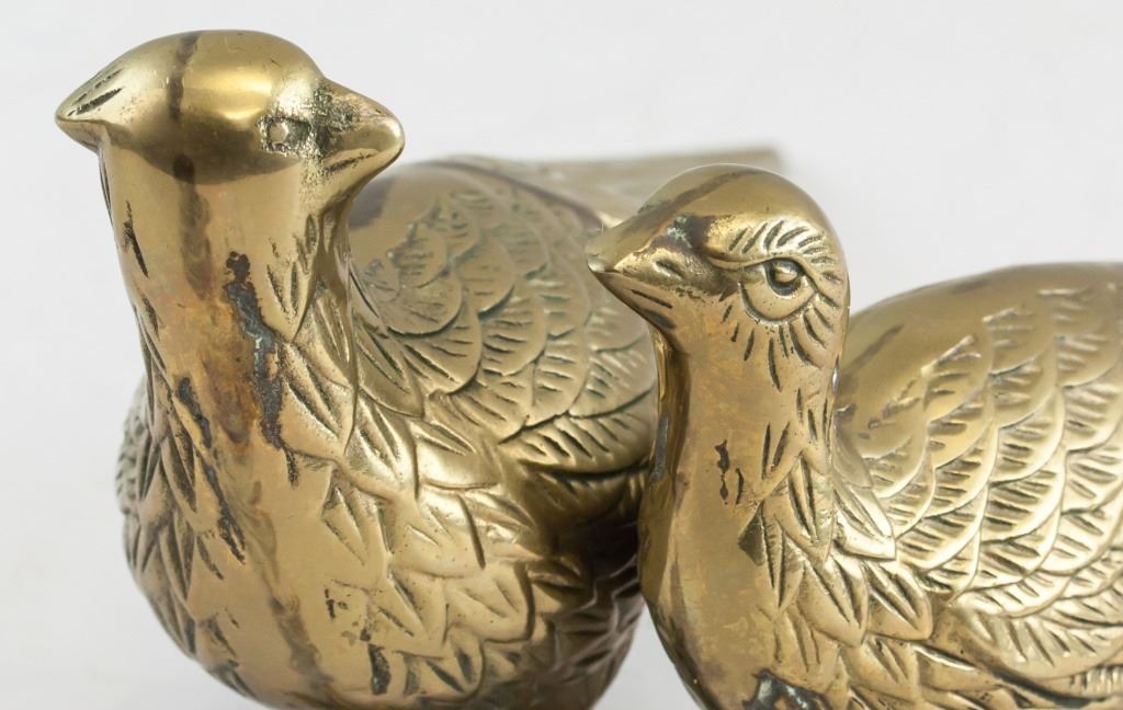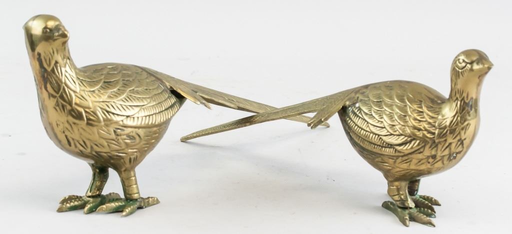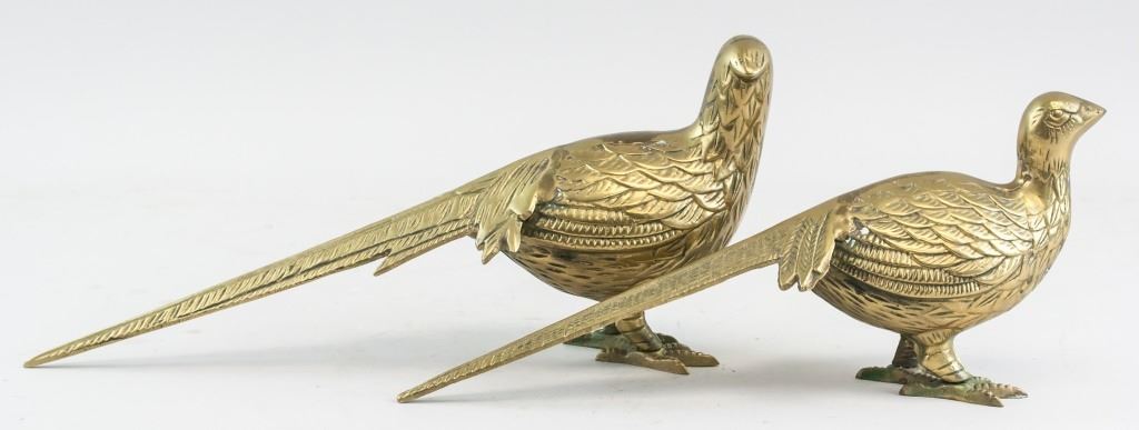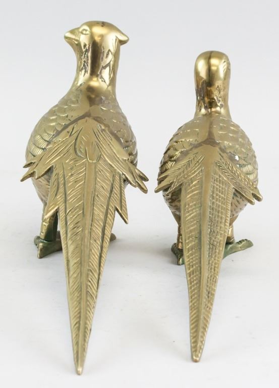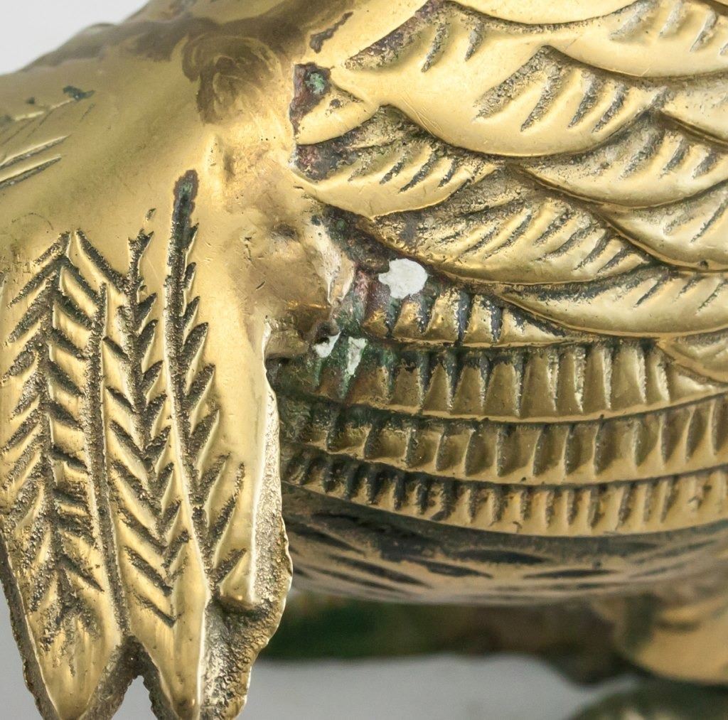 Pair of brass peacocks. Of gold tone. With folded tails. One is slightly larger than the other. 15 x 35 cm. 631 grams (each).