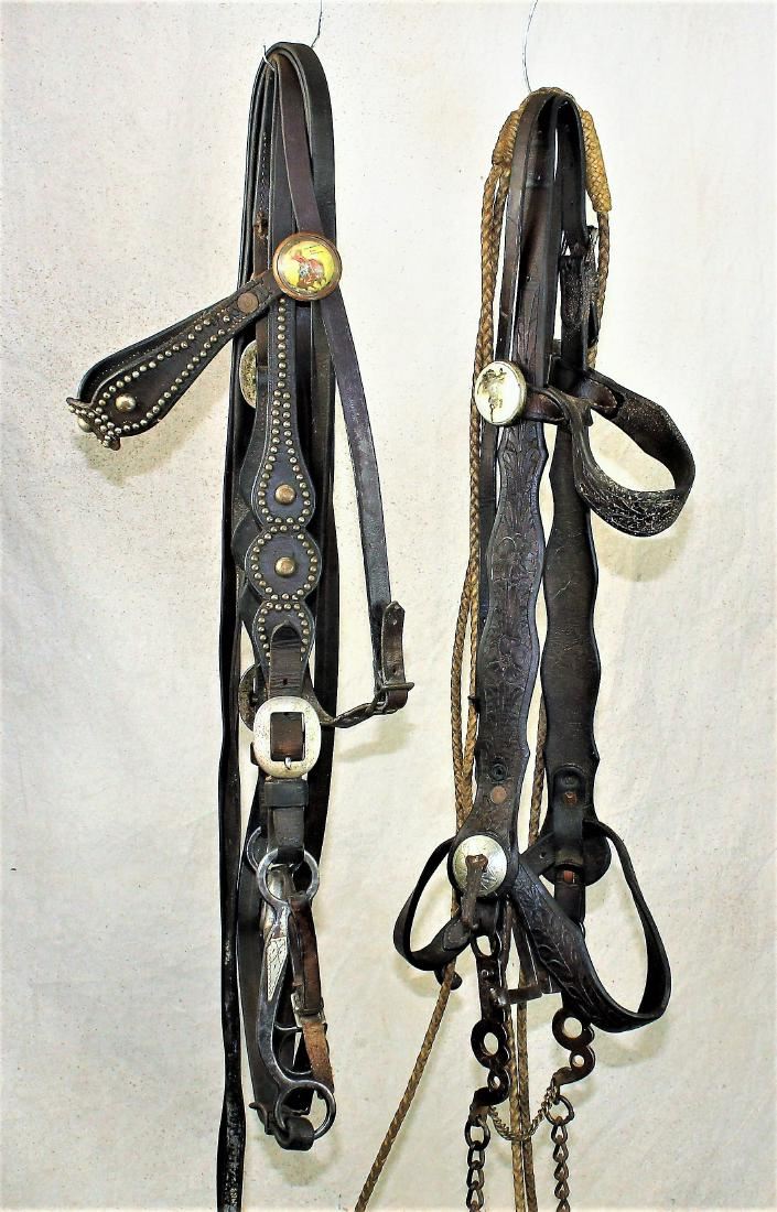 Two wide cheek bridles; 1) showy scalloped studded bridle with glass rosettes, and Kelly Bro's silver mounted bit. 2) Floral tooled bridle with browband, glass rosettes, braided rawhide reins, and wonderful early iron bit.
