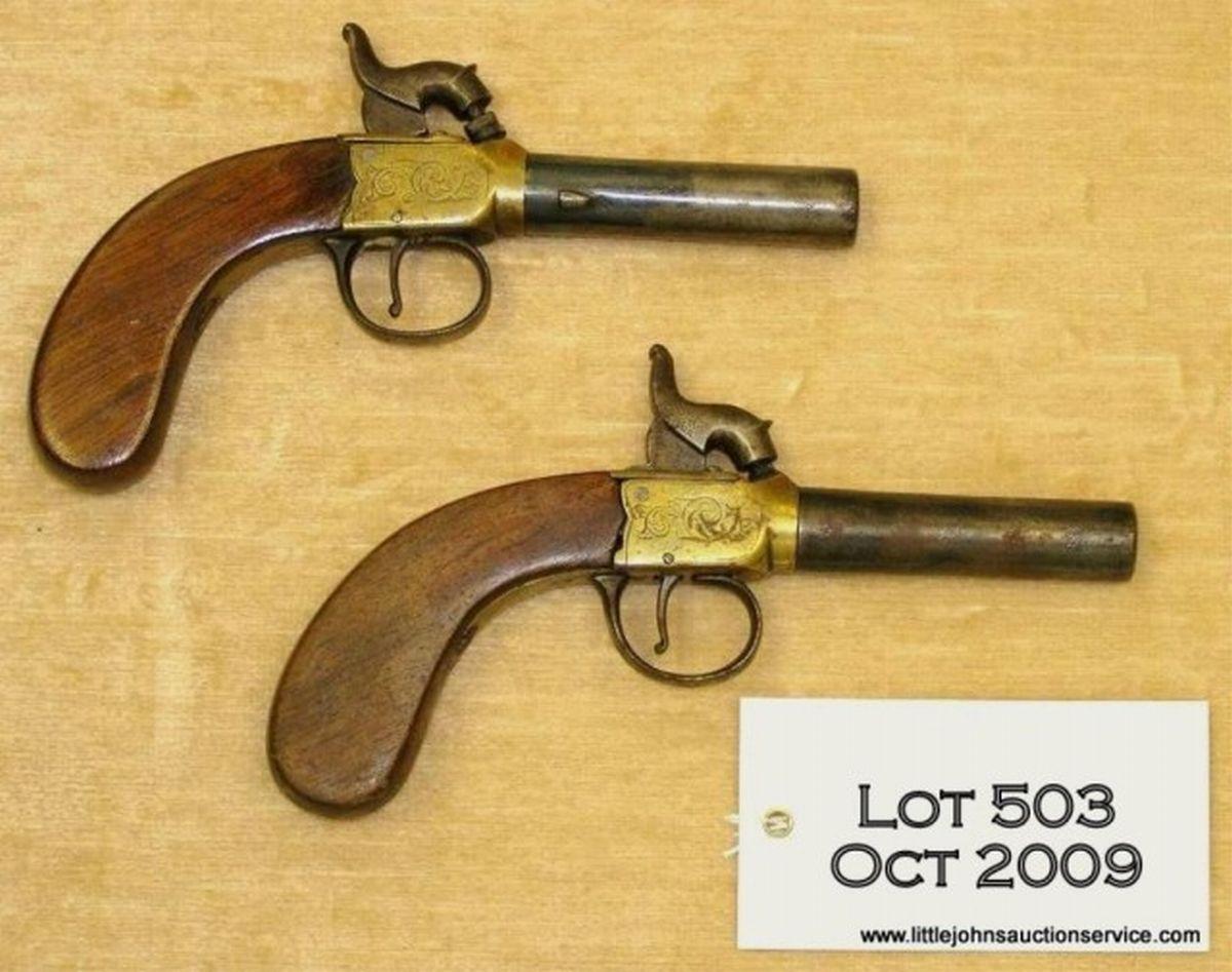 Pair of British proofed percussion muff pistols circa 1850's. Approx. 40 cal. 7 1/2" overall, 3" barrels, engraved brass frames, smooth sided bag shaped grips. Good condition w/ some pitting on barrels, rubbing on frames. The actions areworking and wood is good. The grips are larger than normally found. Est. $350 - $700
