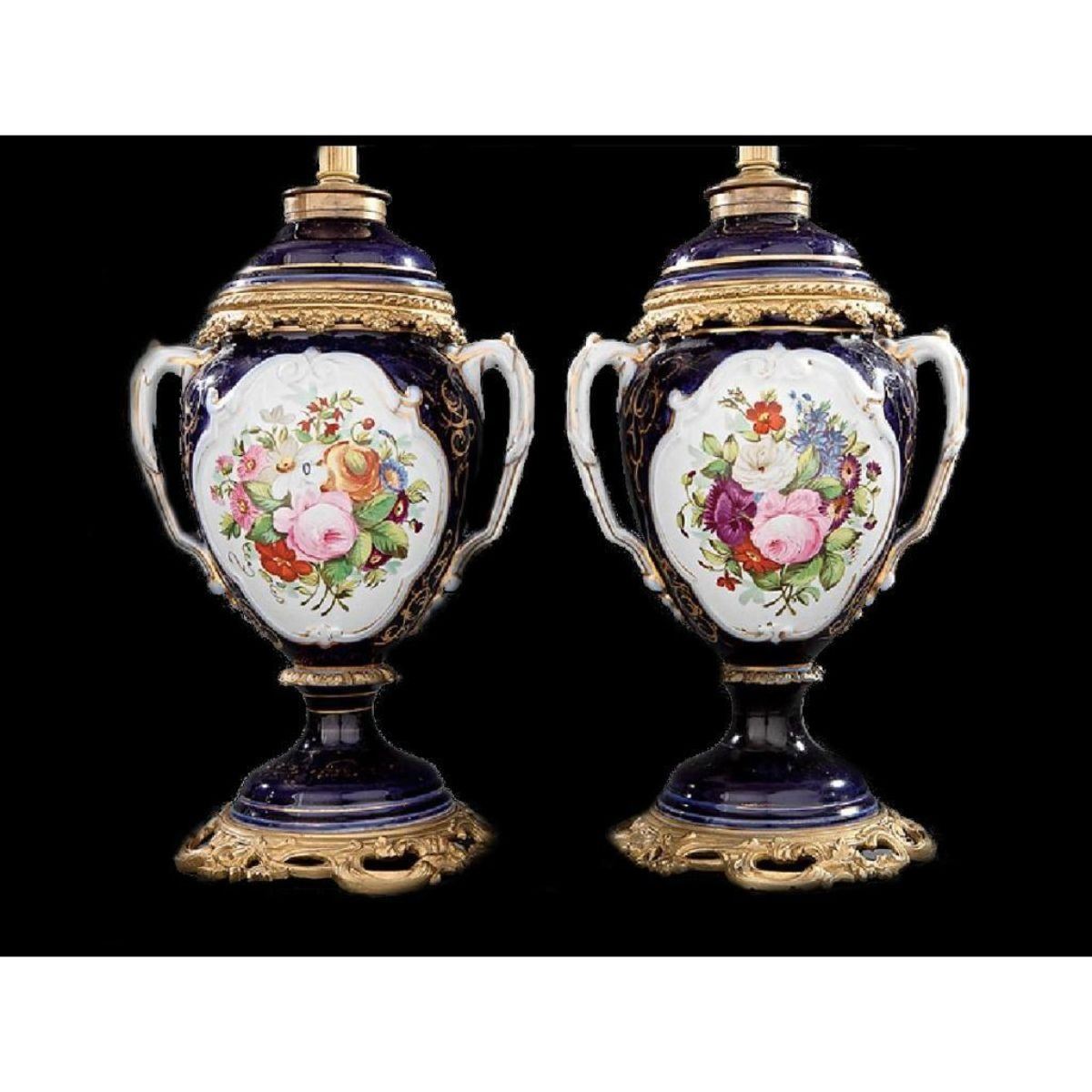 Pair of Bronze-Mounted Paris Porcelain Vases, cobalt ground, reserves with a young man playing the bagpipes and a woman admiring butterflies, vase 17" H X 10" W X 8" D, now mounted as lamps. - 9120-012818-LA-00881