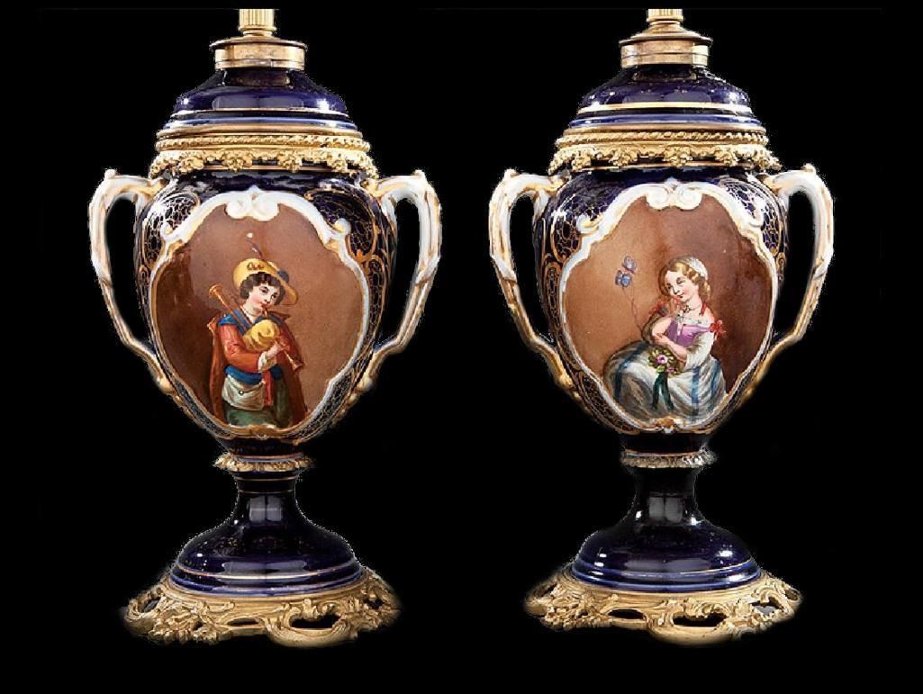 Pair of Bronze-Mounted Paris Porcelain Vases, cobalt ground, reserves with a young man playing the bagpipes and a woman admiring butterflies, vase h. 17 in., w. 10 in., d. 8 in., now mounted as lamps - 9120-012818-LA-00881