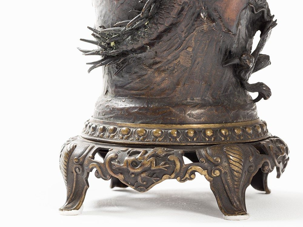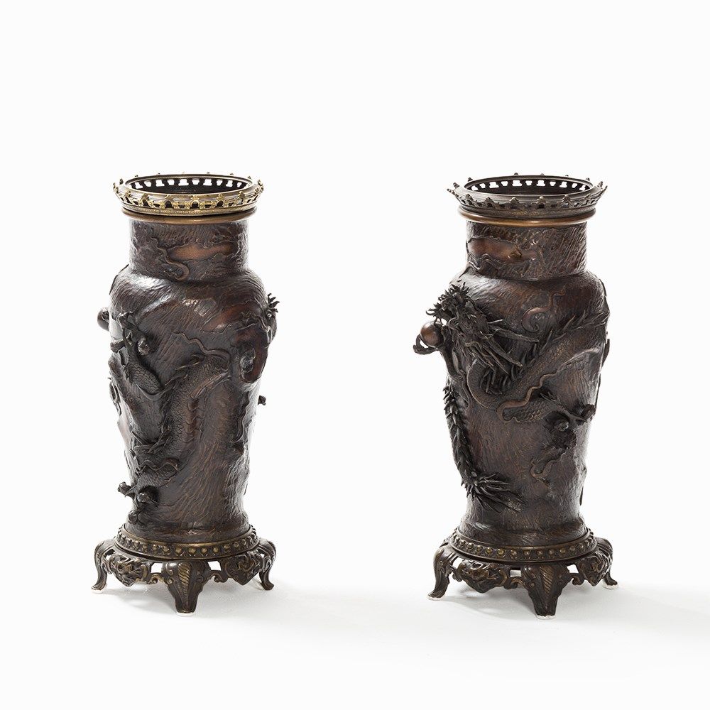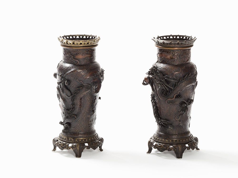 Pair of Bronze Vases with a Plastic Dragon on the Body, 19th C