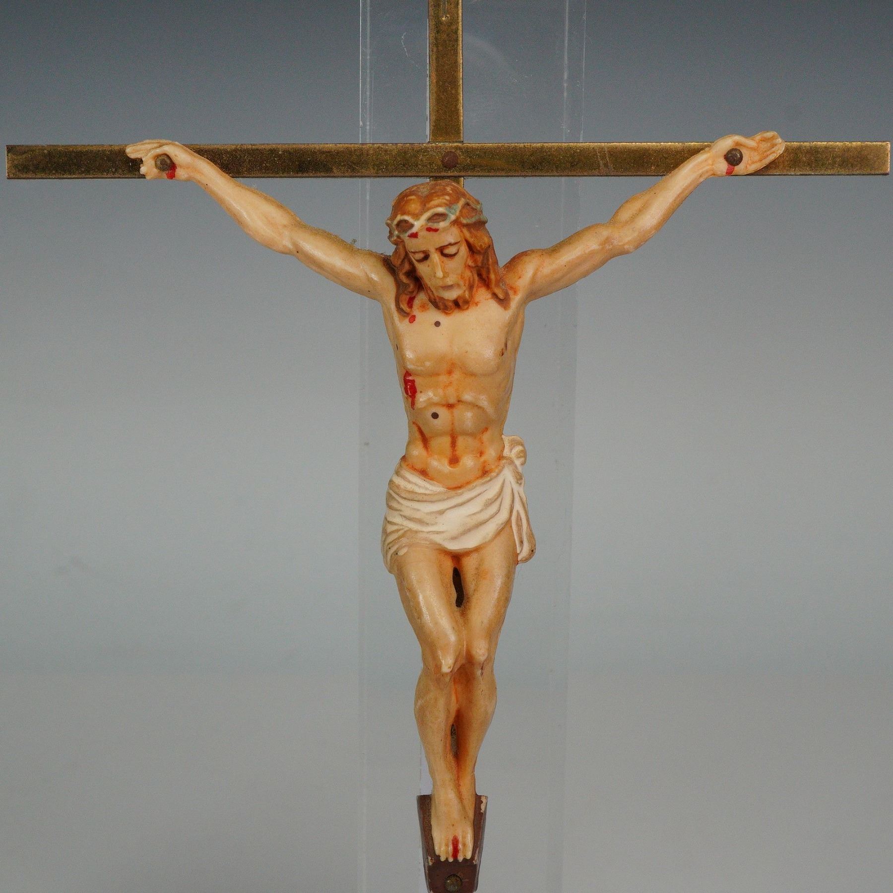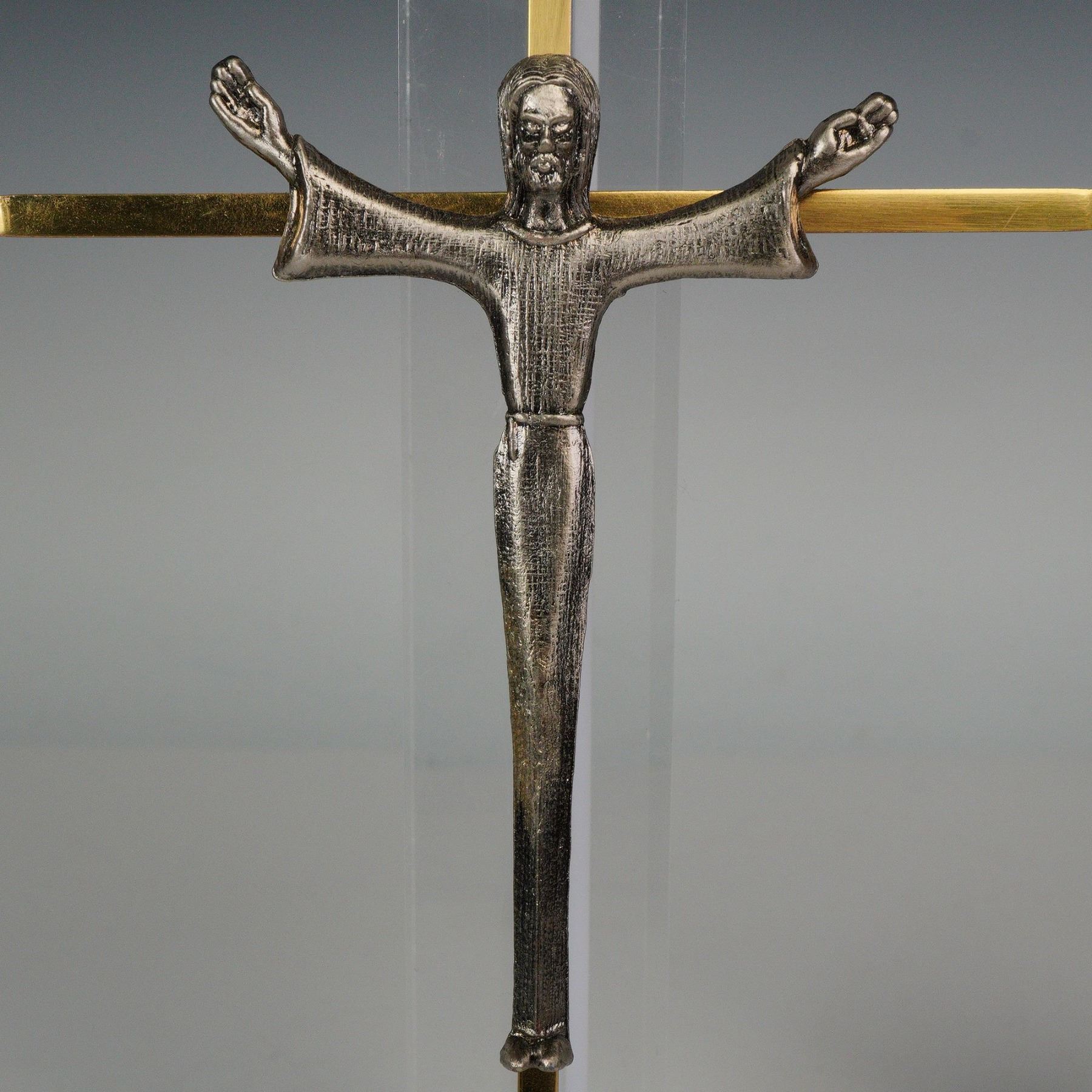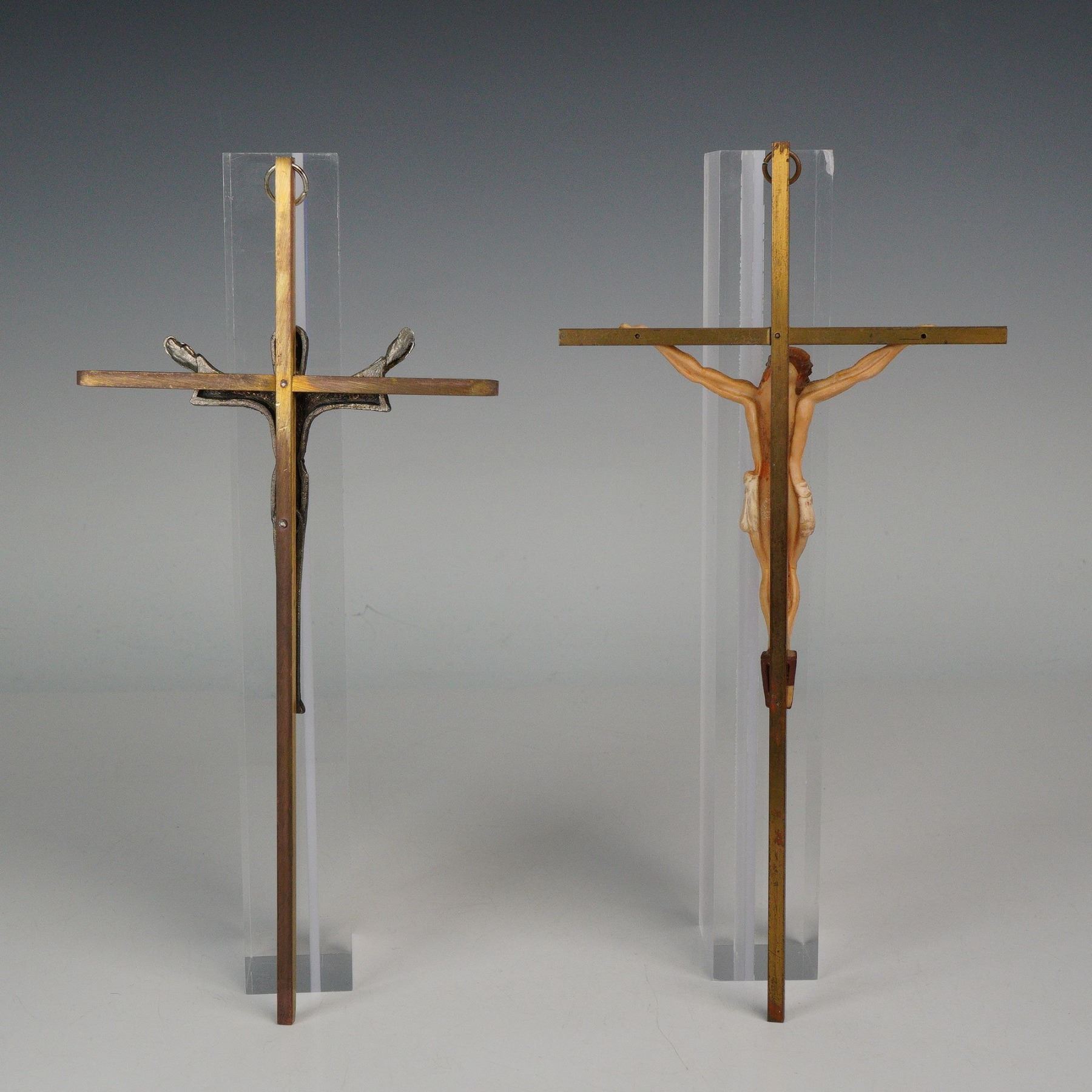A striking pair of bronze wall crucifixes, each featuring distinct interpretations of the Crucified Christ. One depicts a stylized modernist Christ figure rendered in silvered bronze with elongated, flowing lines and outstretched arms that convey a sense of serenity and transcendence. The other presents a more traditional representation of Christ, finely modeled and hand-painted in naturalistic tones, showing detailed anatomy, wounds, and a white perizoma. Both figures are mounted on simple bronze crosses, each fitted with a suspension ring and engraved with "INRI" at the top. The contrast between the two pieces, one modern and abstract, the other classical and devotional, offers a compelling dialogue between artistic eras and expressions of faith.
