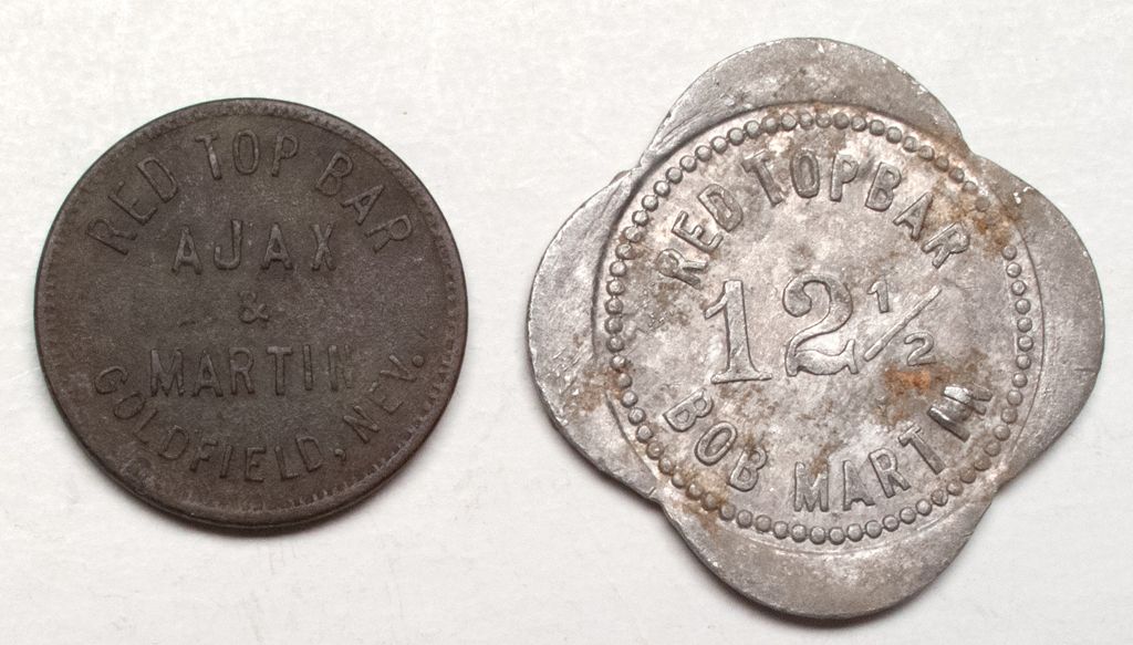 Both of these come from the Red Top in Goldfield, Nevada. 1) Red Top Bar / Ajax & Martin / Goldfield, Nev // GF 6 1/4c IT. Round. Brass. 2) Red Top Bar / 12 1/2c / Bob Martin // 12 1/2c. Scalloped. Aluminum.City: GoldfieldCounty: EsmeraldaState: NVDate: