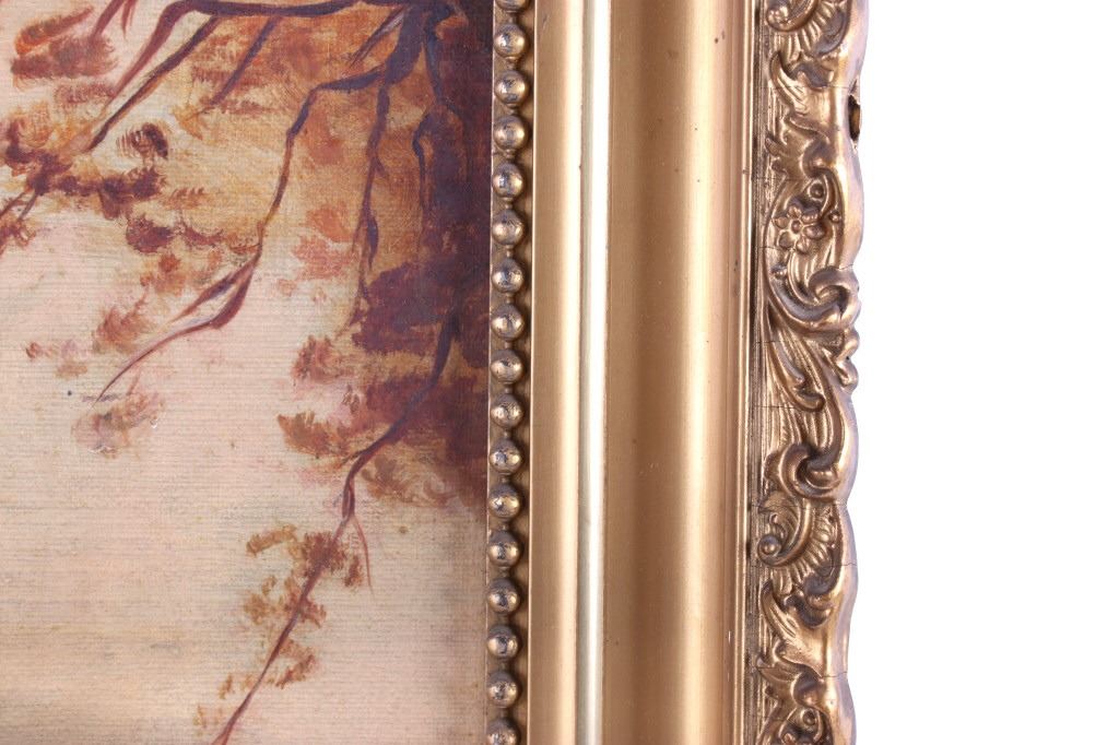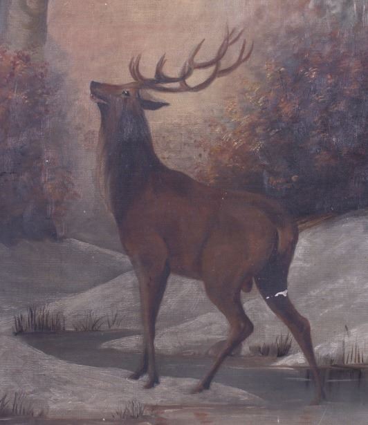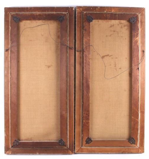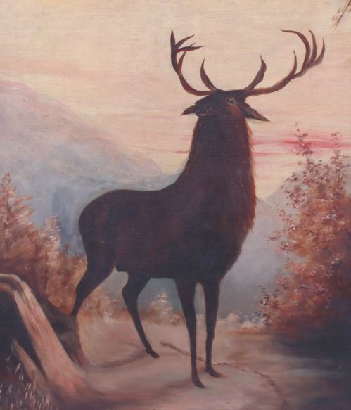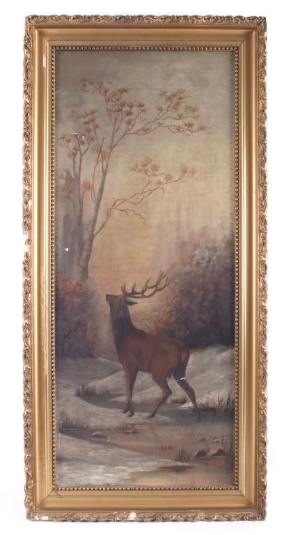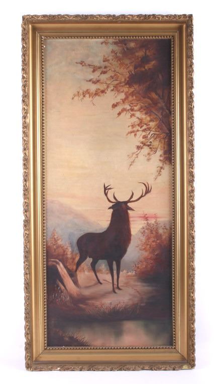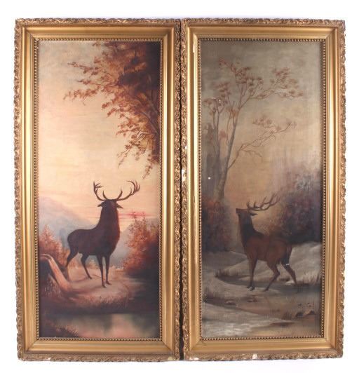 Included for your consideration in this lot is a pair of giclees, of bull elks. One print depicts an elk in the calming forest during sunset, standing regally in a creek. The second print shows a bull elk in a mountainous sunrise scene. Each print is made on canvas, and is framed in an ornate gold filigree frame. The prints themselves show good condition, though the frames have some scattered damage. Each frame measures 40 3/4" tall, and 19 1/4" wide.