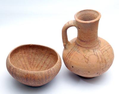 Pair of Canaanite Terracotta Vessels. Consists of: Single handle amphorisikos with red decoration. Height 6½". Together with: Small handle bowl with linear dark red decoration. Height 3", dia. 4½". Both in choice condition. Lot of 2 items.