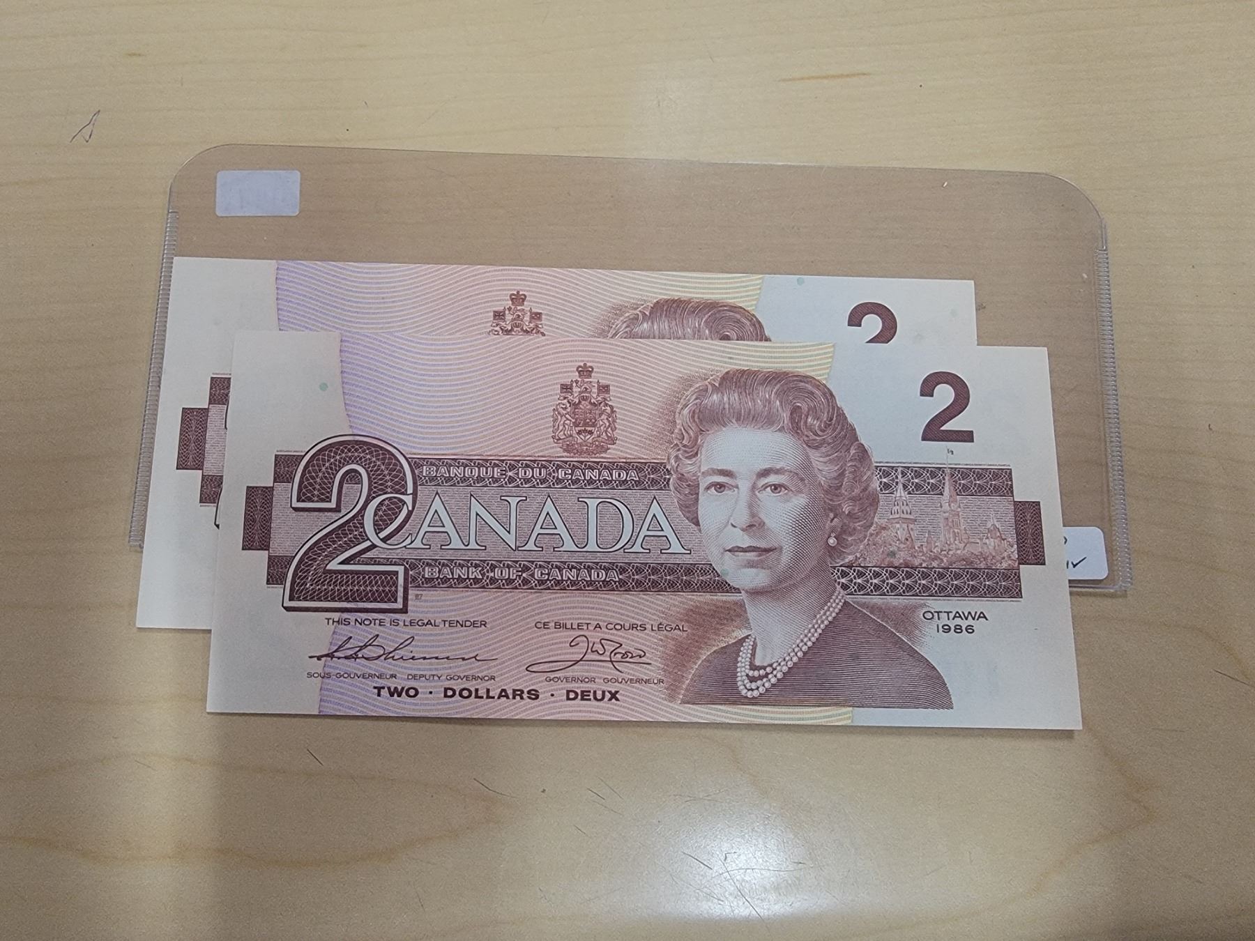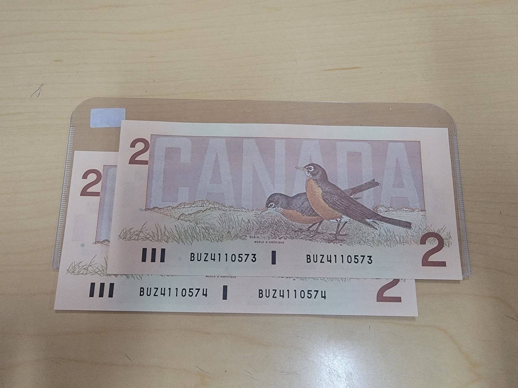 Pair of Canada $2 UNC Bird Series banknotes; Thiessen/Crow (#BUZ 4110574-574)