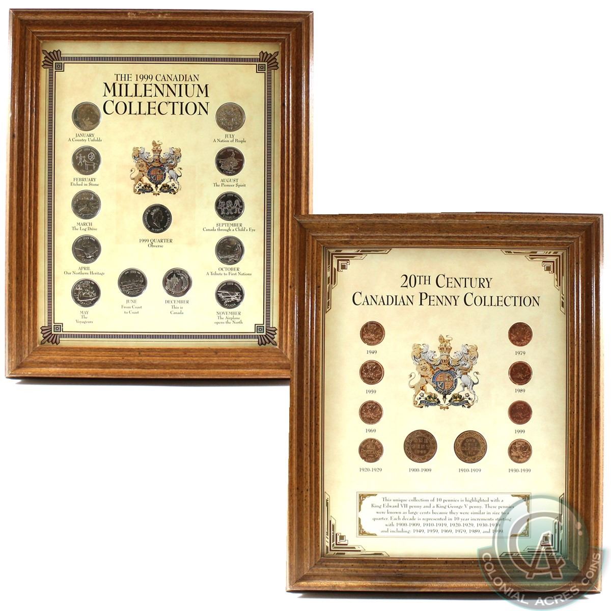 Pair of Canada Coin Sets in Wooden Frames Produced by Heritage Collectables. You will receive "20th Century Canadian Penny Collection" 10-coin Set featuring pennies from 1900-1999 & "The 1999 Canadian Millennium Collection" 13-coin Set featuring the 1999 Millennium 25-cent Series. 2pcs