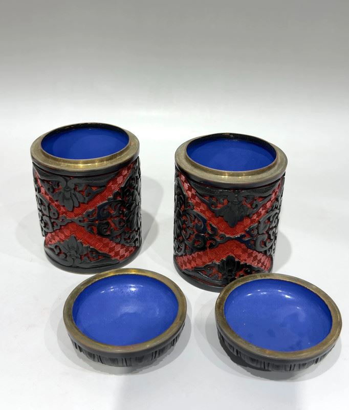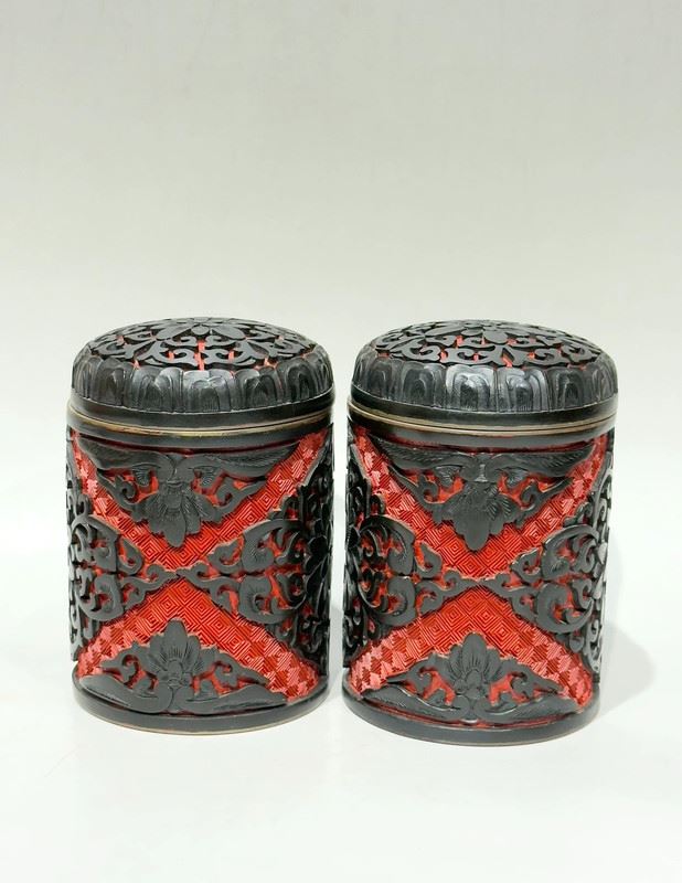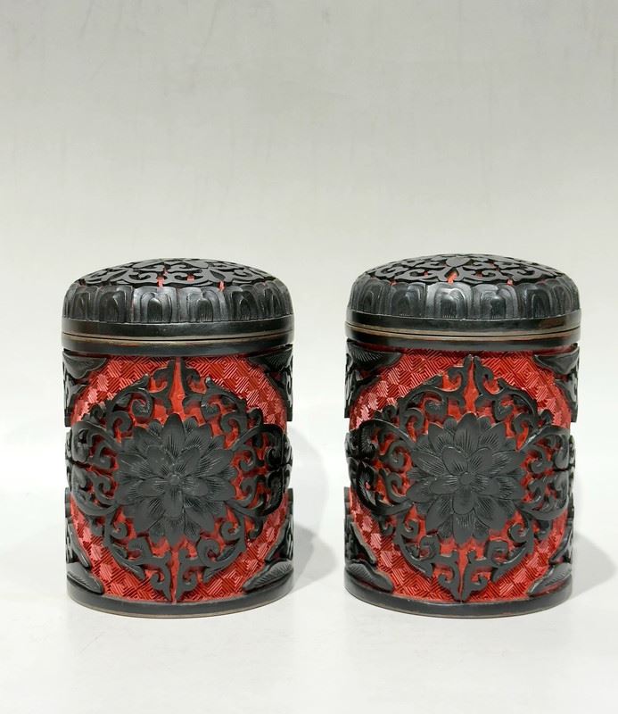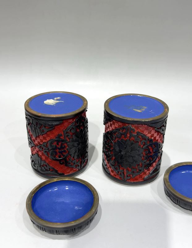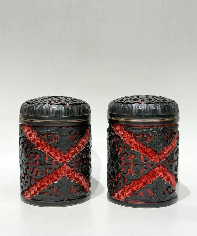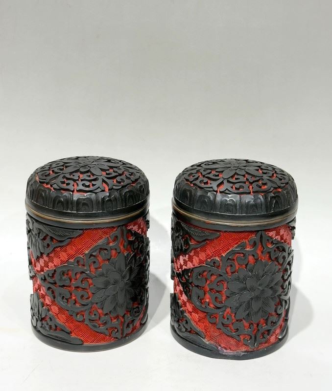 A pair of tea caddies with copper bodies, decorated in the red-and-black carved lacquer technique. The surfaces are richly adorned with scrolling floral and foliate motifs, demonstrating layered carving and striking color contrast between red and black lacquer. The form is elegant and balanced, with the rarity of being preserved as a pair. Carved lacquer, renowned for its labor-intensive process of building up and carving through multiple layers of lacquer, was highly prized from the Ming through the Republic period. These caddies serve both as functional tea containers and as fine collectible artworks.