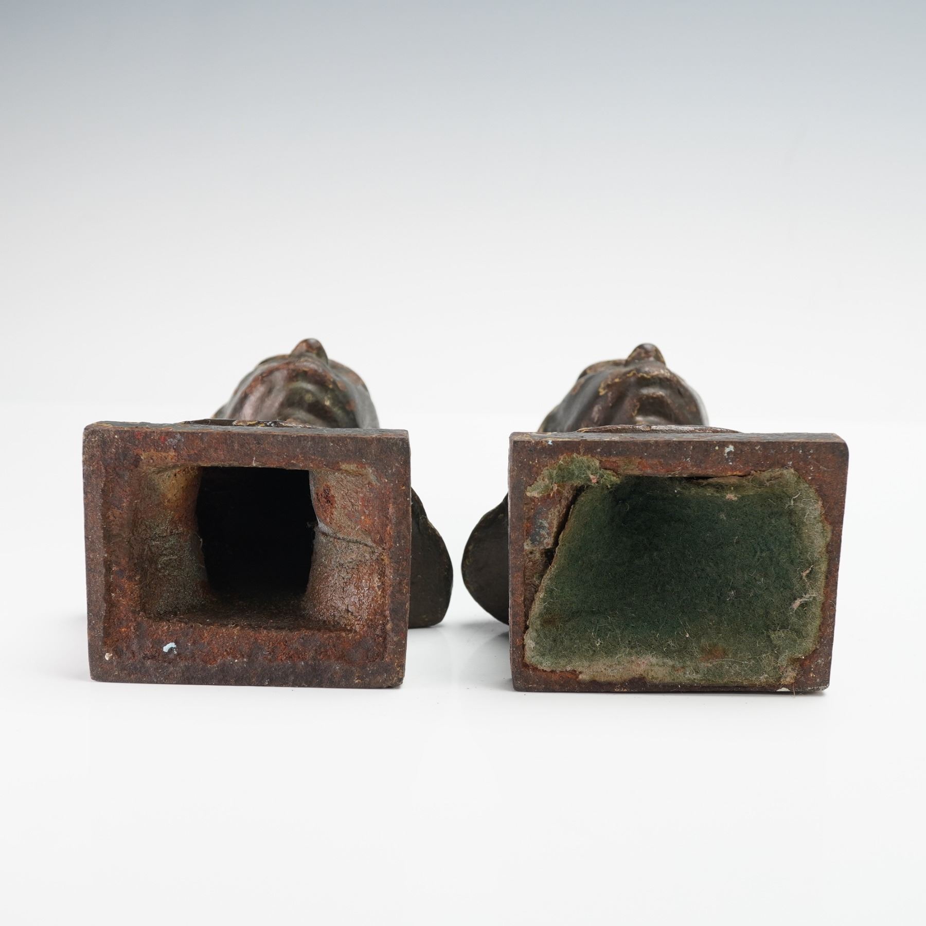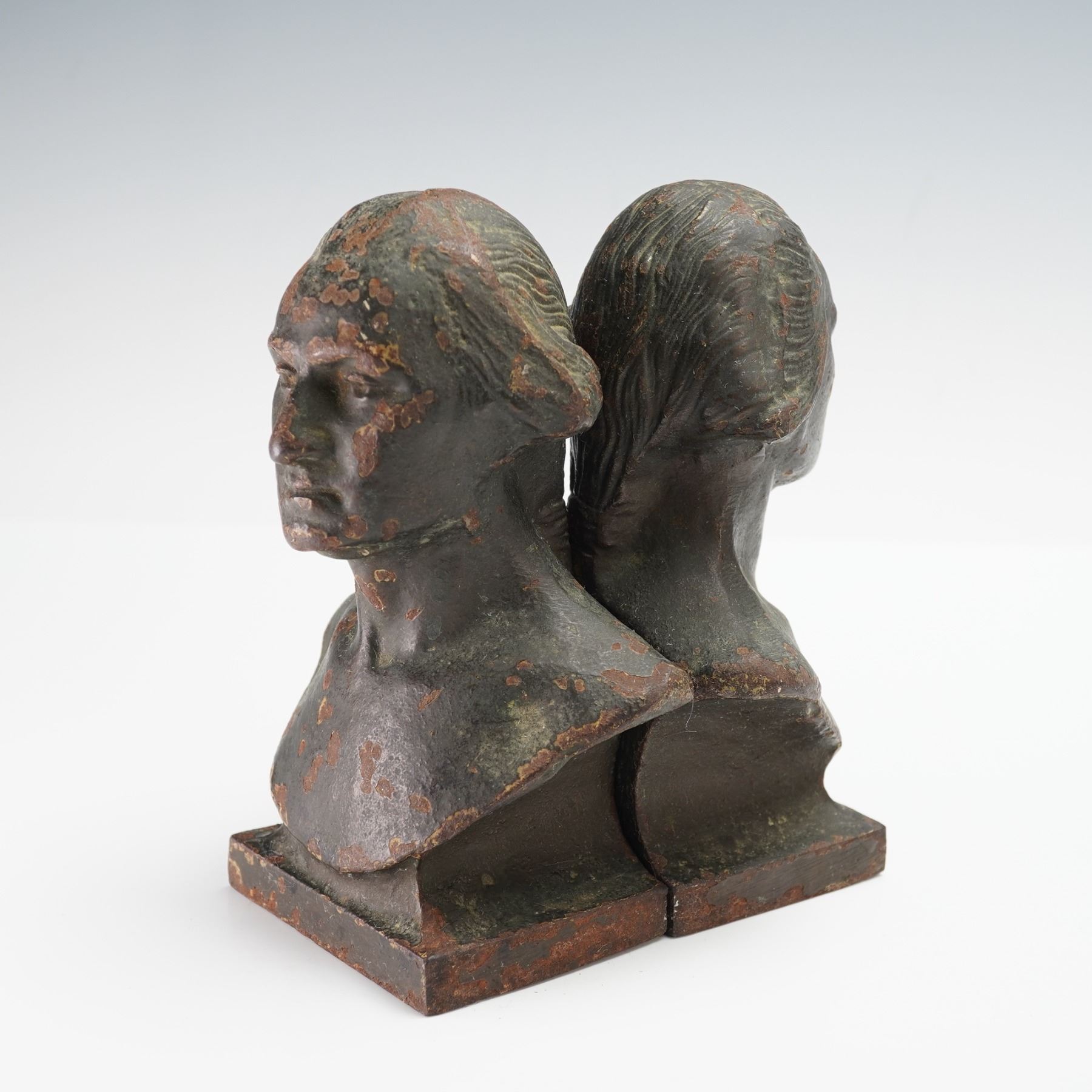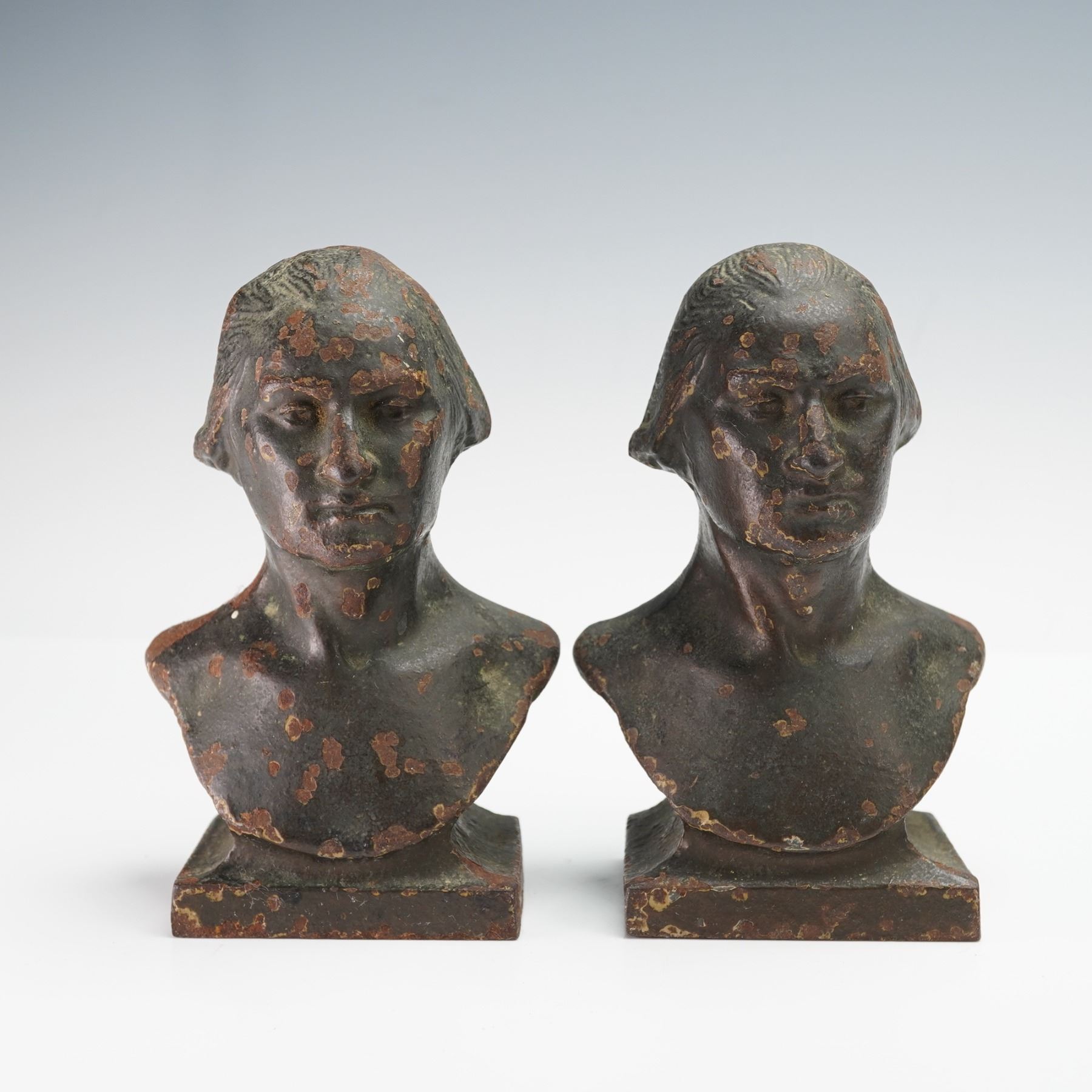 Pair of early 20th century cast iron bookends depicting George Washington, each modeled as a classical bust with square plinth bases. The figures feature well-defined facial detail and a dark bronze finish. Sturdy and substantial in weight, these patriotic bookends offer a timeless decorative touch for a traditional library or Americana collection. Weights: 8 lb.