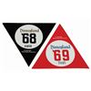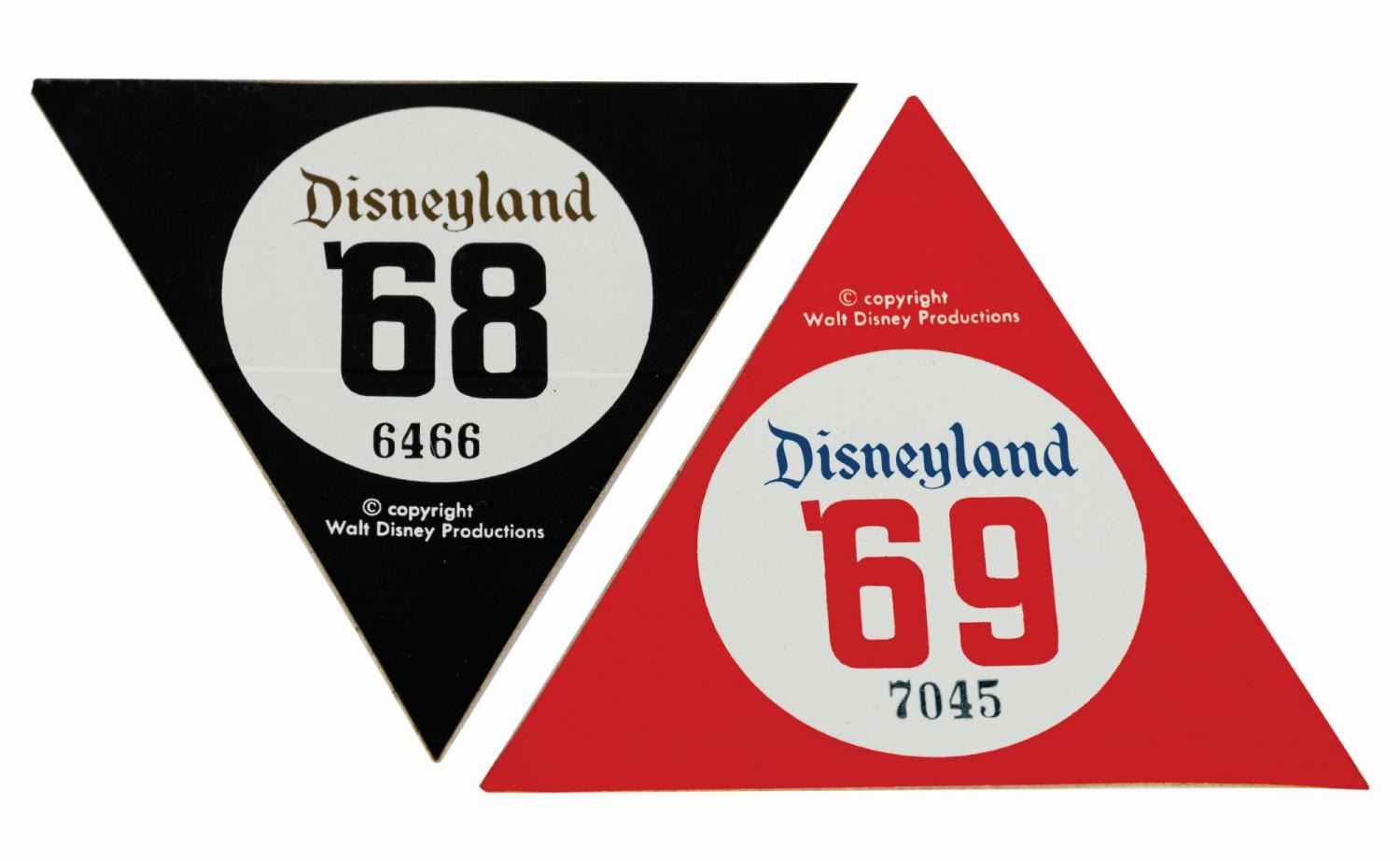 (Disneyland, 1968/69) A pair of Disneyland cast member parking permit stickers. One is marked for '68 and the other for '69, and they are numbered "6466" and "7045," respectively. The 3.5"x4" stickers are unused and remain in good condition, with some edge-wear from age.