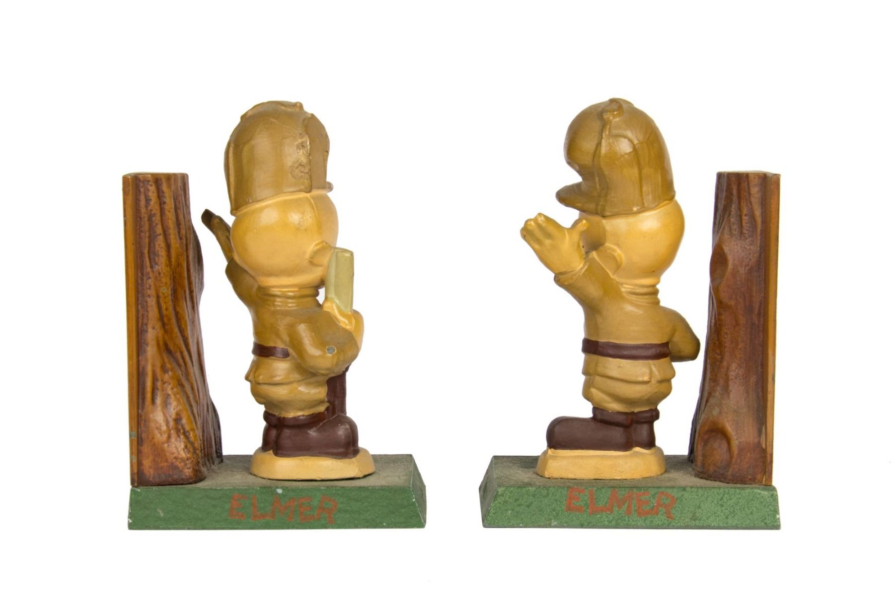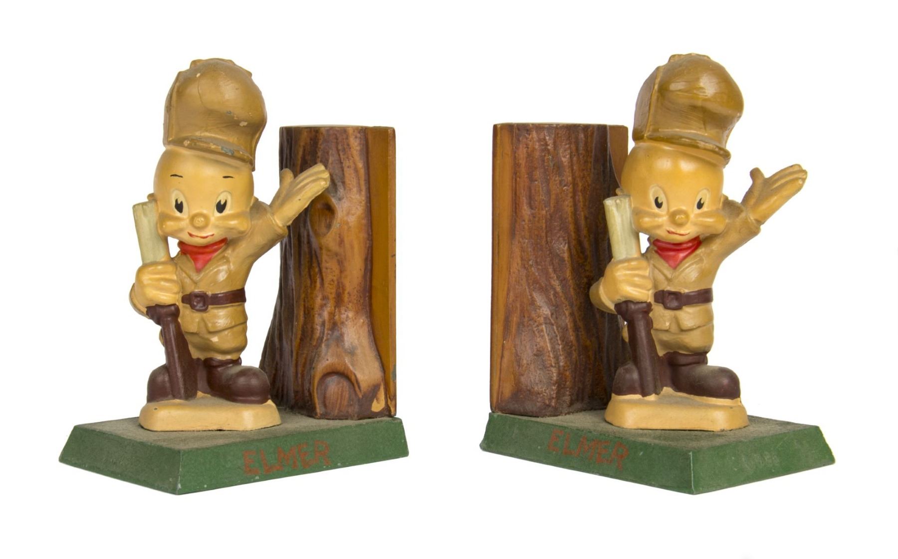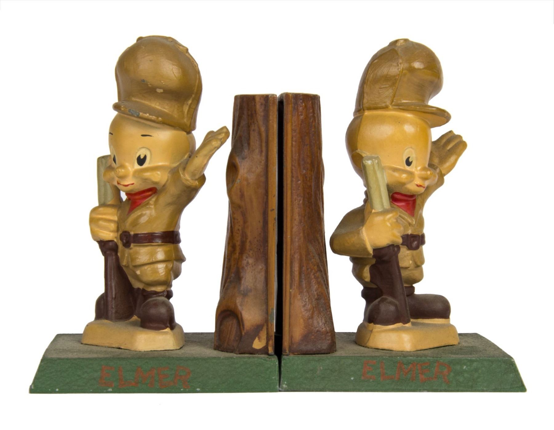 (Warner Bros, c.1940s-50s) A pair of painted cast metal bookends featuring Elmer Fudd from Warner Bros' "Looney Tunes" and Merrie Melodies" series. The figures of Elmer Fudd depict him in his hunting attire with rifle, and the green bases have his name on both sides. Both bookends measure 3"x3.75" and 5.5" tall, and the pair is in very good condition overall with some chips in the paint and minor spots of wear from previous display.