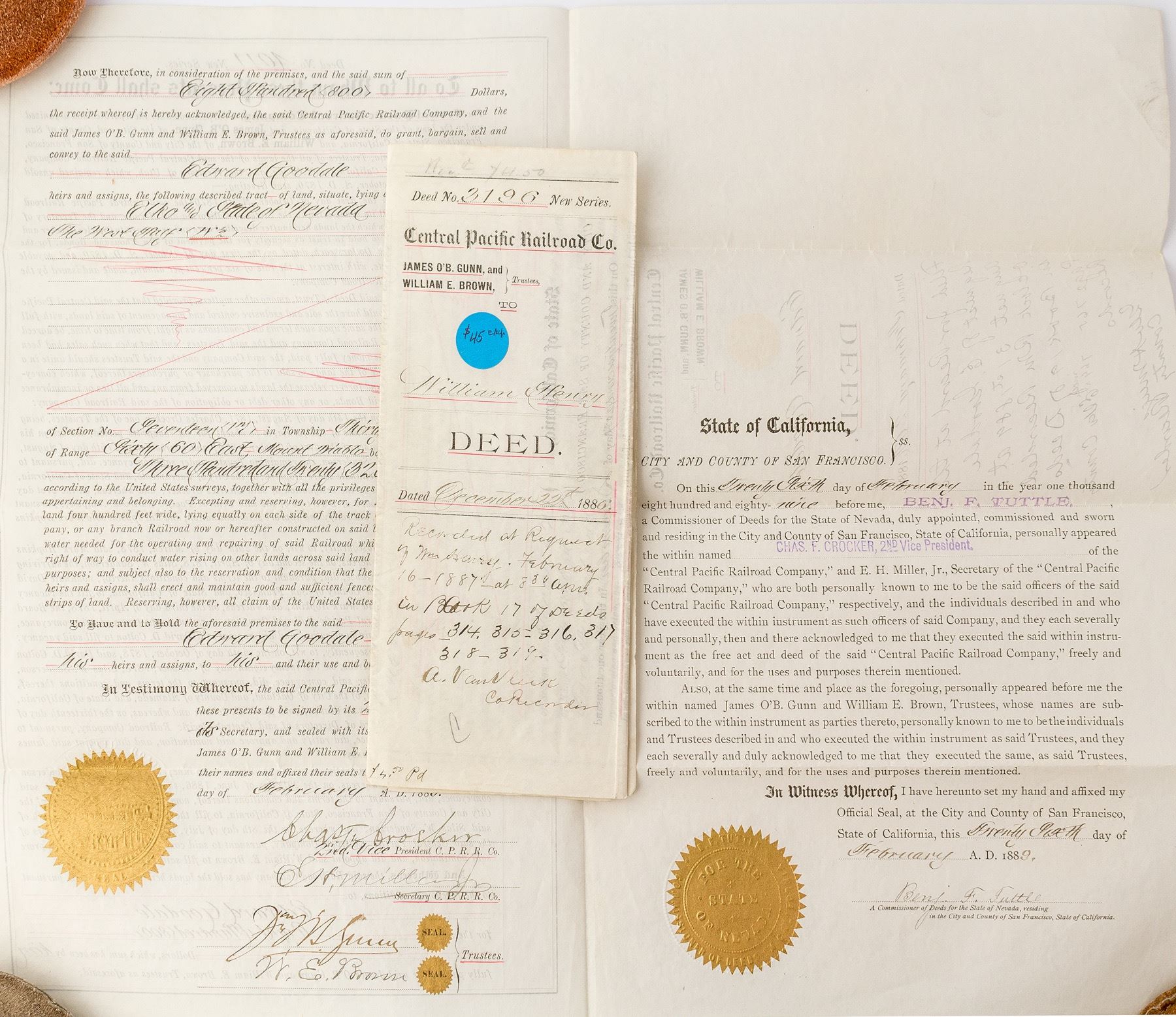 1) Transferring land to William Henry of Elko in 1870. The 1880 census has William Henry living on his CPRR land in Star Valley. 2) Transferring land to Henry Goodale of Elko in 1870. The Goodale's also had a ranch in Star Valley. The CPRR was completed in 1869 and these were very early deeds to these two farmers would have been among the very first to acquire railroad land in Elko County. State: Nevada City: Star Valley HWAC#: 48129 Date: 1870