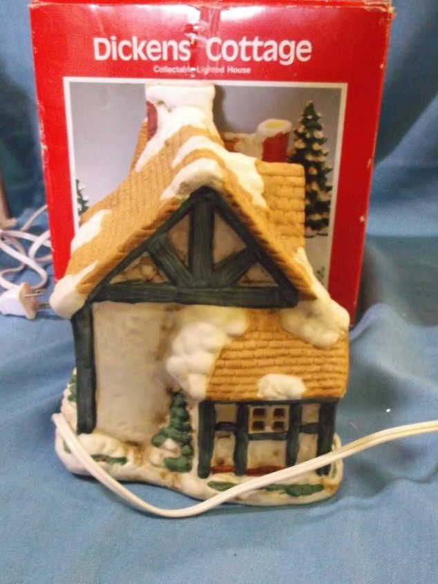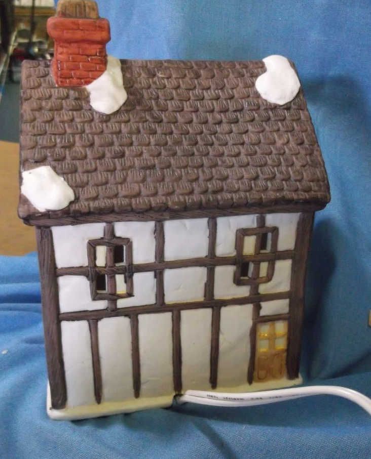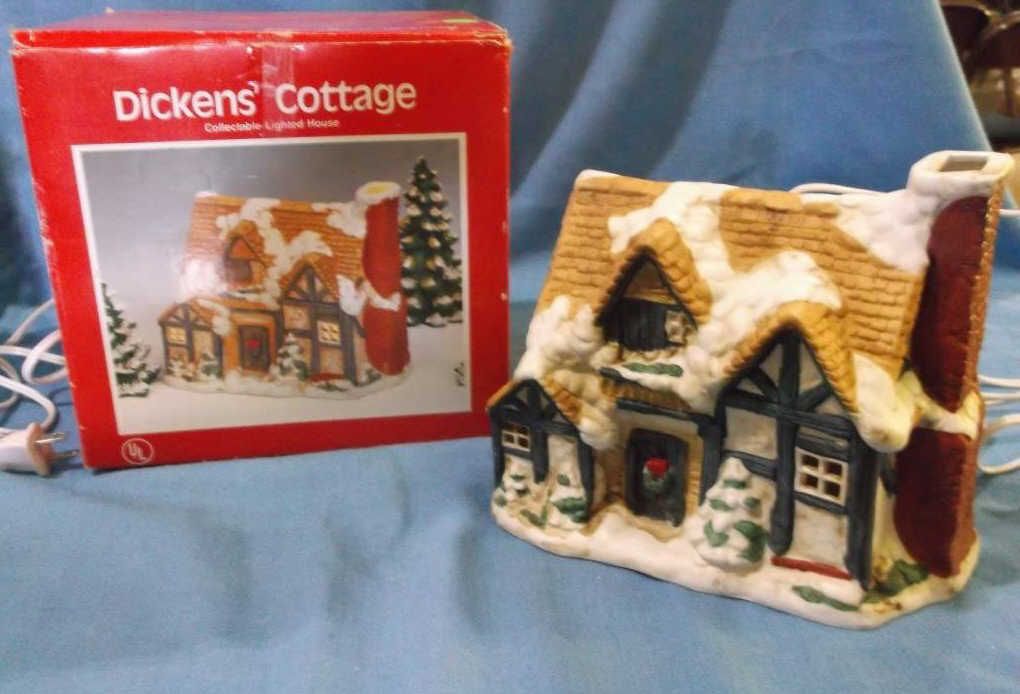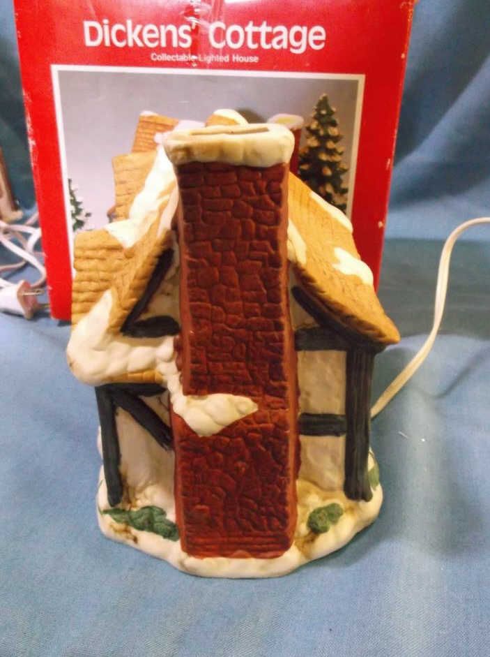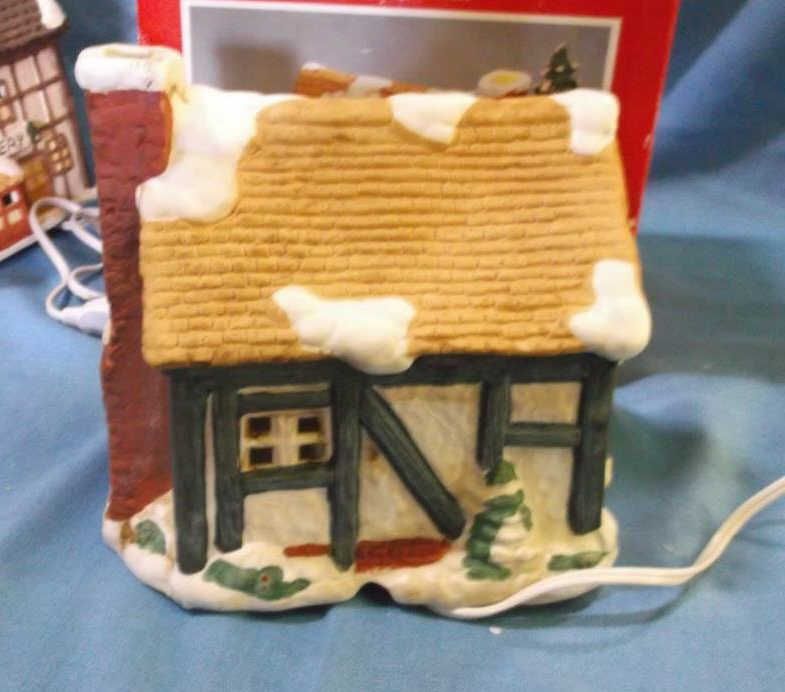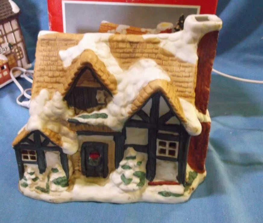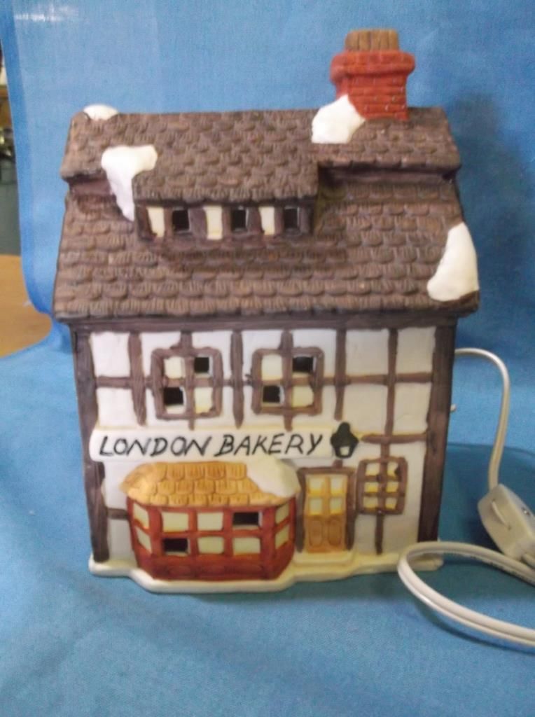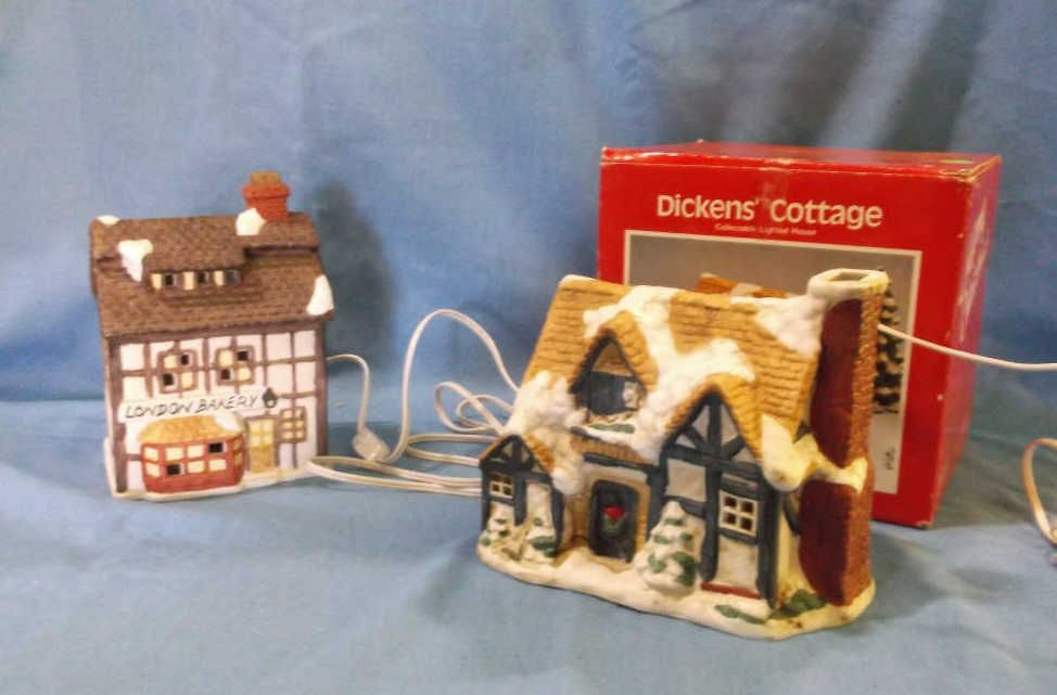 Dickens Cottage Lighted House approx 8" x 7" & in box London Bakery 6" x 8" lighted House. does not have original box but we do have a box for it.....