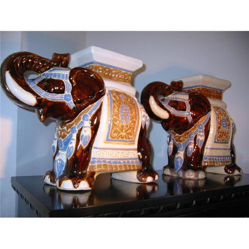 pair of attractive and gorgious elephants of ceramic with my favorite color accented with white blue and brown. they are attractive,functional considered to be design sculptures. decorative idea : would make beautiful table, if topped w glass. each measures 15 " T- 19 " W. they are asian or indian style. they are in very good condition w few imperfections. they are not new and perhaps vintage. part of my home collections!!