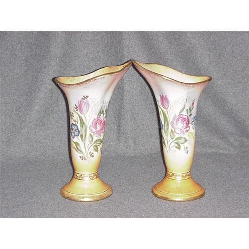 Pair of ceramic vases 12" tall x 7" wide x 4 3/4" diameter at base. Transfer decoration. Marked 712