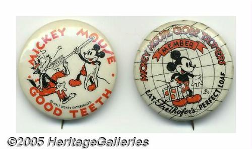 <B>Pair of Charming 1930s Mickey Mouse Pinbacks</B></I> The first item is a 1937 "Mickey Mouse Globe Trotters" membership pin issued as a premium for Freihofer's Perfect Loaf Bread Company. It still has its cardboard liner with Mickey and "Copyright Walt Disney Productions." The next pin is also from the late 1930s and shows Mickey beating up the Big Bad Wolf with a toothbrush and proclaims Mickey Mouse/Good Teeth. The liner states that it was distributed by the American Dental Association. Both pins are 1.25" in diameter and in clean, bright condition. The latter example is a quite scarce variety. Lot:253