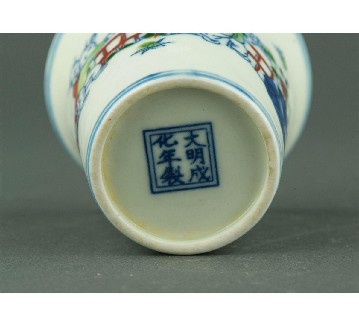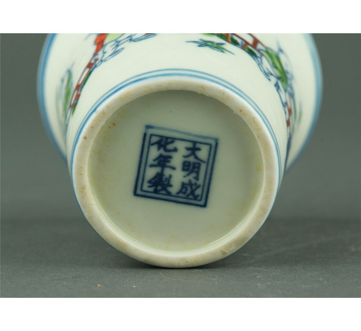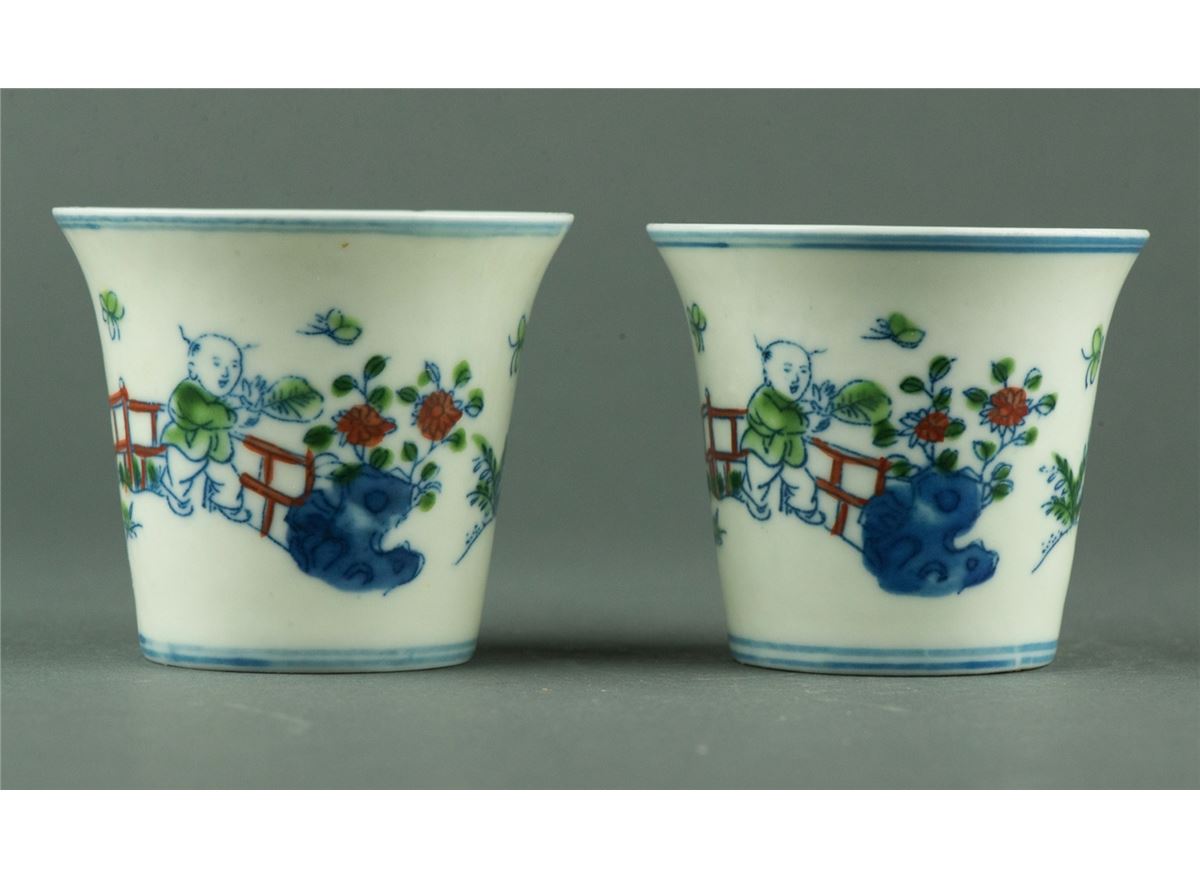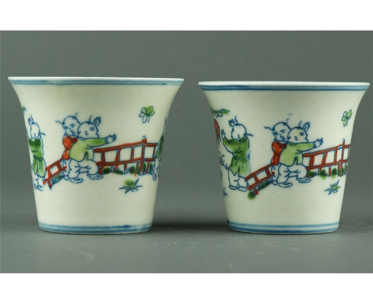 Pair of Chinese porcelain wine cups, of cylindrical shape with flaring rims, painted with continuous scenes of children at play on body. Bottom marked six characters Ming Chenghua mark. (1/2) H: 7 cm, D: 6 cm, 68 grams. (2/2) H: 5 cm, D: 10 cm, 95 grams.