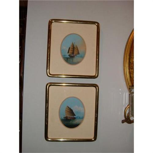 A pair of fine quality China trade oils on panel of Chinese junks in full sail off of China coast. Some minor wear to panels.