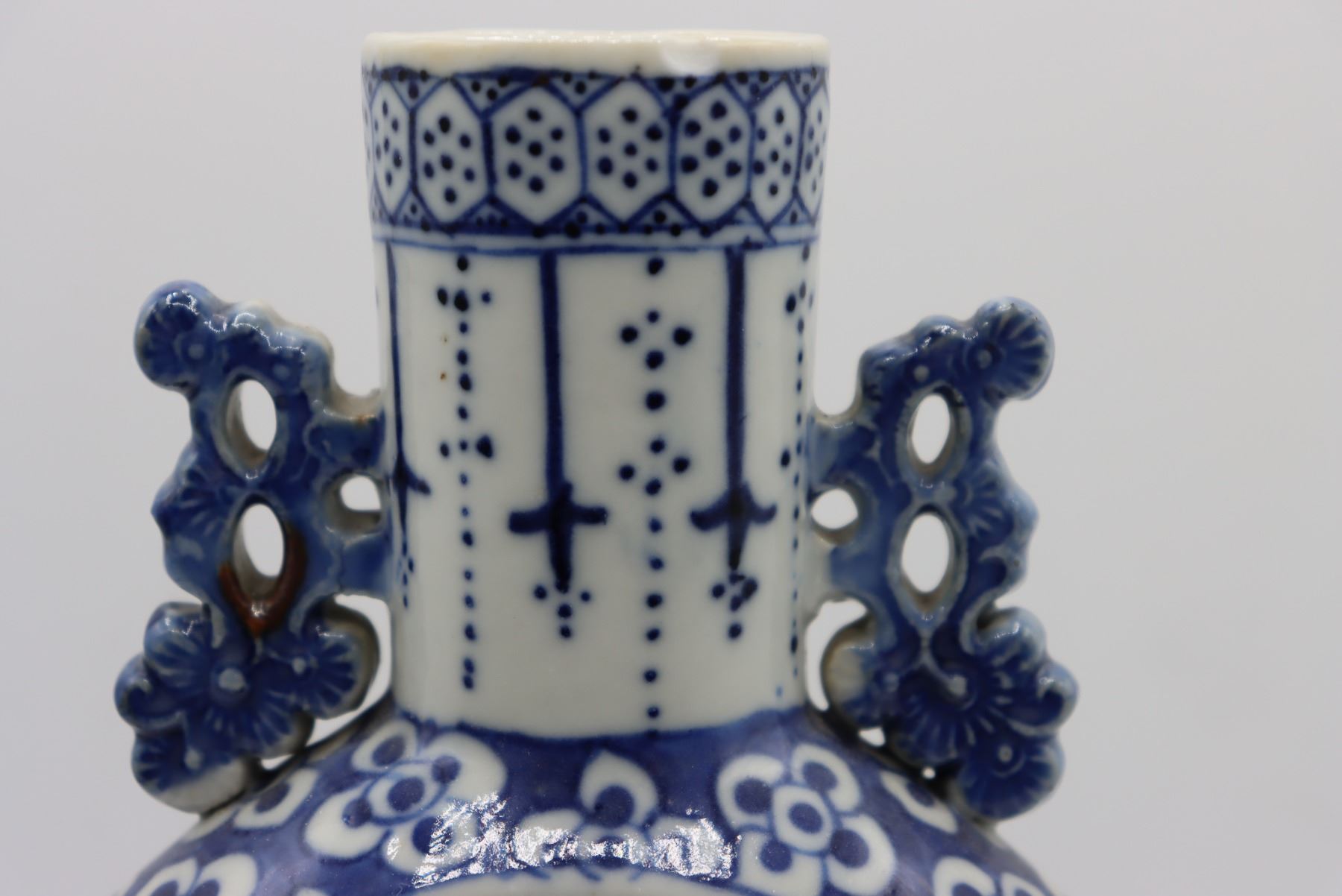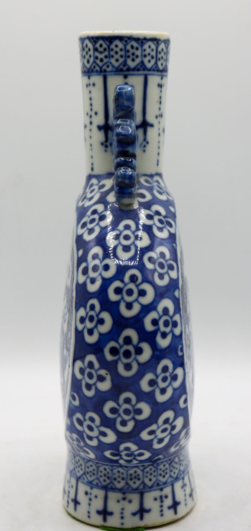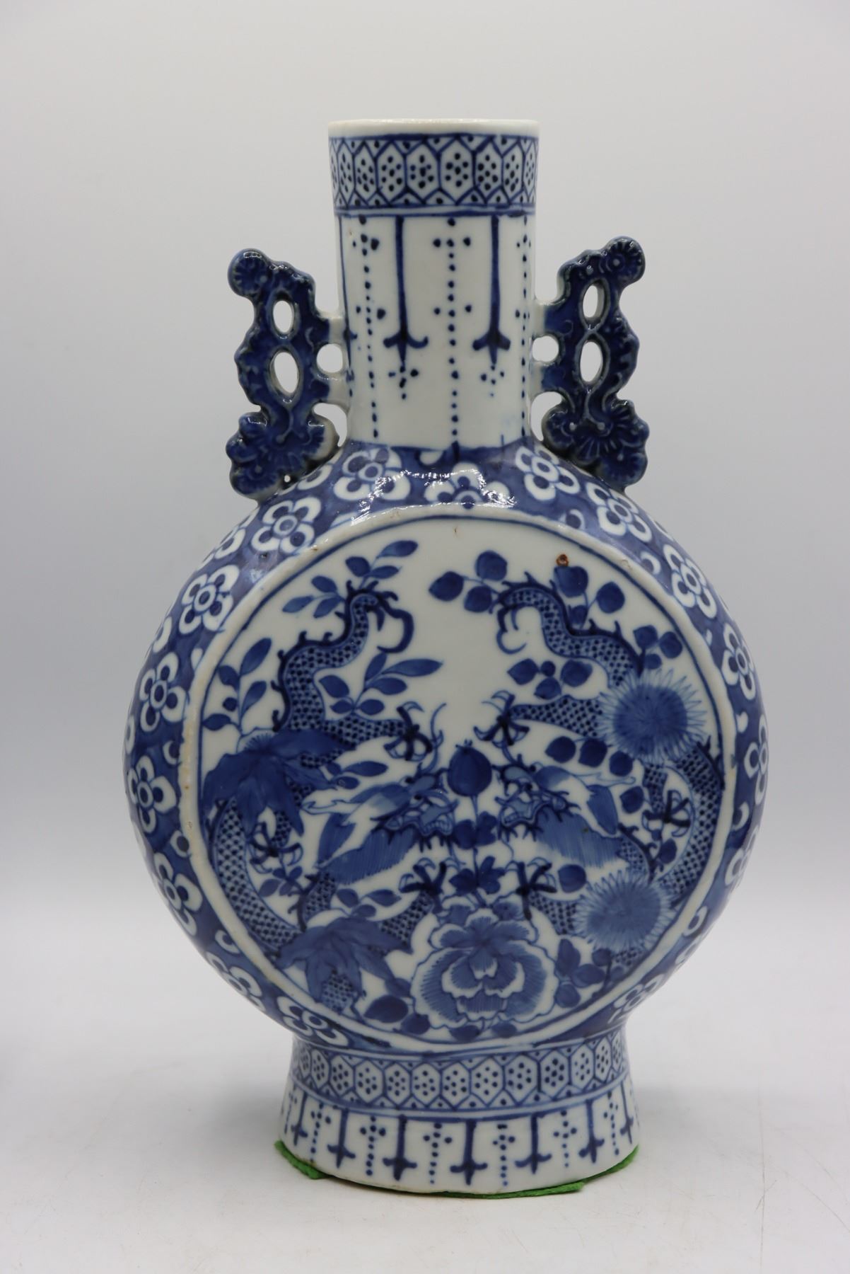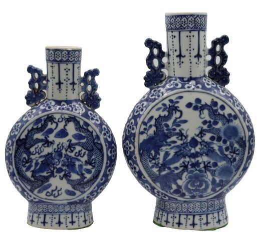 Pair of Chinese blue and white porcelain vases. Round bodies, with cylinder necks, two handles on the sides. Scenes of florals and branches.