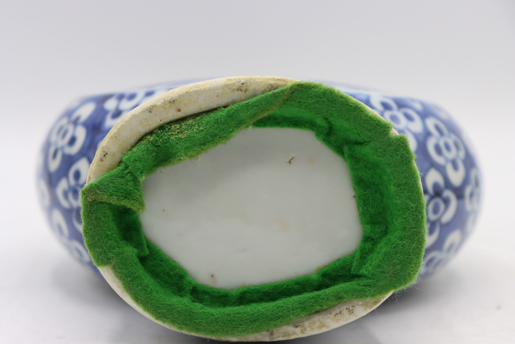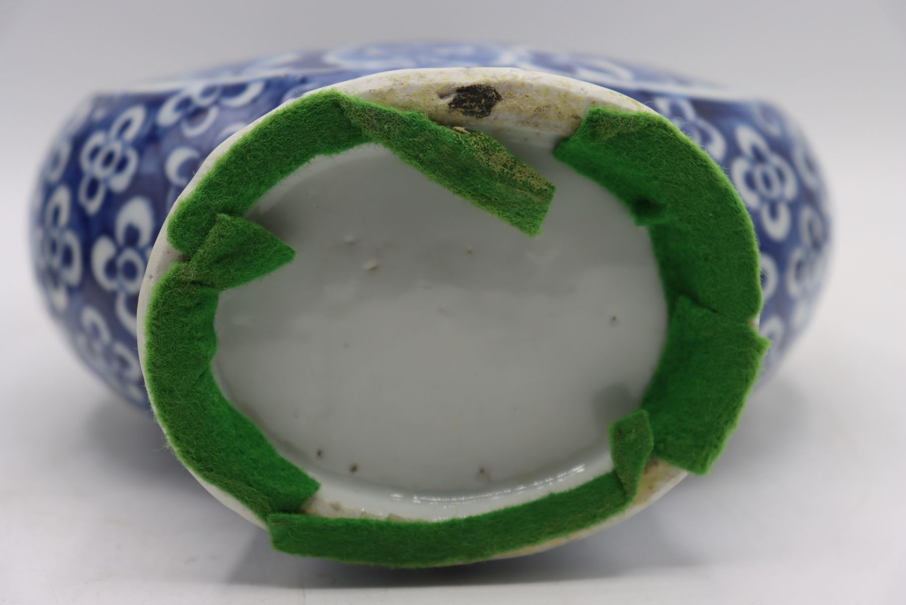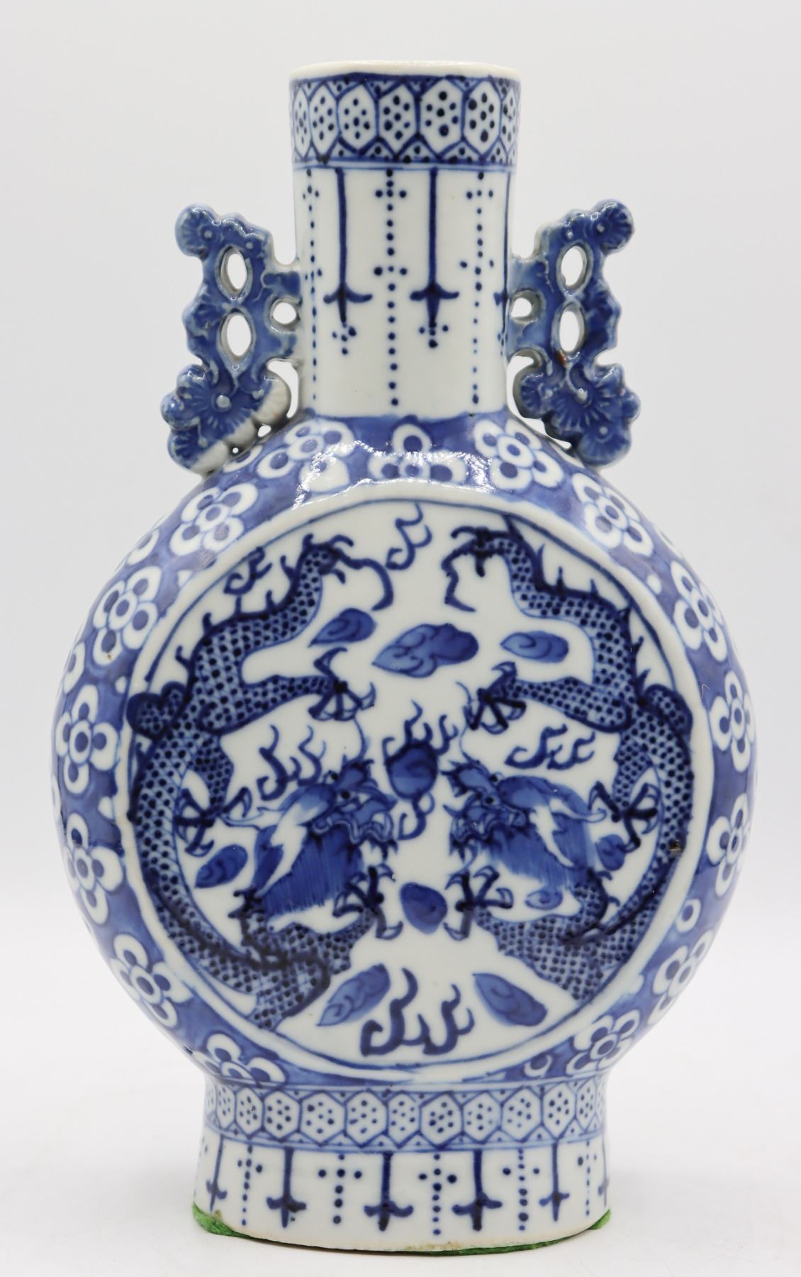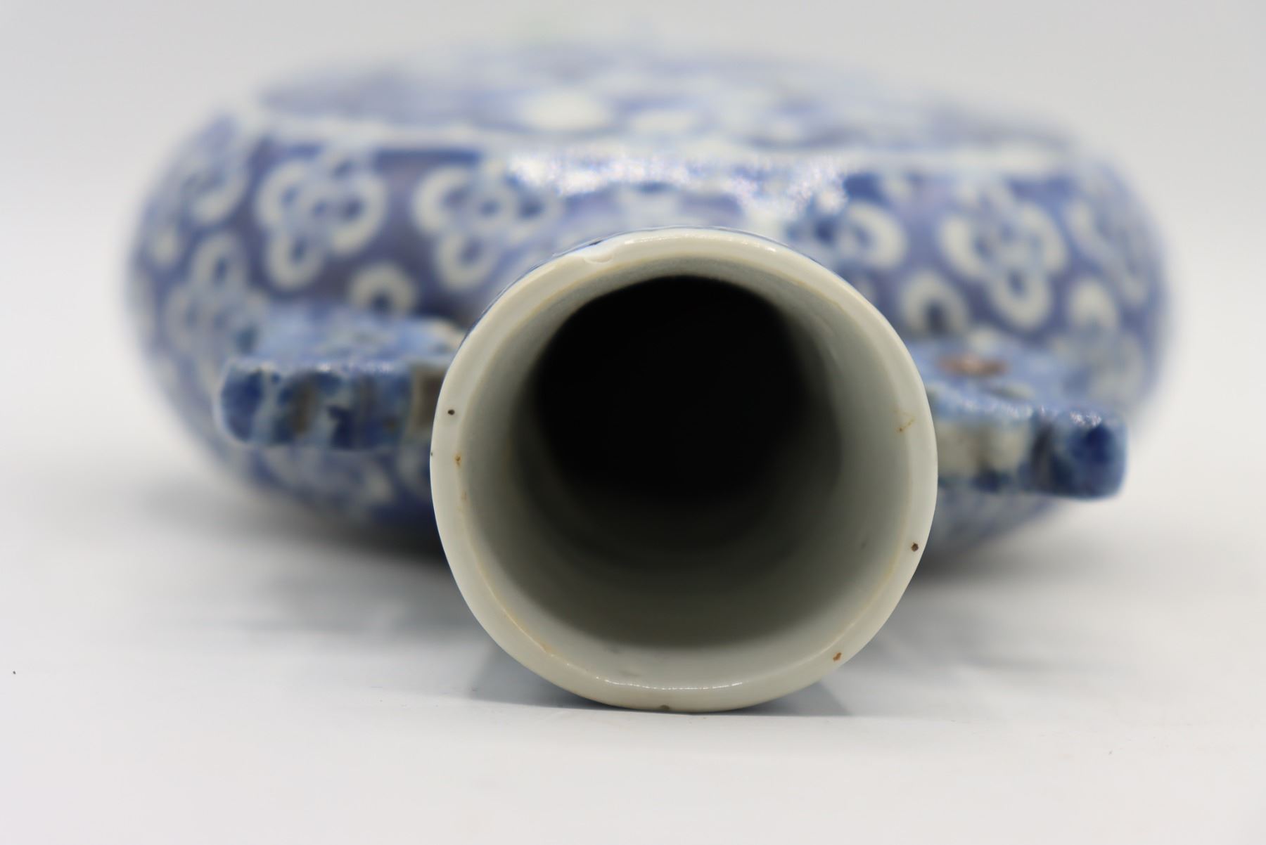 Pair of Chinese blue and white porcelain vases. Round bodies, with cylinder necks, two handles on the sides. Scenes of florals and branches.