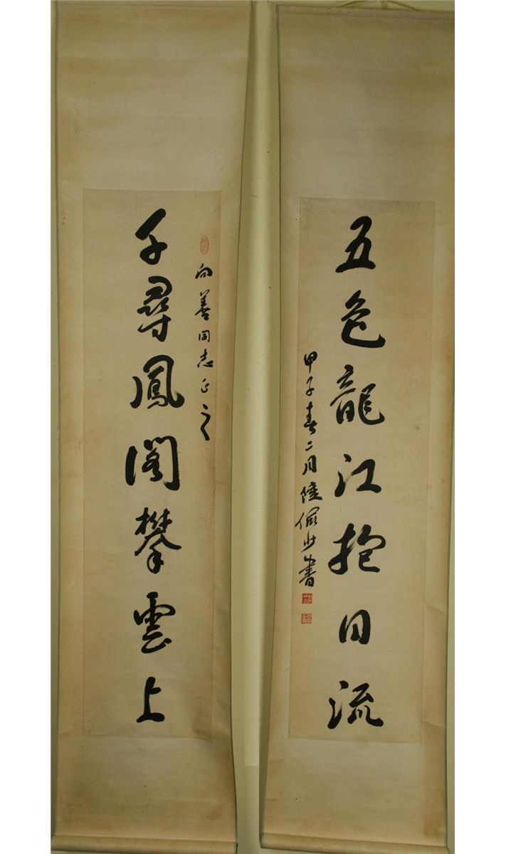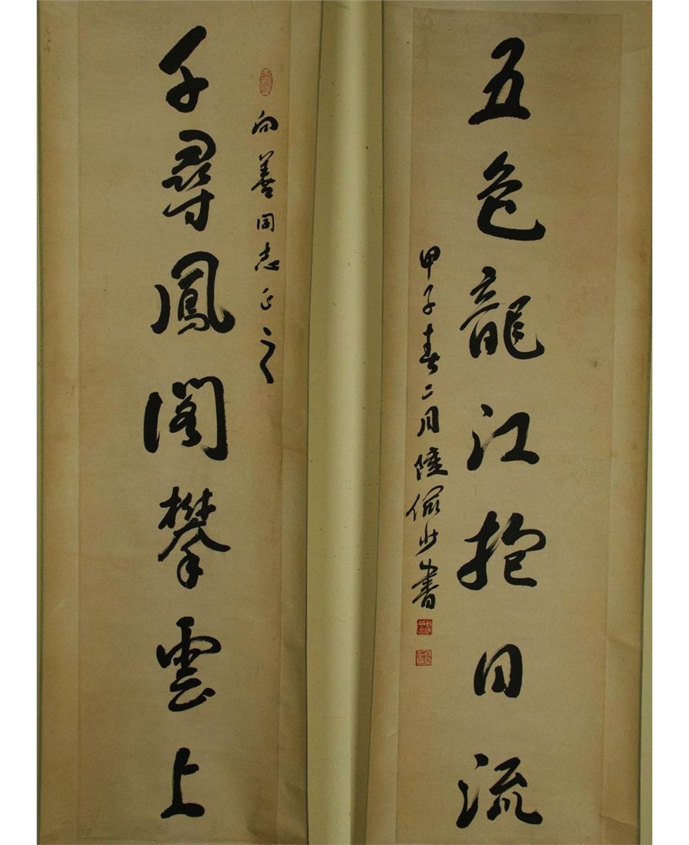 Chinese calligraphy, pair of hanging scrolls, Chinese ink on paper signed Lu Yan Shao (1909-1993) with two red seals; 133 cm x 33 cm.