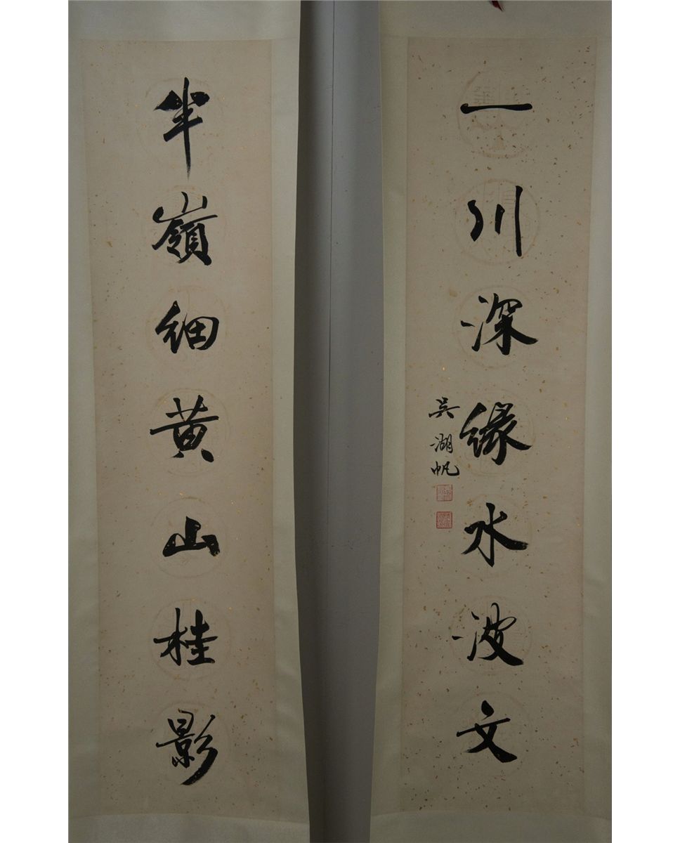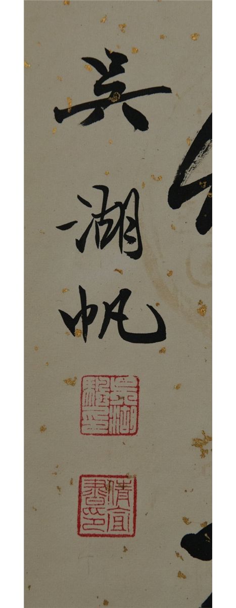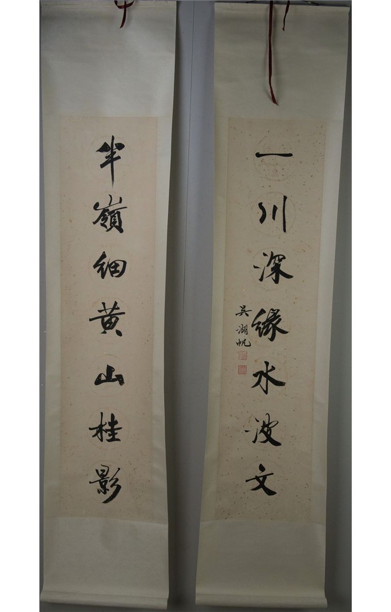 Chinese calligraphy, pair of hanging scrolls, Chinese ink on paper with gold flecks, signed Wu Hu Fan (1894-1968) with two red seals. 31 cm x 130 cm.
