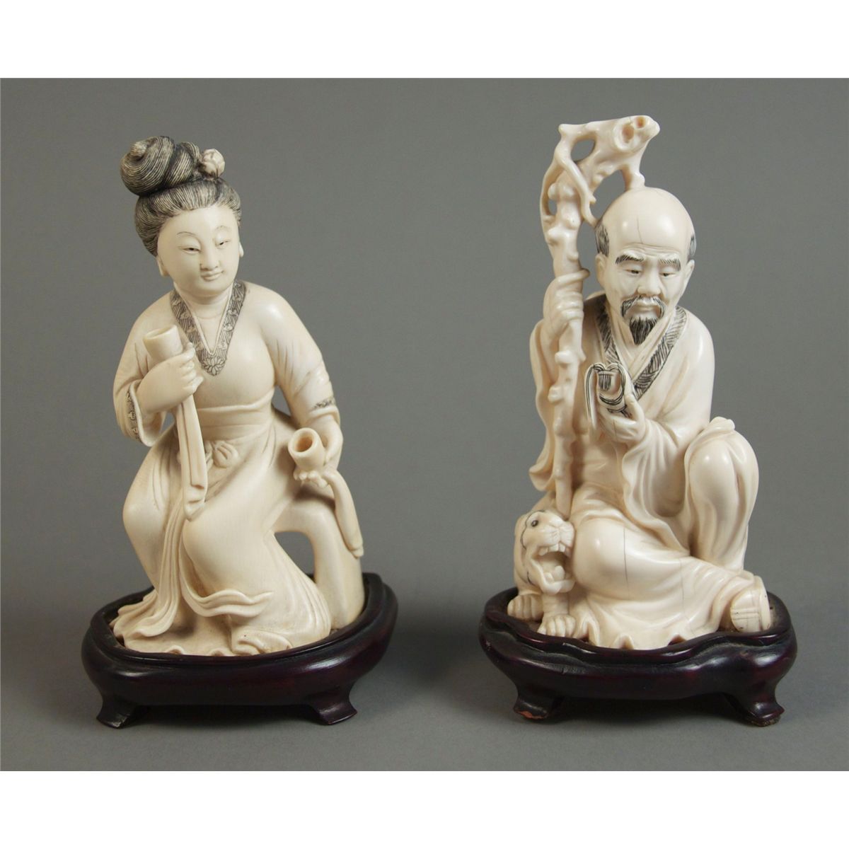 Pair of Chinese Carved Ivory Figures. Each is: [13.3 (oz), 7 (in), 3.5 (in), 3 (in)]