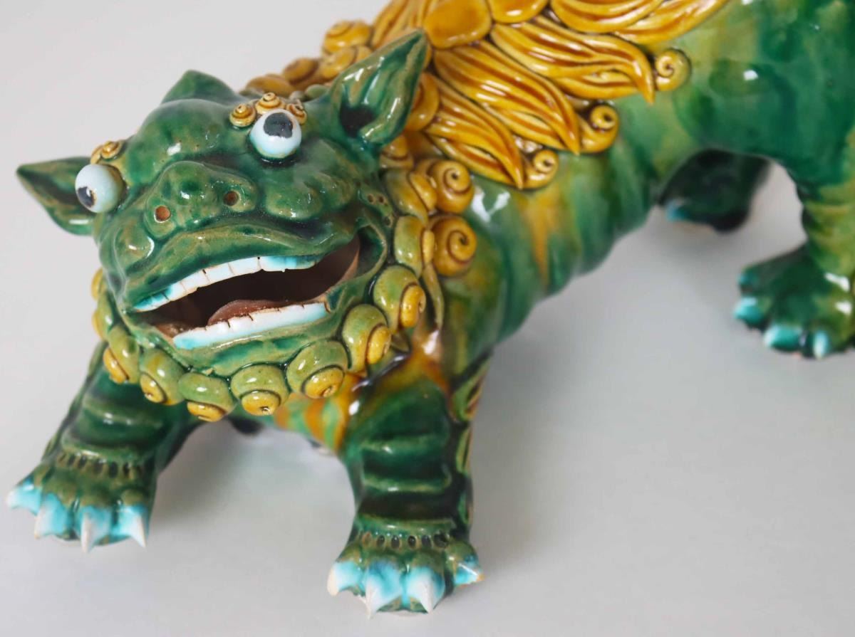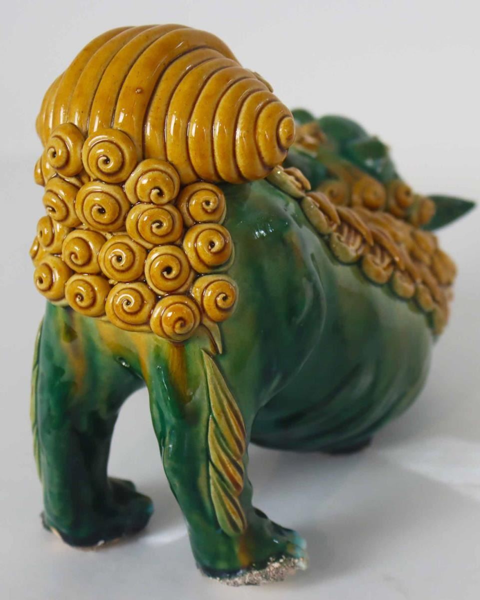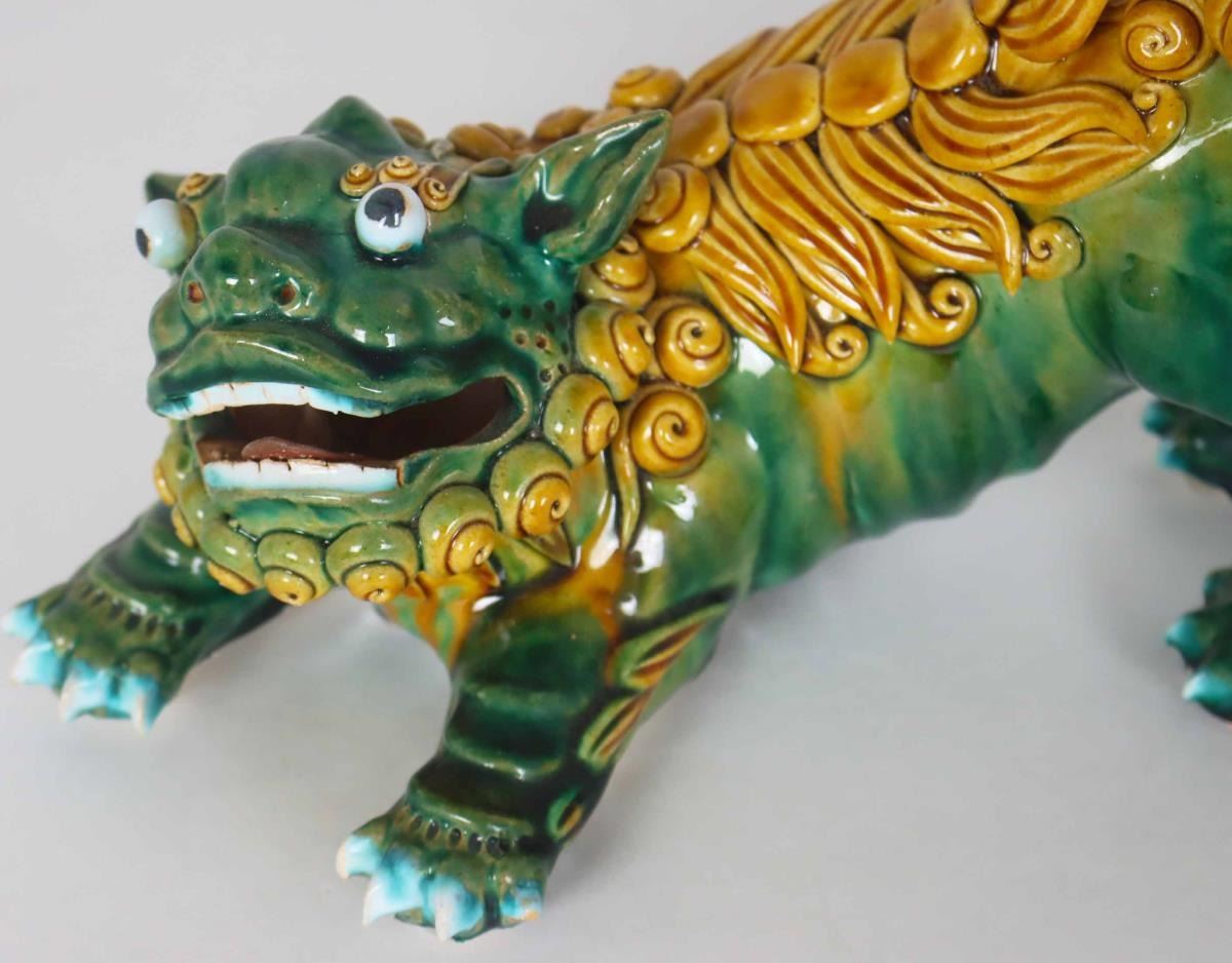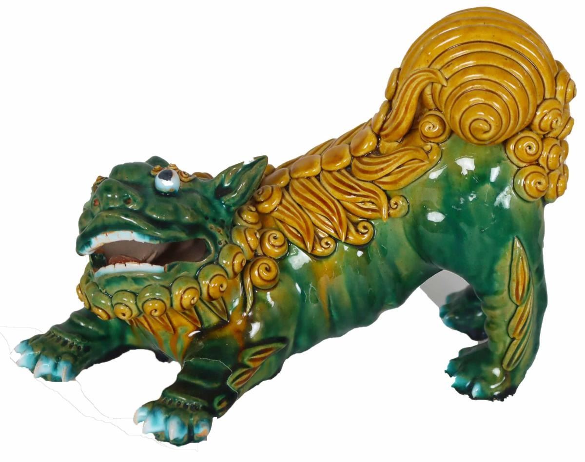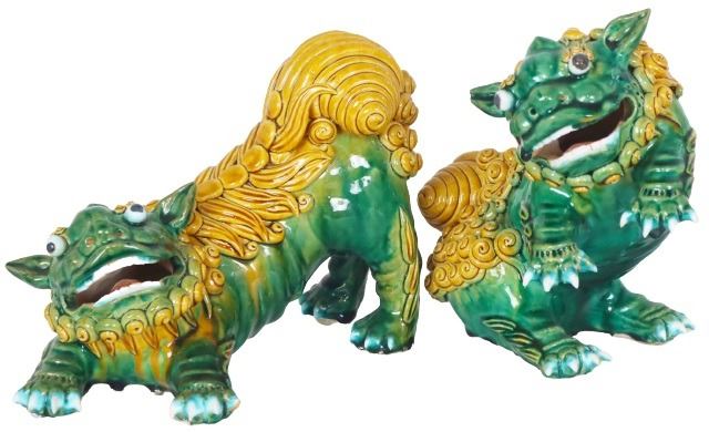 Two expressive ceramic foo dogs, brightly glazed in green and yellow ochre, hollow mouths opened.