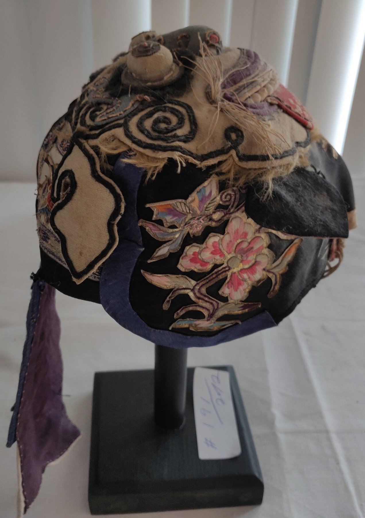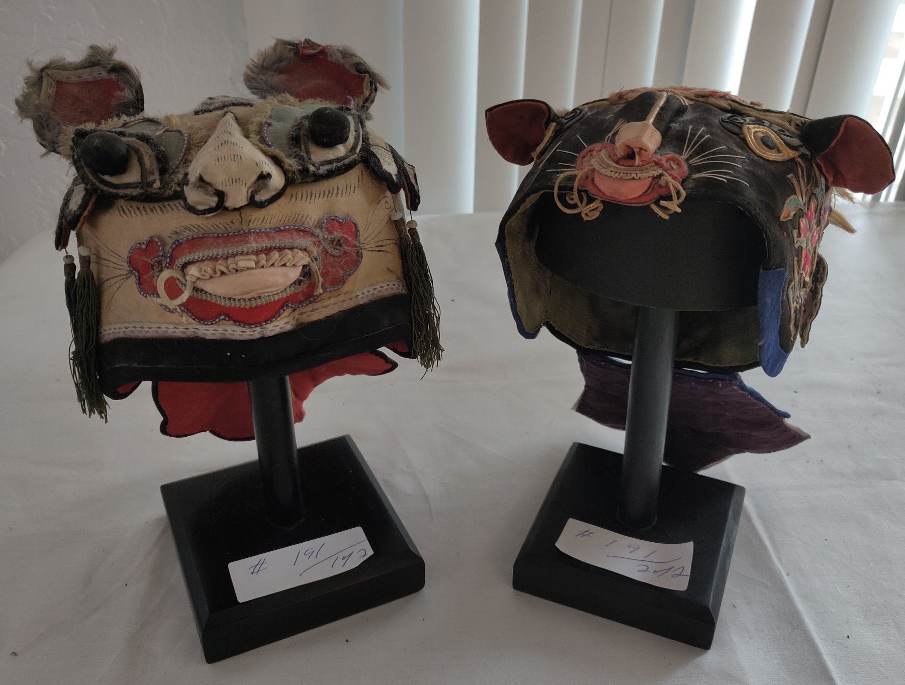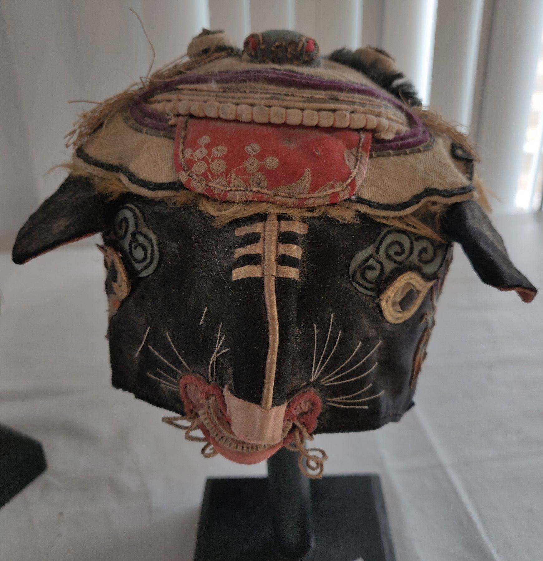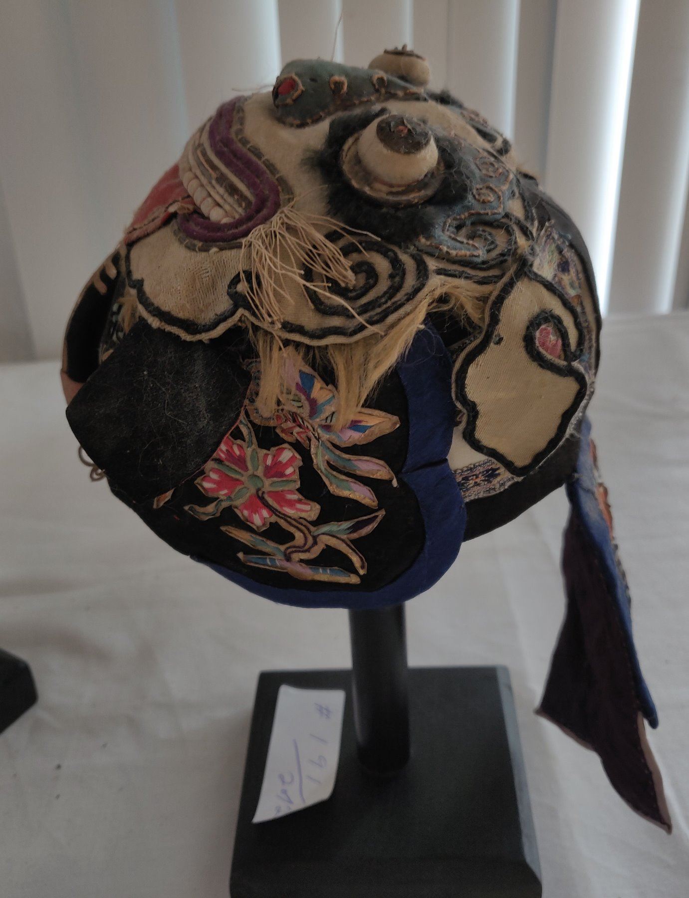 Pair of Chinese Child's Caps, c. 1890s. Made of silk, the items measure approx. 8" x 5" x 5". Early Chinese. Worn to keep evil spirits away from children, stands included. Condition: Some wear, see images. Shipping: $26.50 w/insurance and signature, due to value and size.
