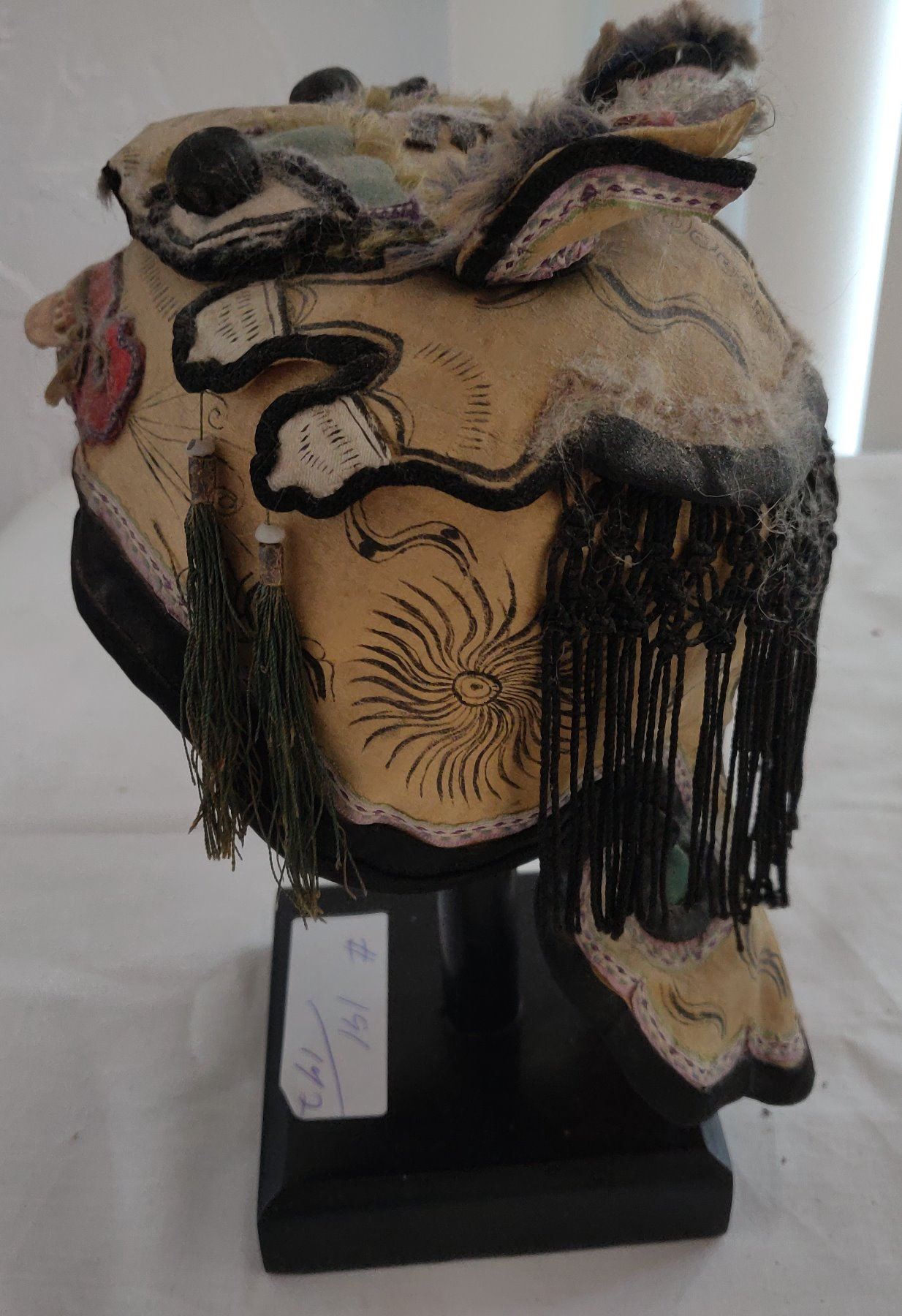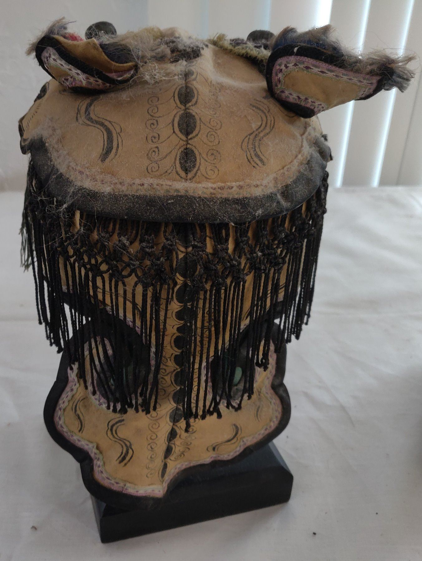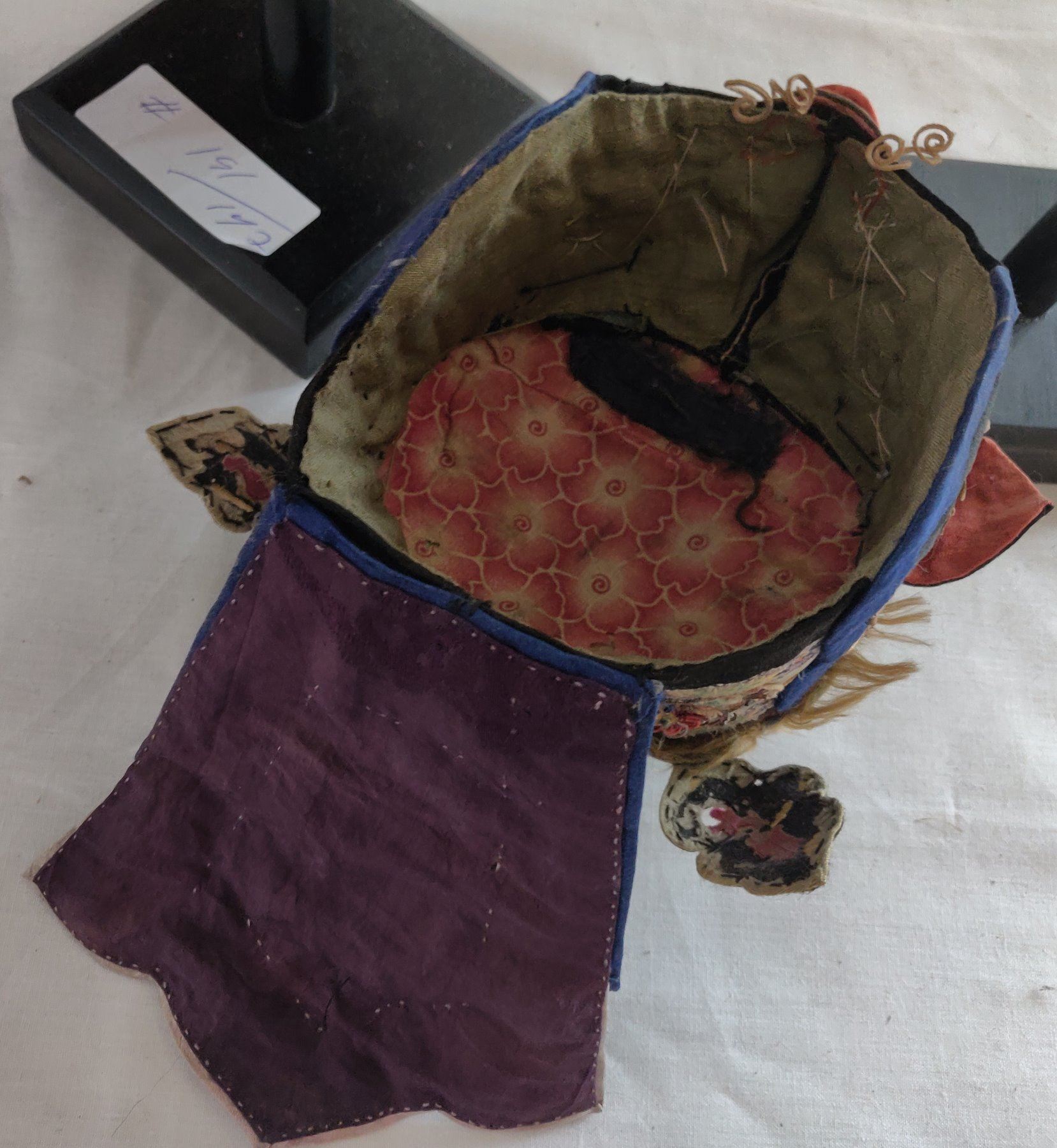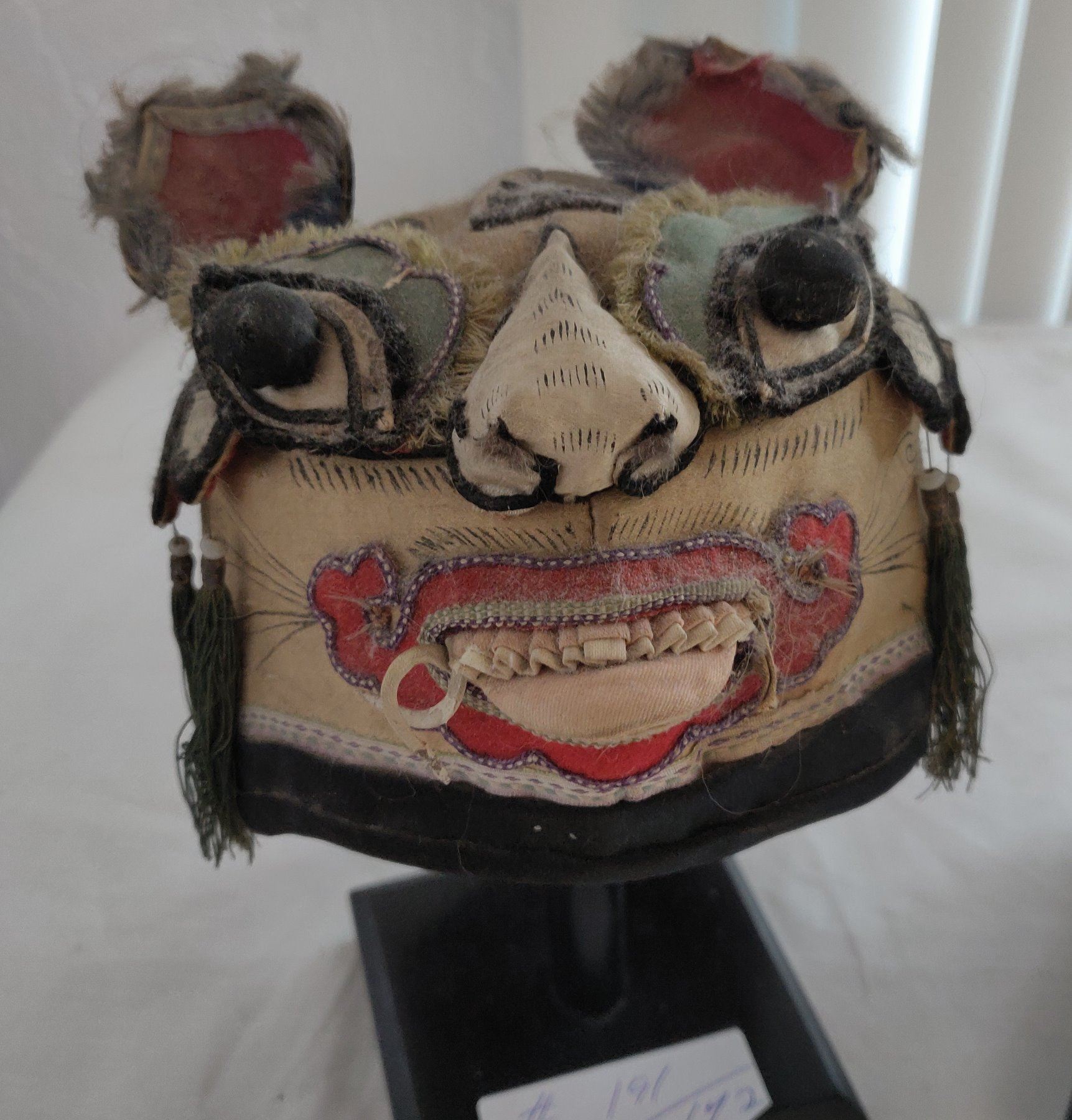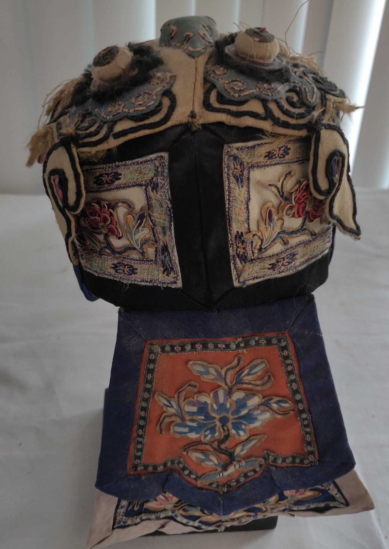 Pair of Chinese Child's Caps, c. 1890s. Made of silk, the items measure approx. 8" x 5" x 5". Early Chinese. Worn to keep evil spirits away from children, stands included. Condition: Some wear, see images. Shipping: $26.50 w/insurance and signature, due to value and size.