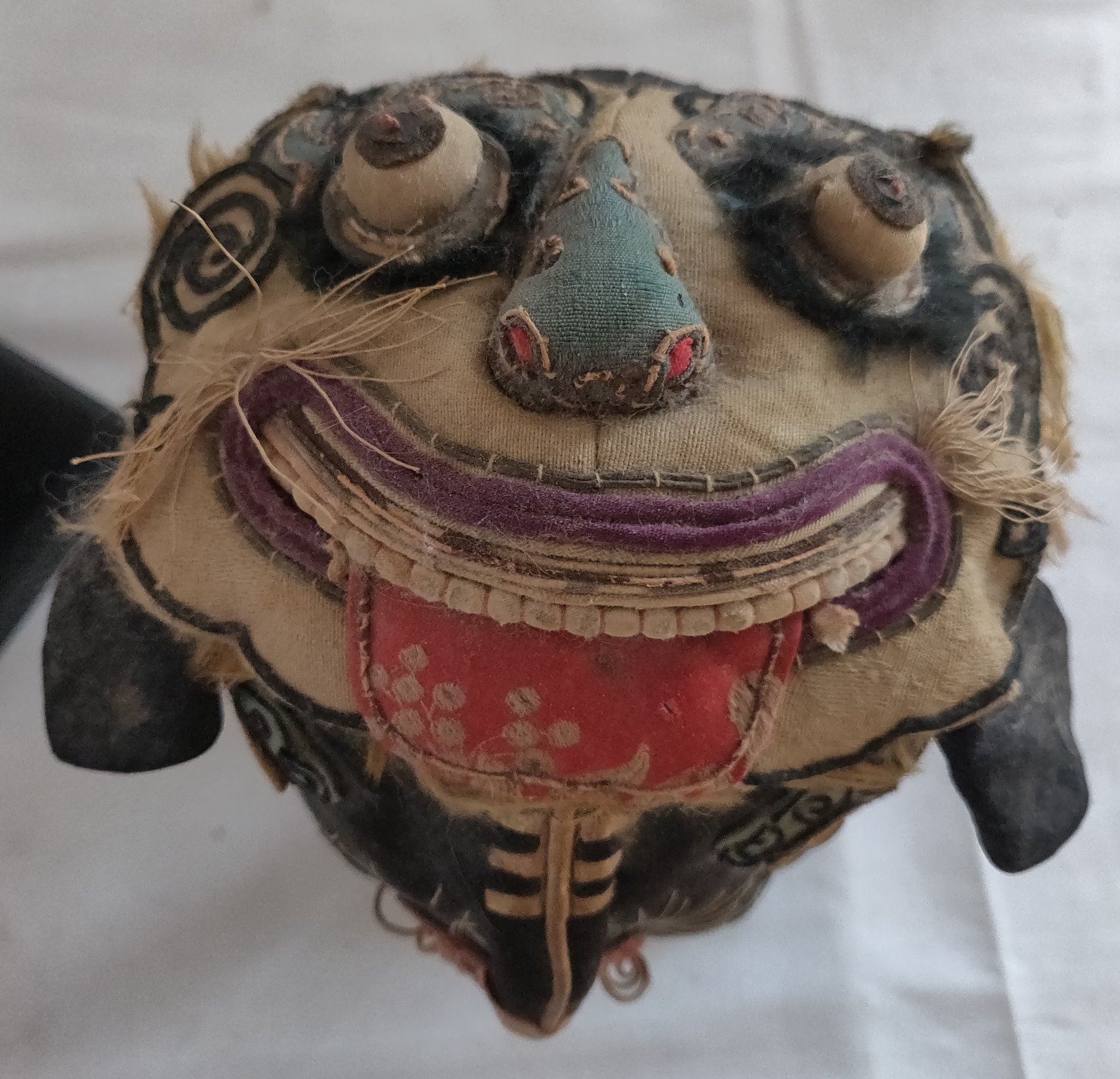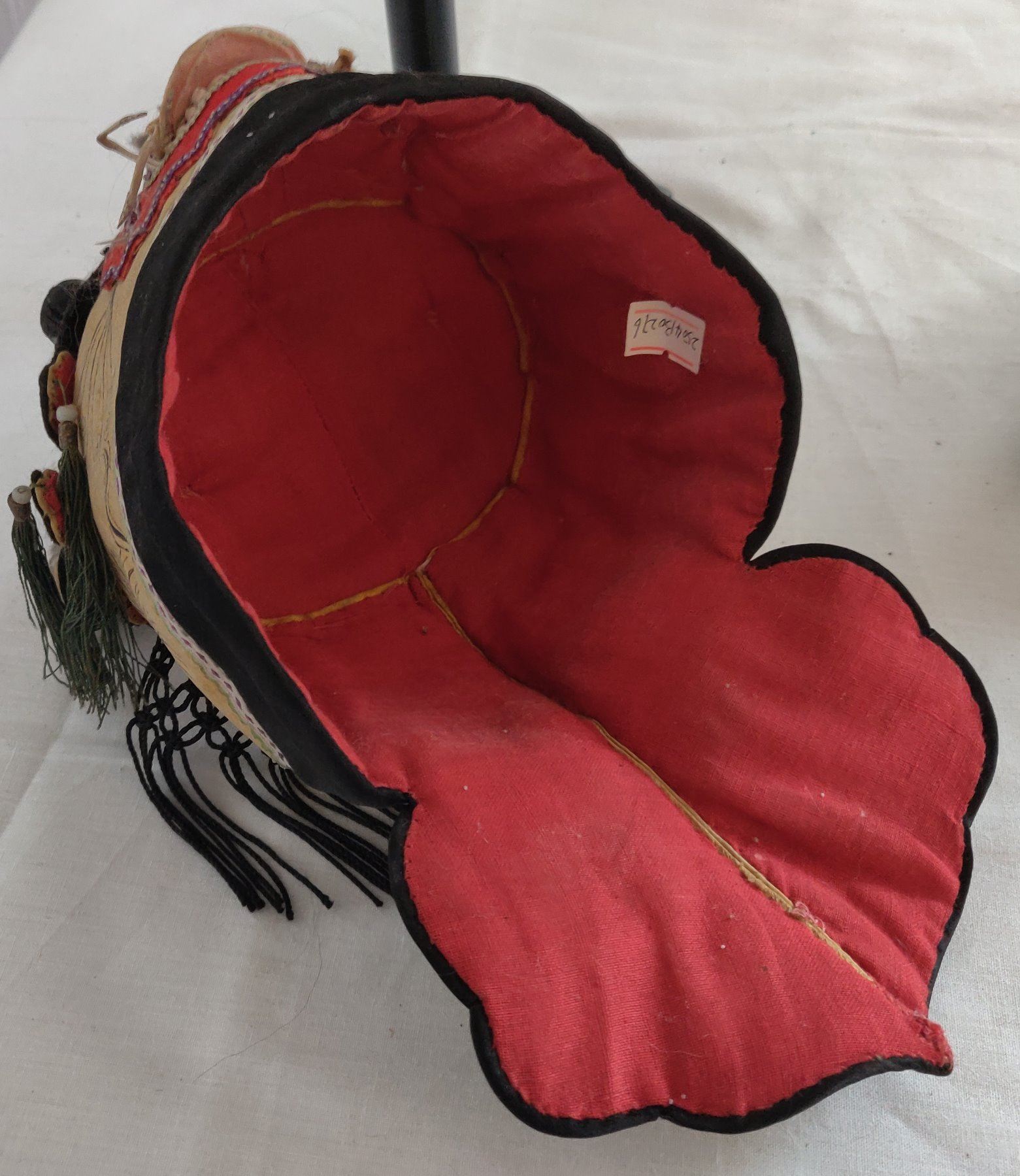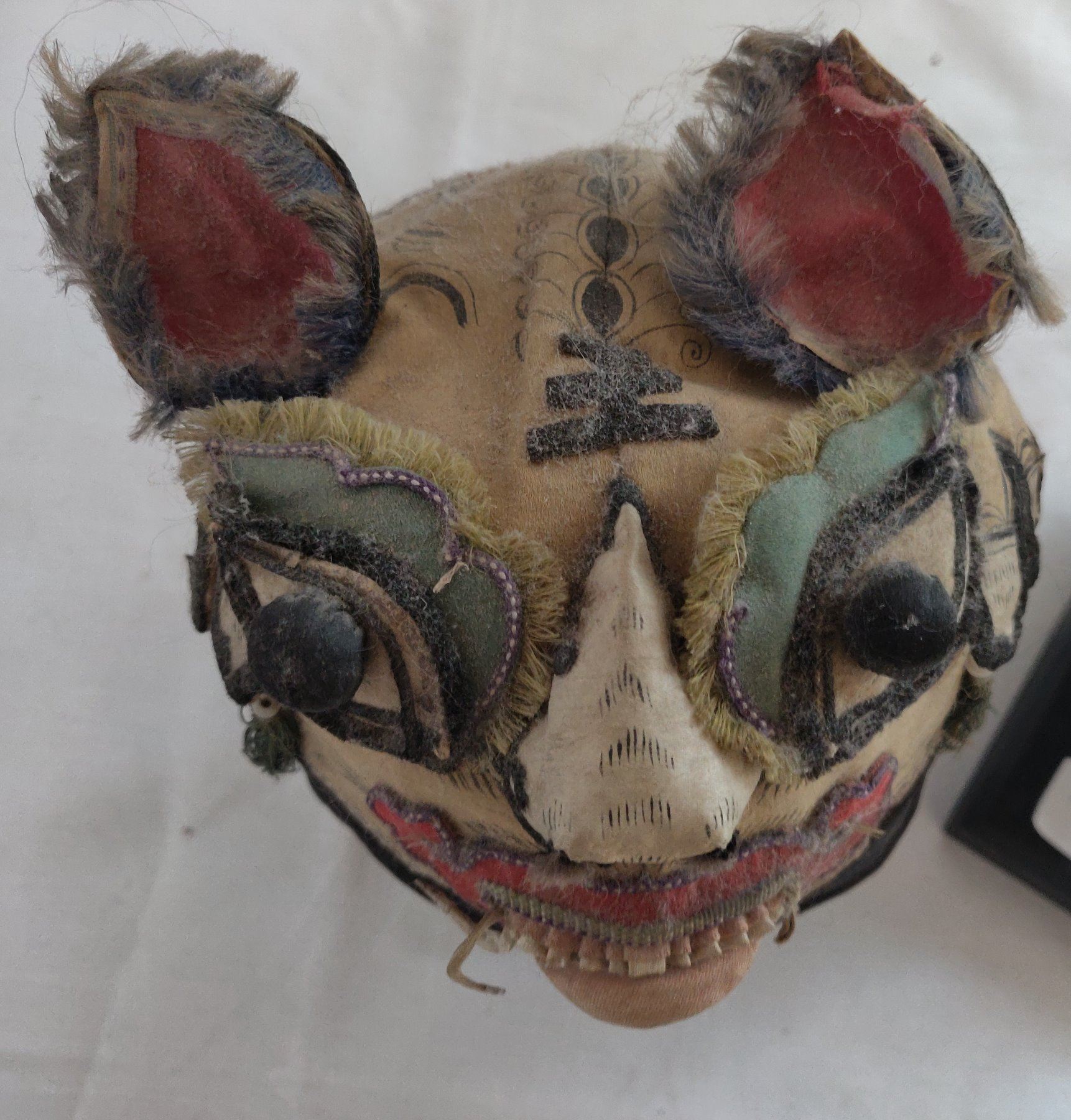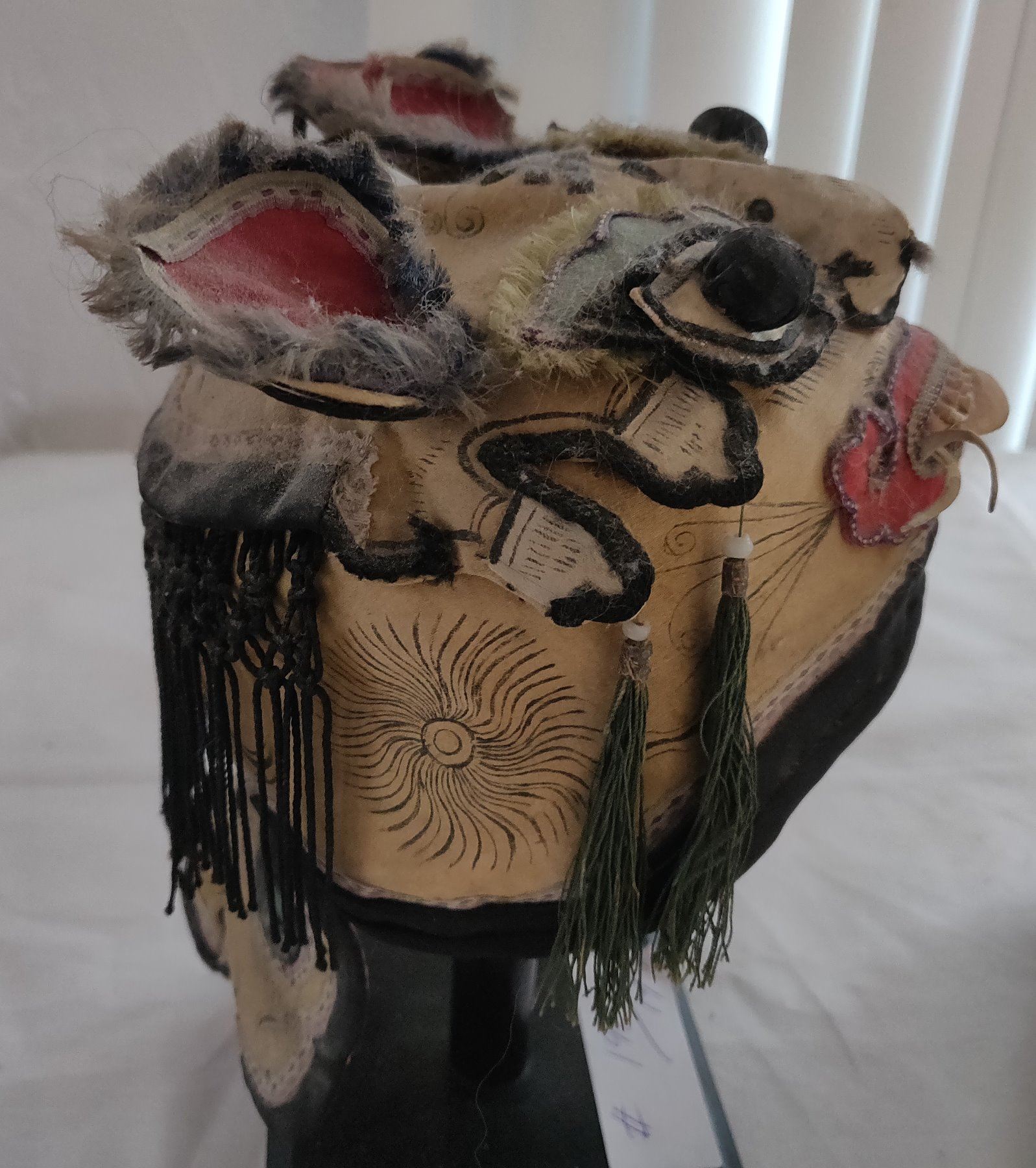 Pair of Chinese Child's Caps, c. 1890s. Made of silk, the items measure approx. 8" x 5" x 5". Early Chinese. Worn to keep evil spirits away from children, stands included. Condition: Some wear, see images. Shipping: $26.50 w/insurance and signature, due to value and size.