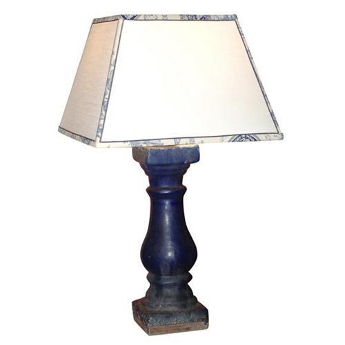 Pair of 19th-century Chinese cobalt blue glazed stoneware balusters mounted as lamps, with custom white linen shades edged in blue and white toile de Jouy.