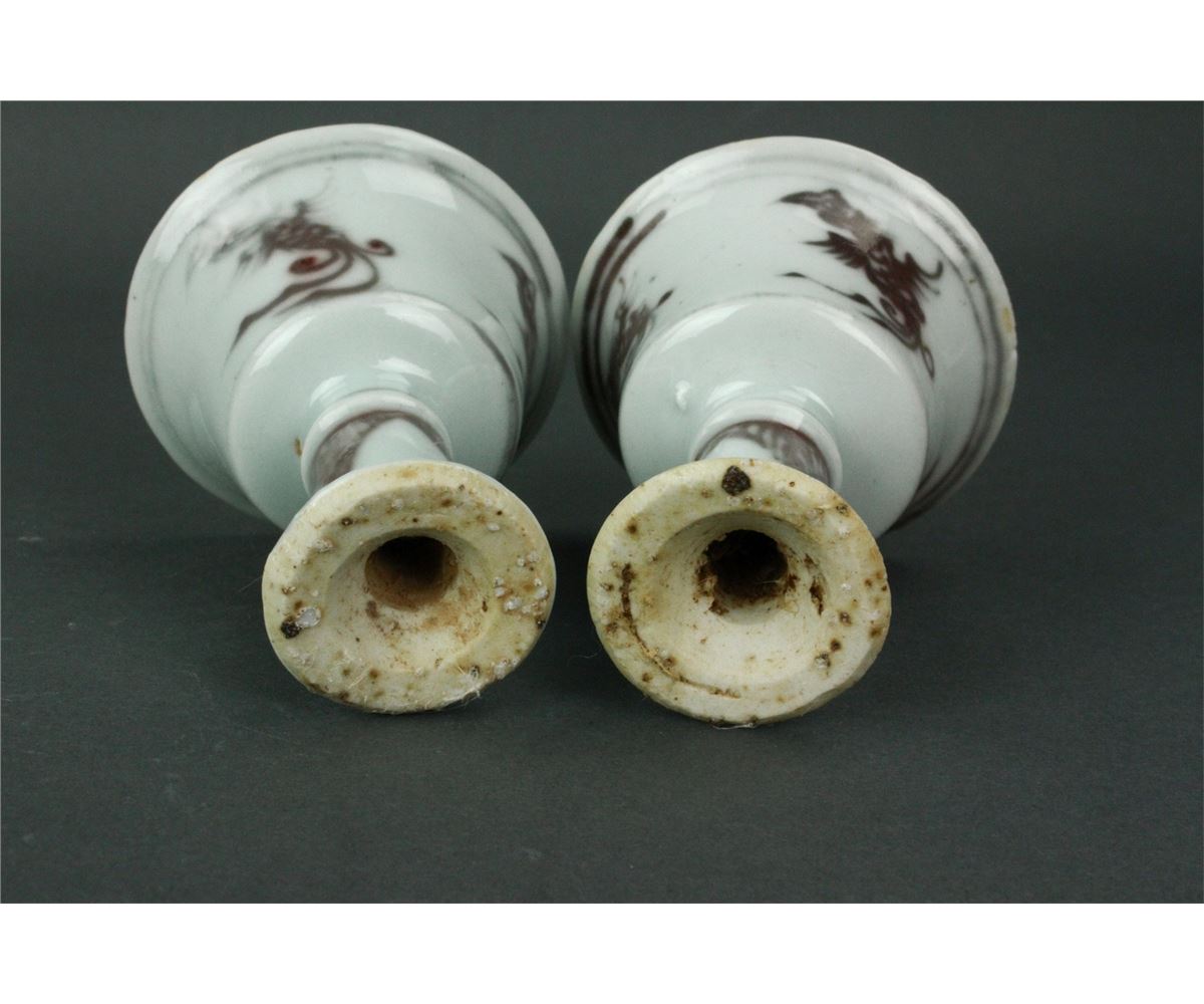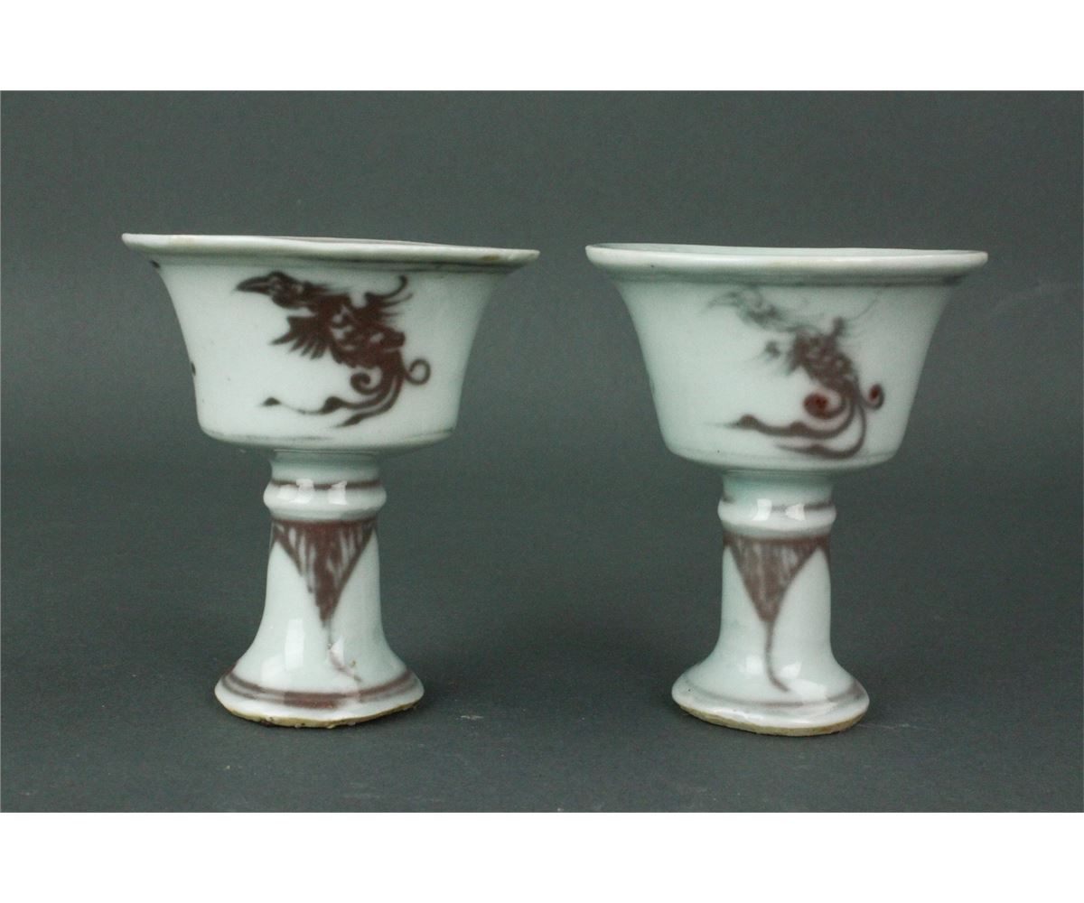 Pair of Chinese copper red porcelain stem cups; of steep flaring body supported on high splayed foot rim; decorated with phoenix emblems; unglazed base; H: 7.5 cm, D: 6.5 cm, 135 grams total