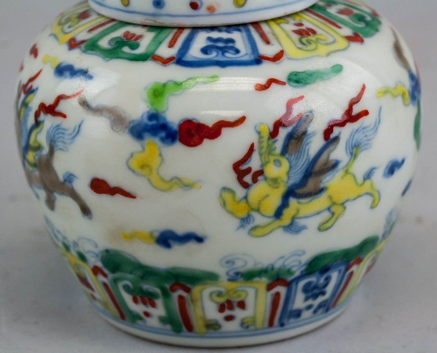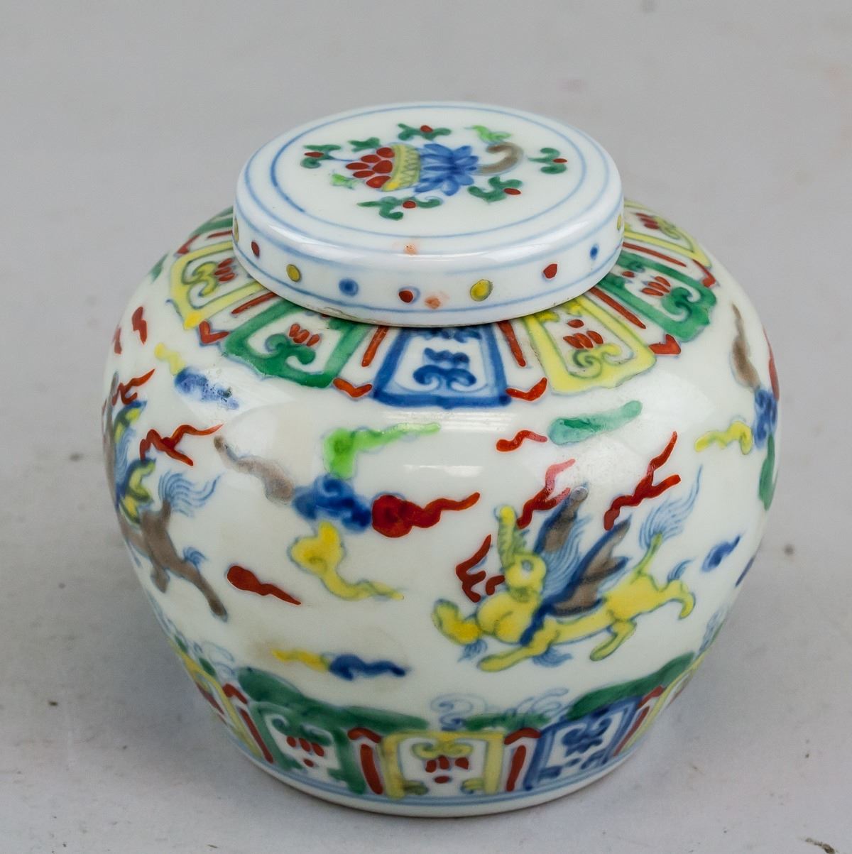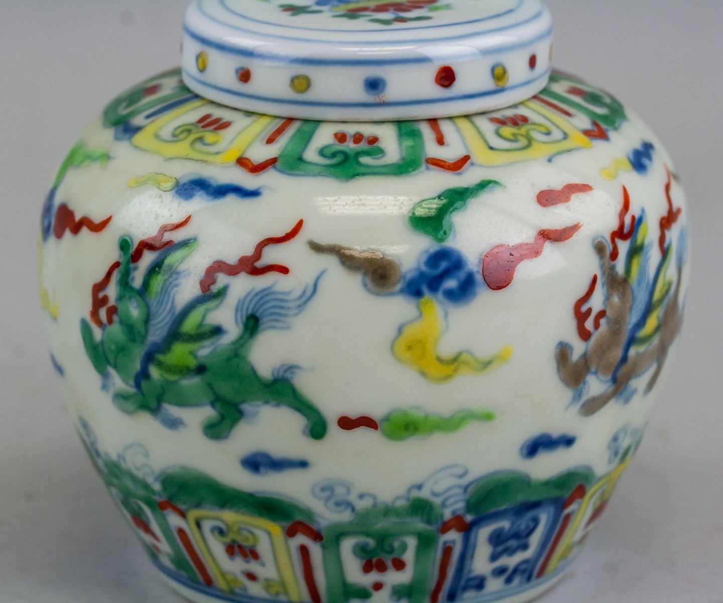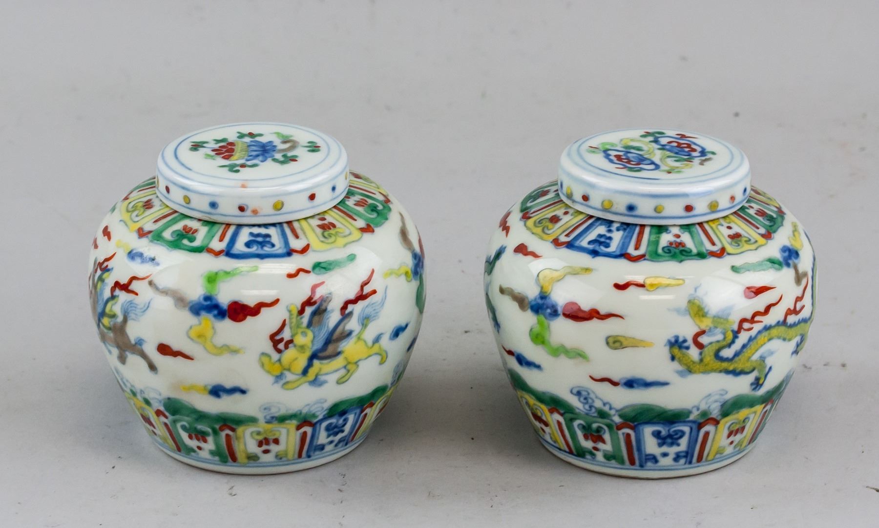 Pair of Chinese doucai porcelain jar. Of round body with lid. Painted with Kirin and dragon. One-character Tian mark on base. 9 x 9 cm, 325 grams (total)