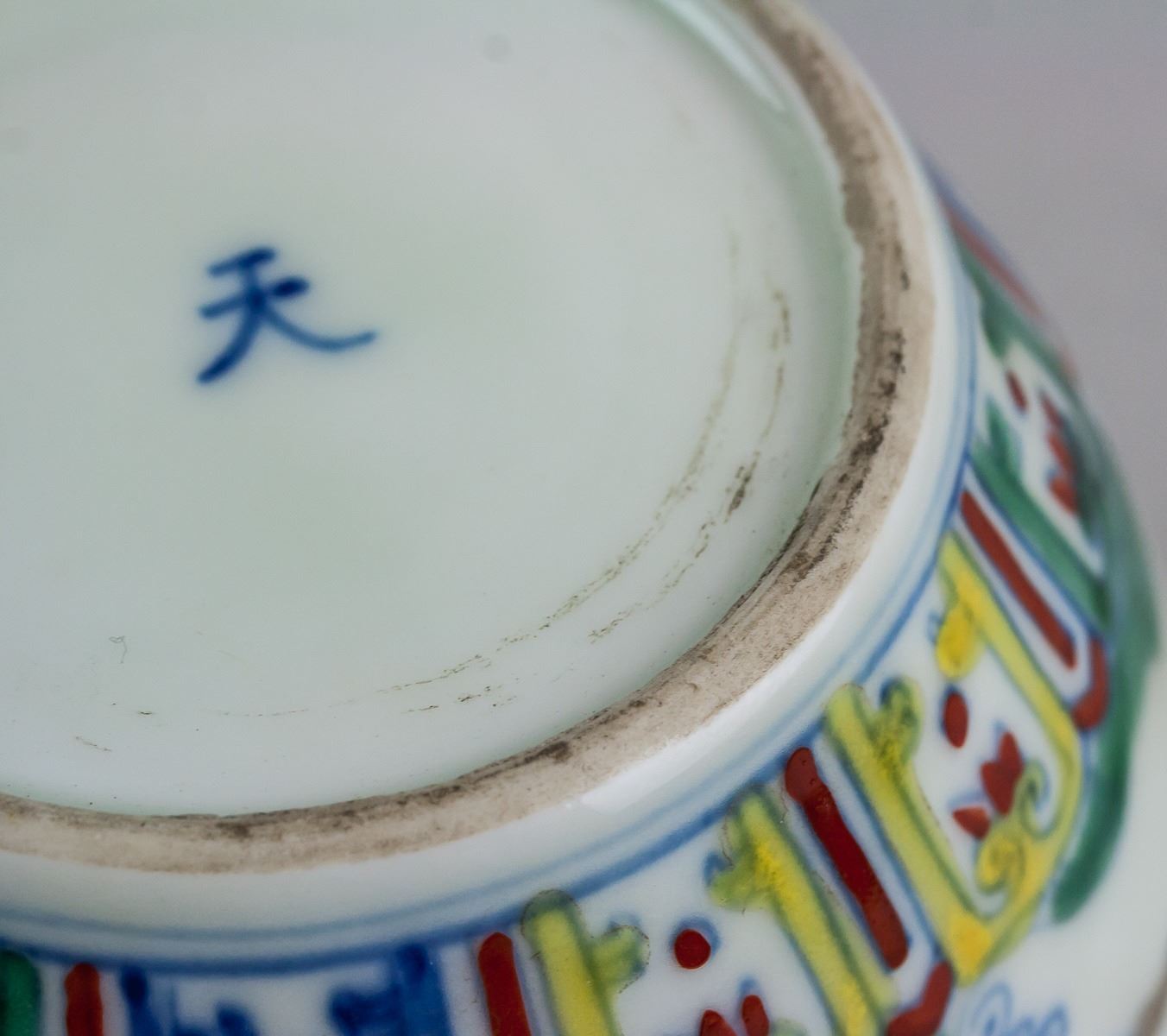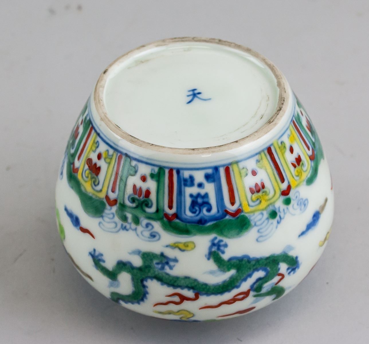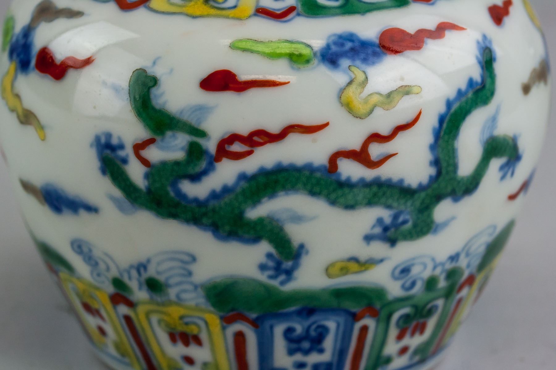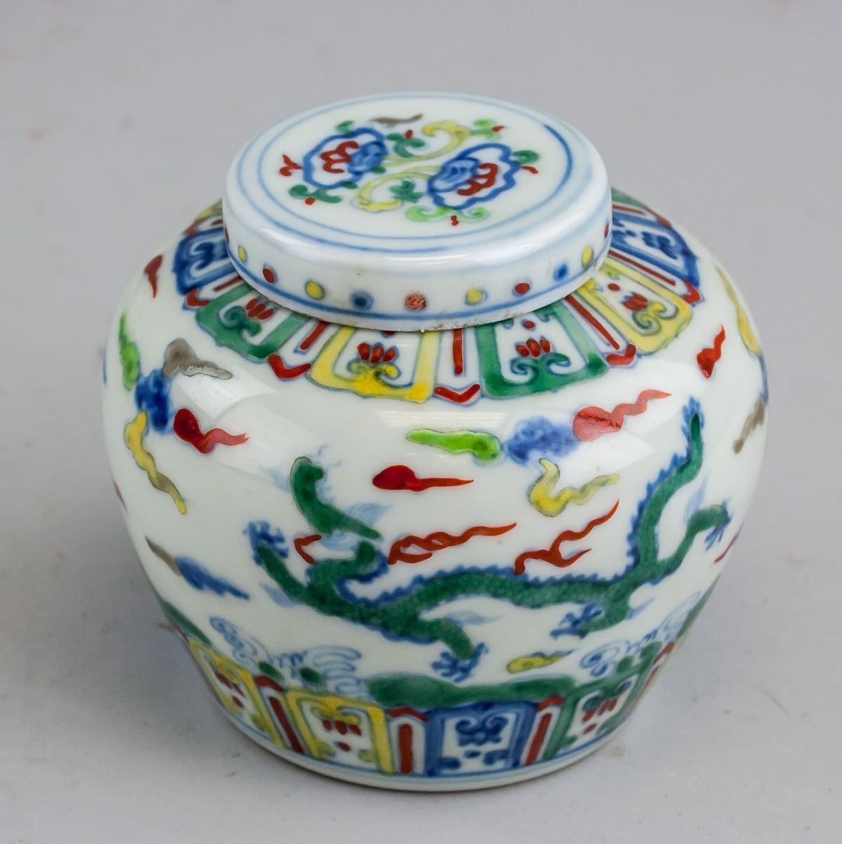 Pair of Chinese doucai porcelain jar. Of round body with lid. Painted with Kirin and dragon. One-character Tian mark on base. 9 x 9 cm, 325 grams (total)