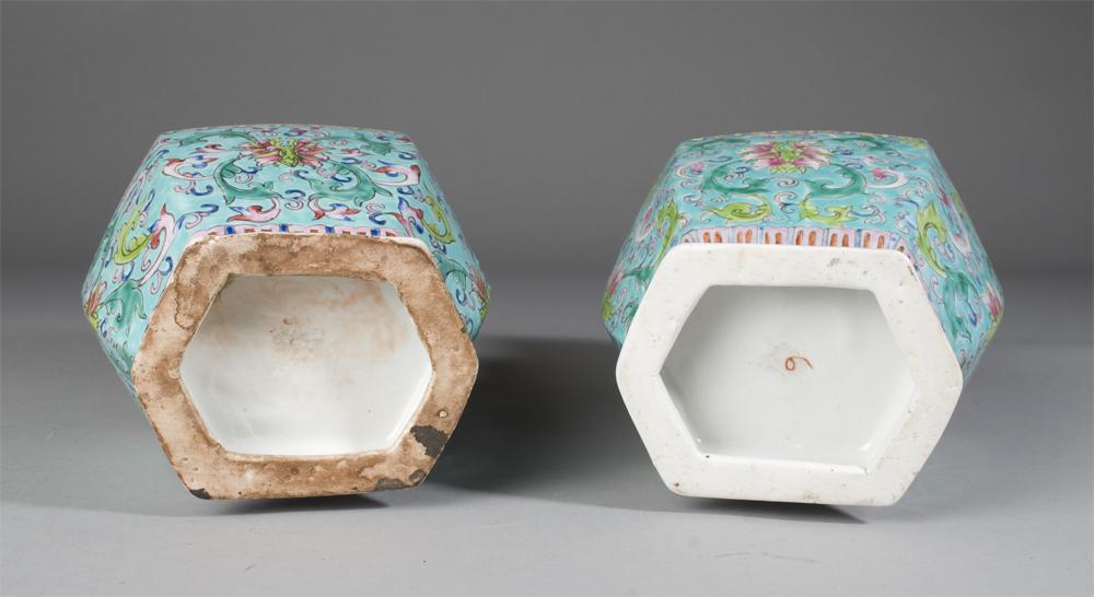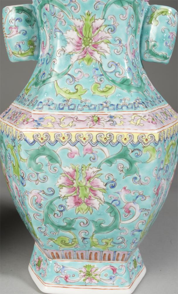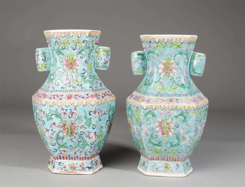 Two handled vases decorated with floral and leaf designs in turquoise field with greens, pinks, blues, purples and yellows in enamel. 10" H, one slightly leans.