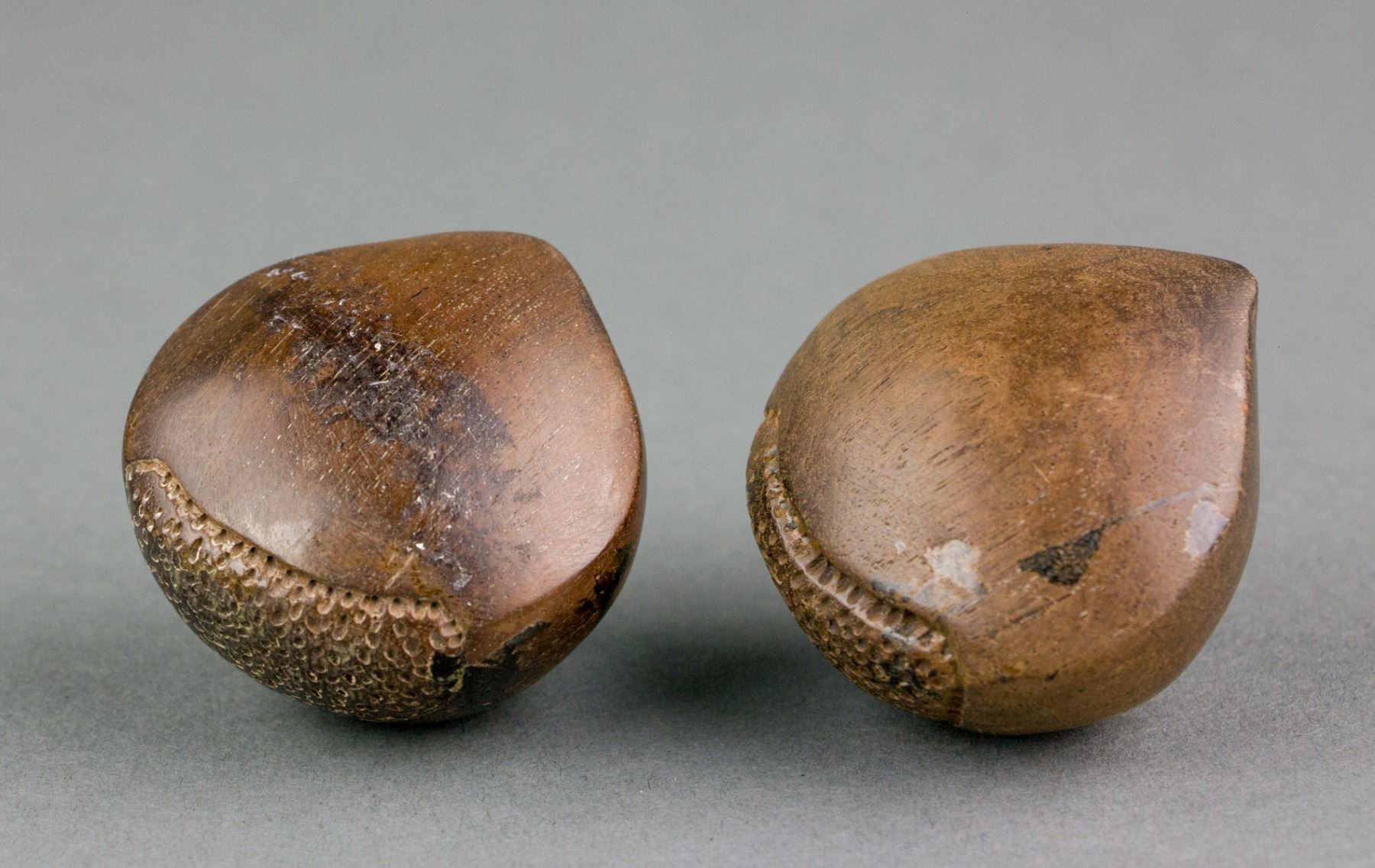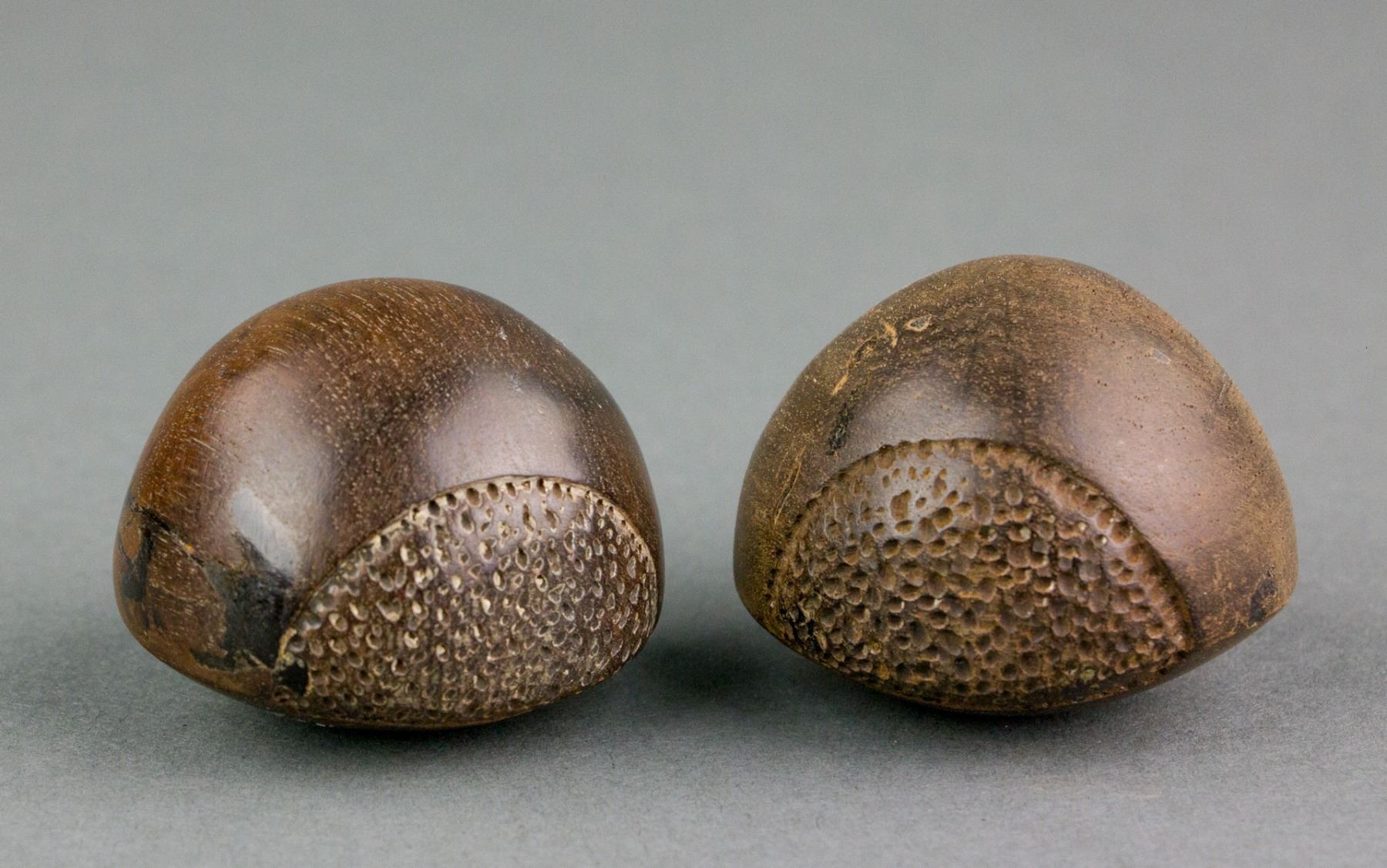 Pair of Chinese fine wood carvings; in shape of chestnuts; H: 4.3 cm, W: 4.5 cm, 87 grams total