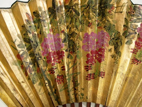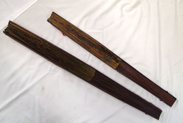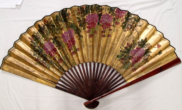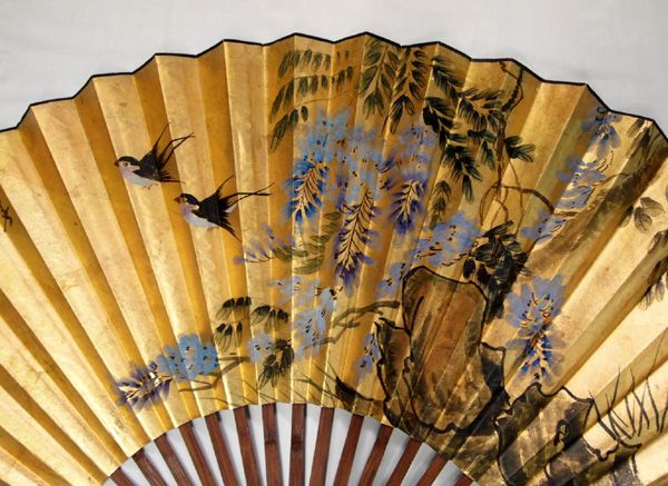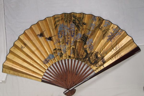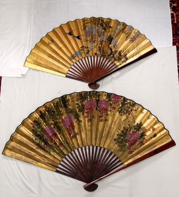 Pair of Chinese Gold Lame' Paper Bird Fans. Some tearing where paper attaches to lacquered wood. Paper label on both fans. 1) Fujian China 2) Made in China. Largest 39''L x 49''W. Ribbon on back for hanging.
