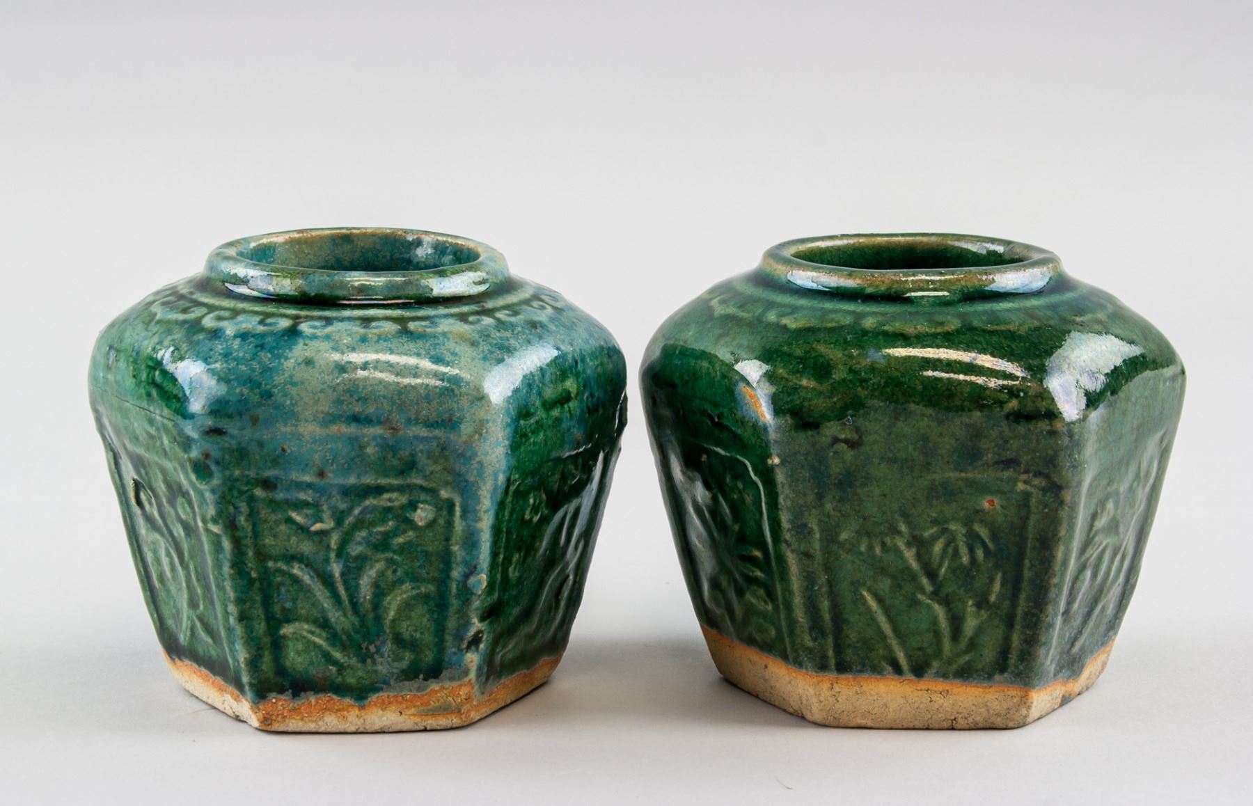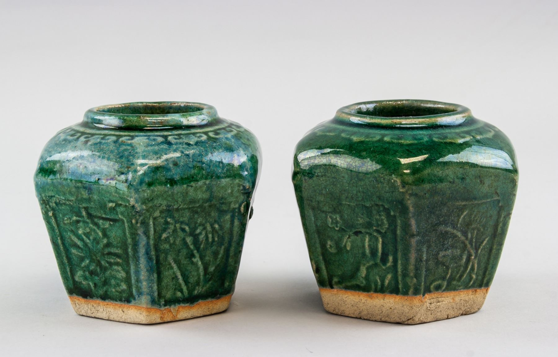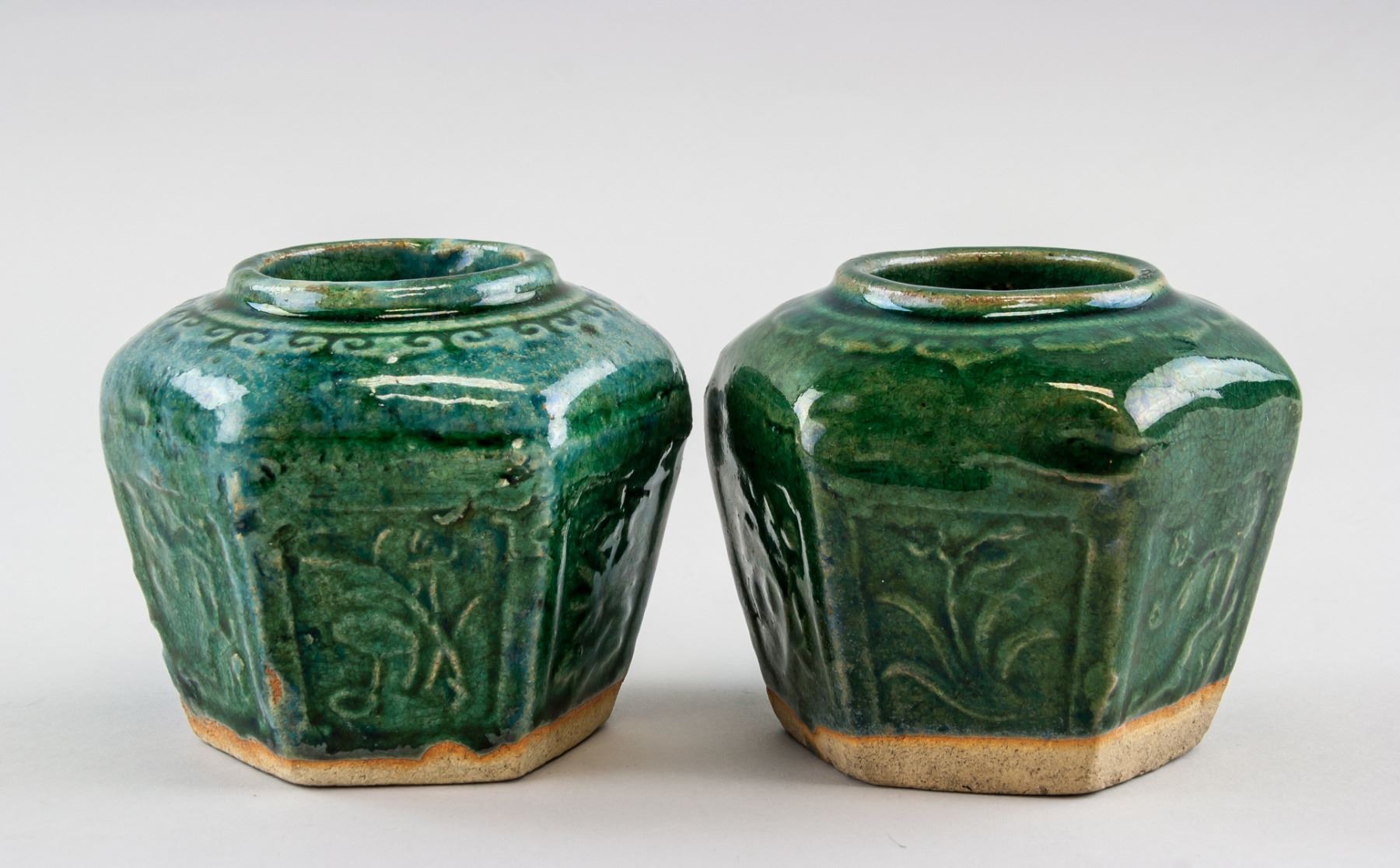 Pair of Chines green glazed pottery jar, of hexagon body, tapering to bottom, carved with flowers, 8.5 x 10 cm, 817 grams
