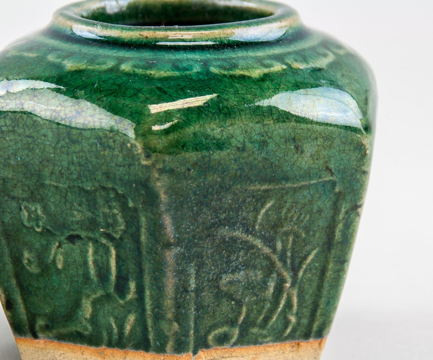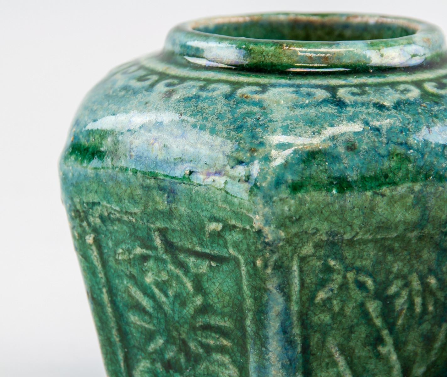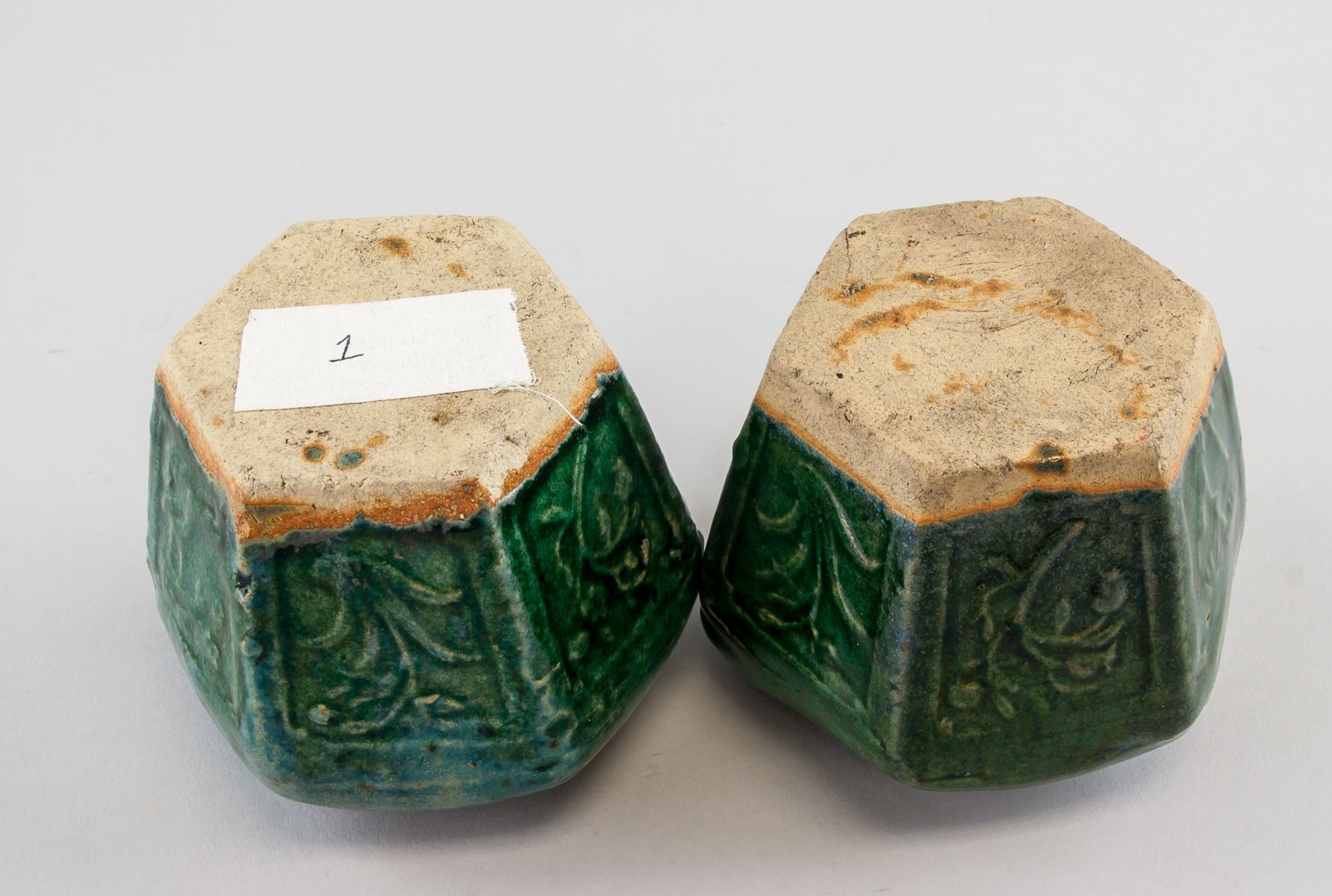 Pair of Chines green glazed pottery jar, of hexagon body, tapering to bottom, carved with flowers, 8.5 x 10 cm, 817 grams