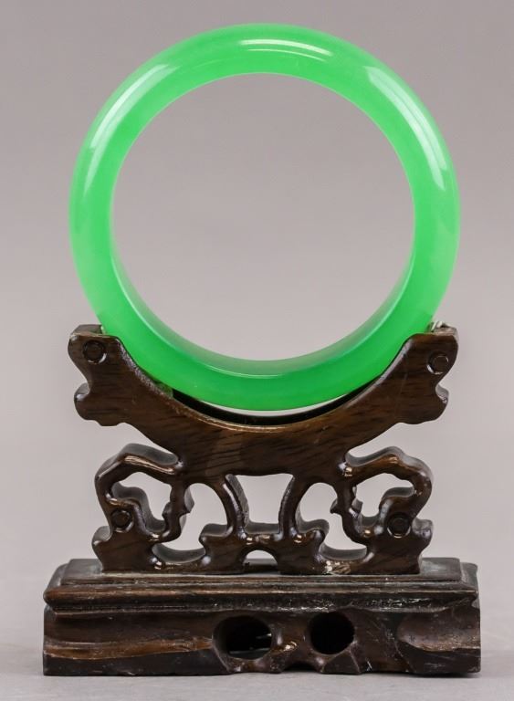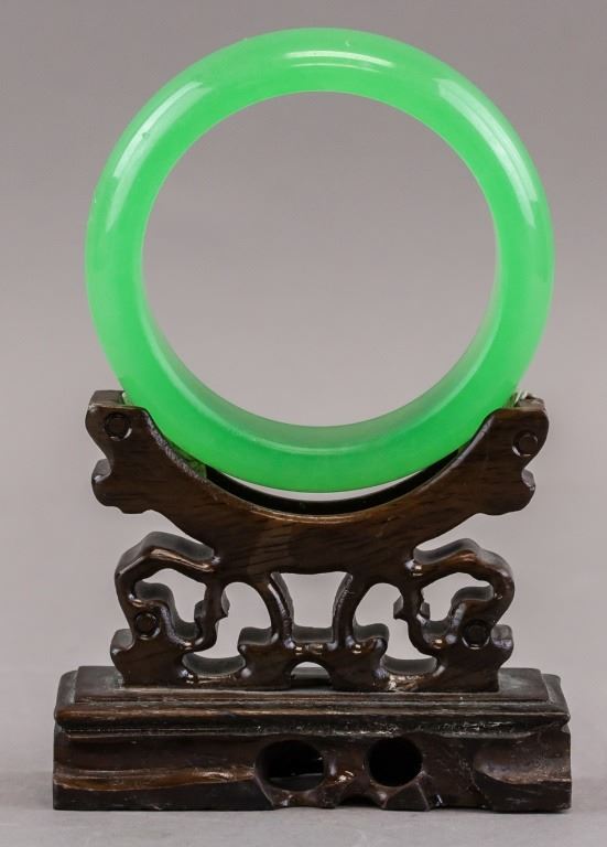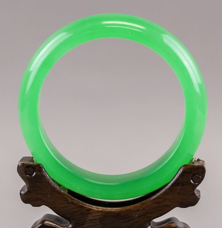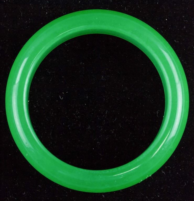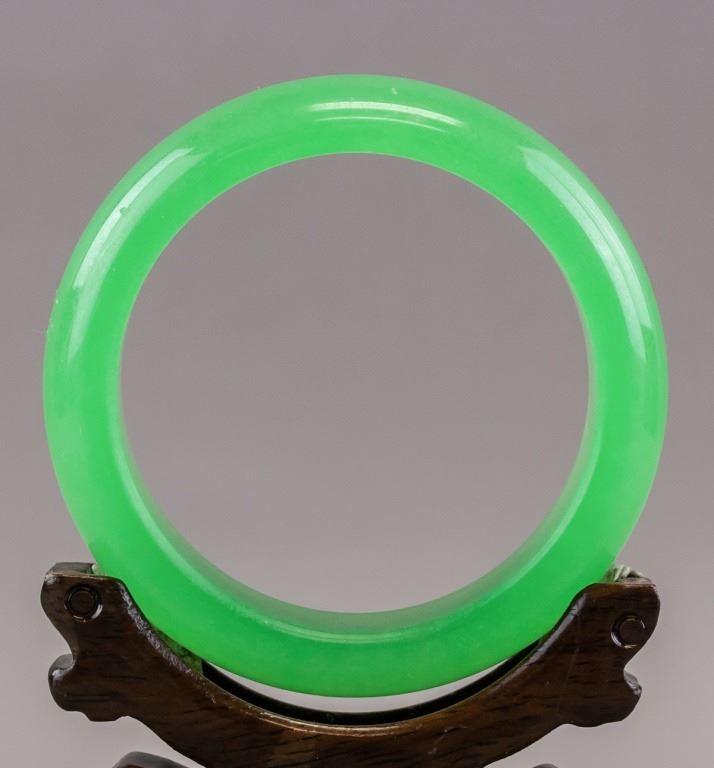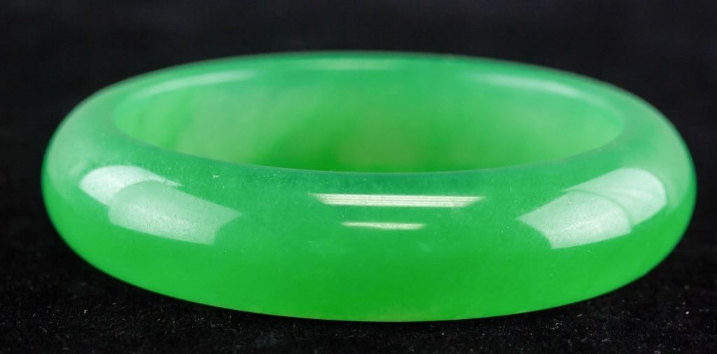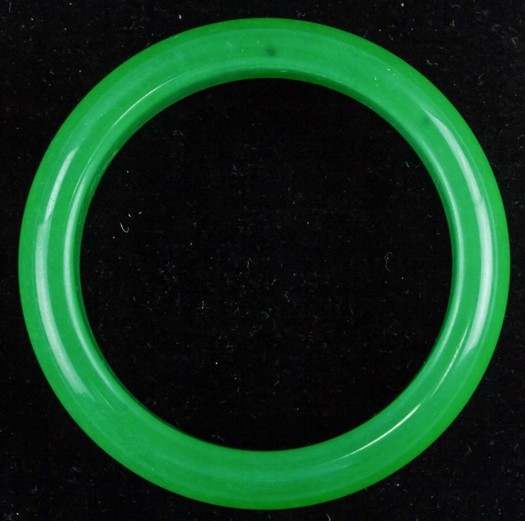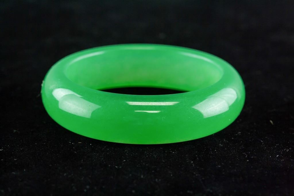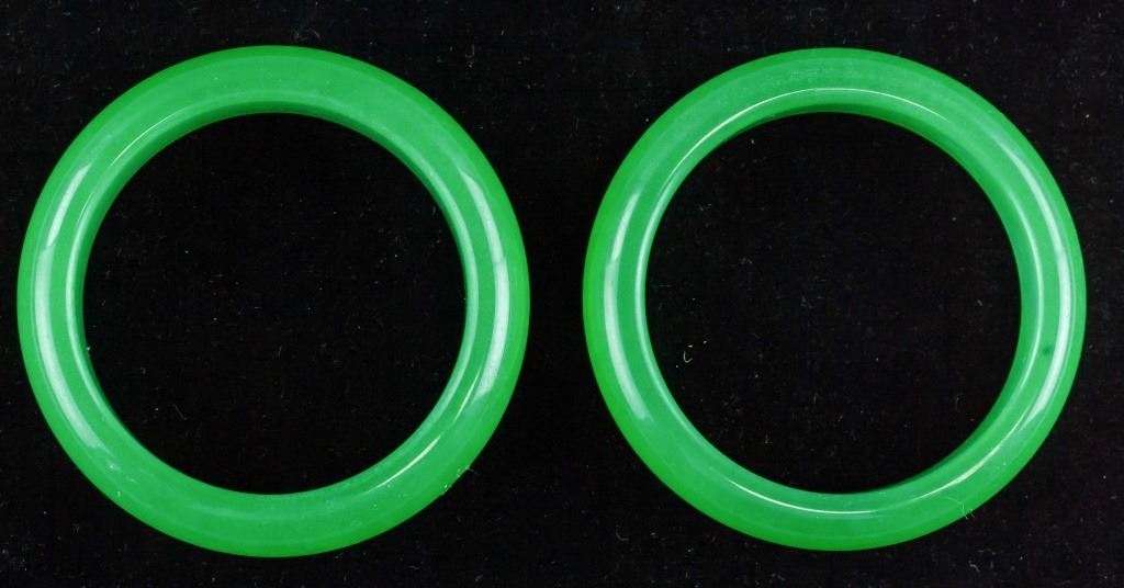 Pair of Chinese hardstone bangles. Of green tone. Of flat inside and rounded outside. Inner diameter: 6.5 cm. Outer diameter: 8cm. 71 grams; 83 grams.