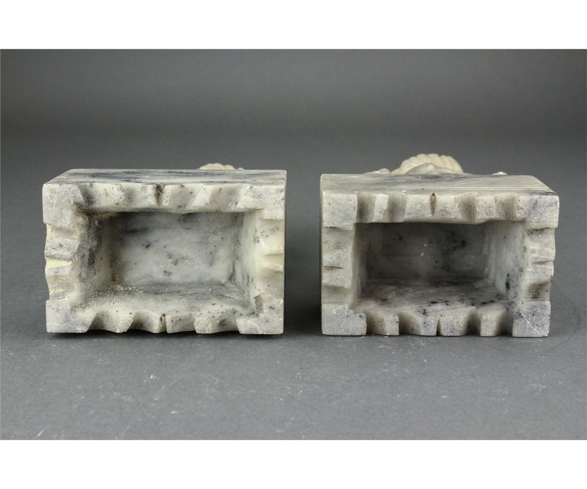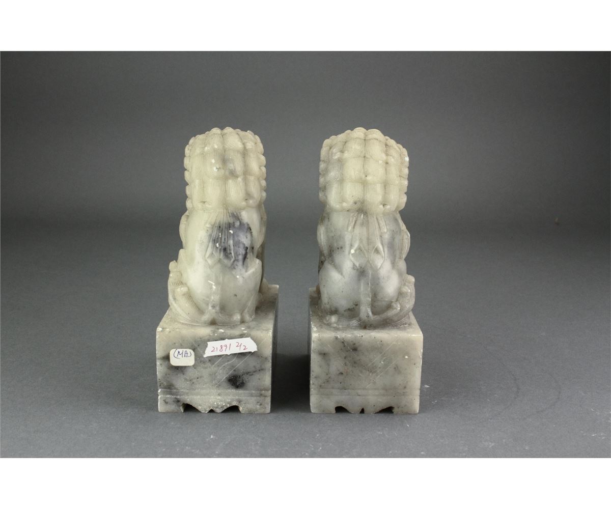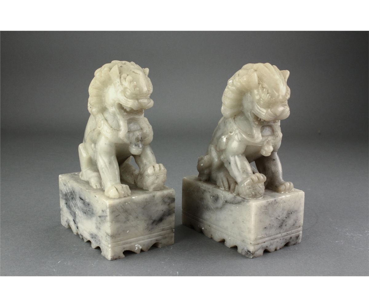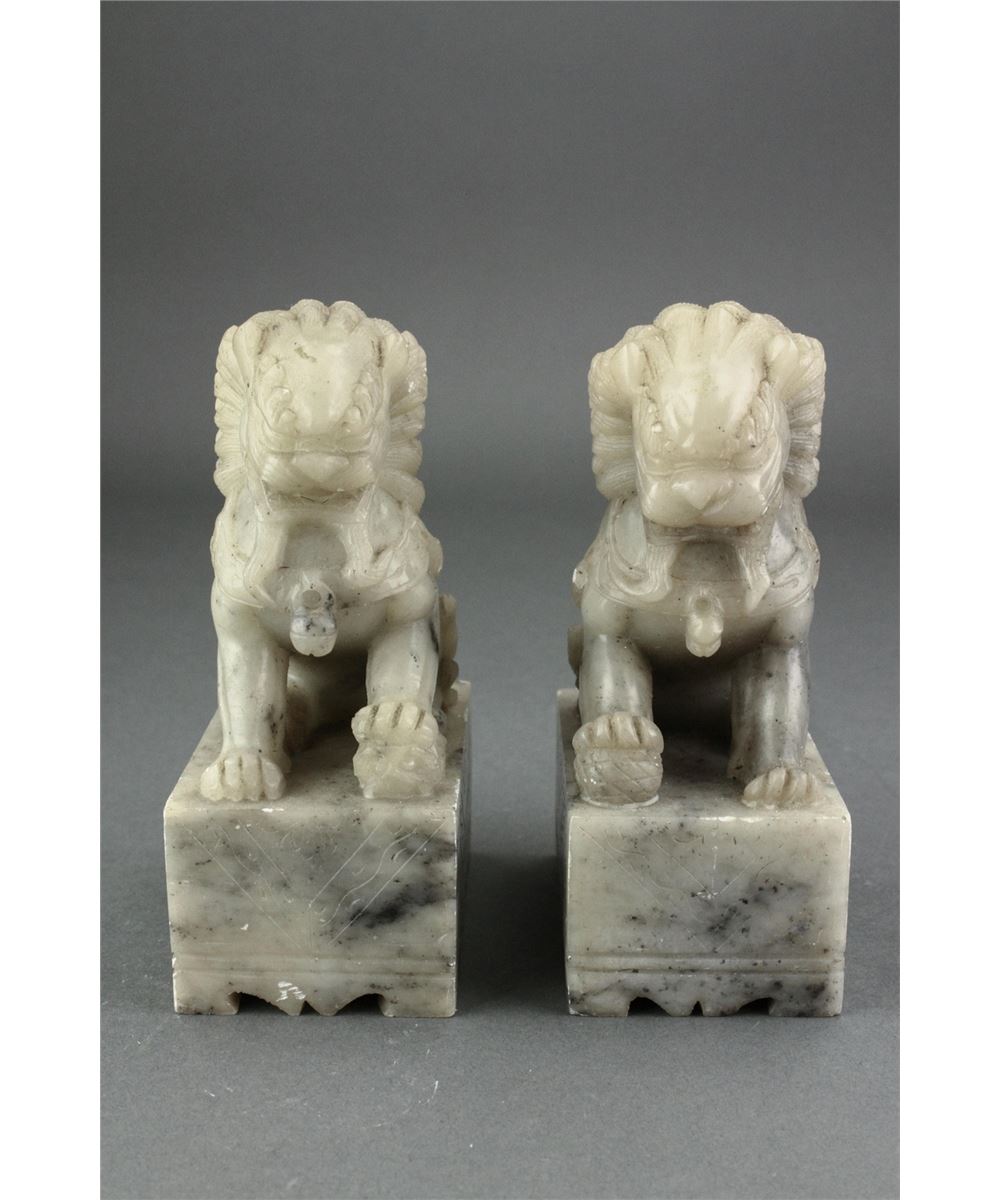 Pair of Chinese hardstone carved Fu dog; featuring male and female Fu dog with stand; of white tone with olive green suffusions; H: 14.5 cm, W: 10 cm, L: 6 cm, 2134 grams (both)