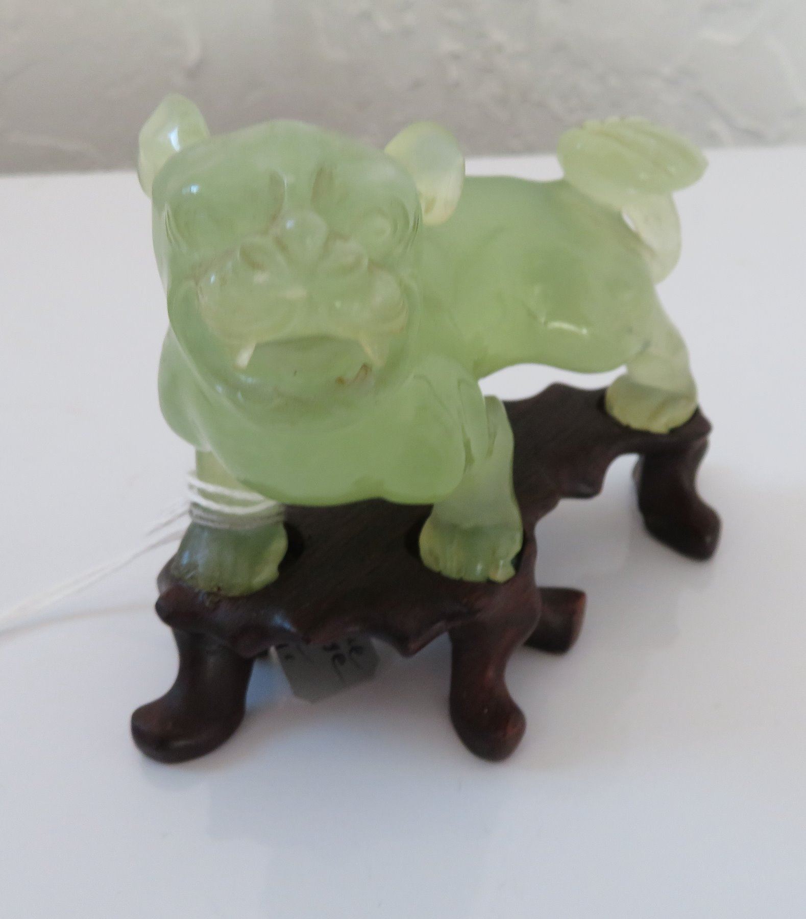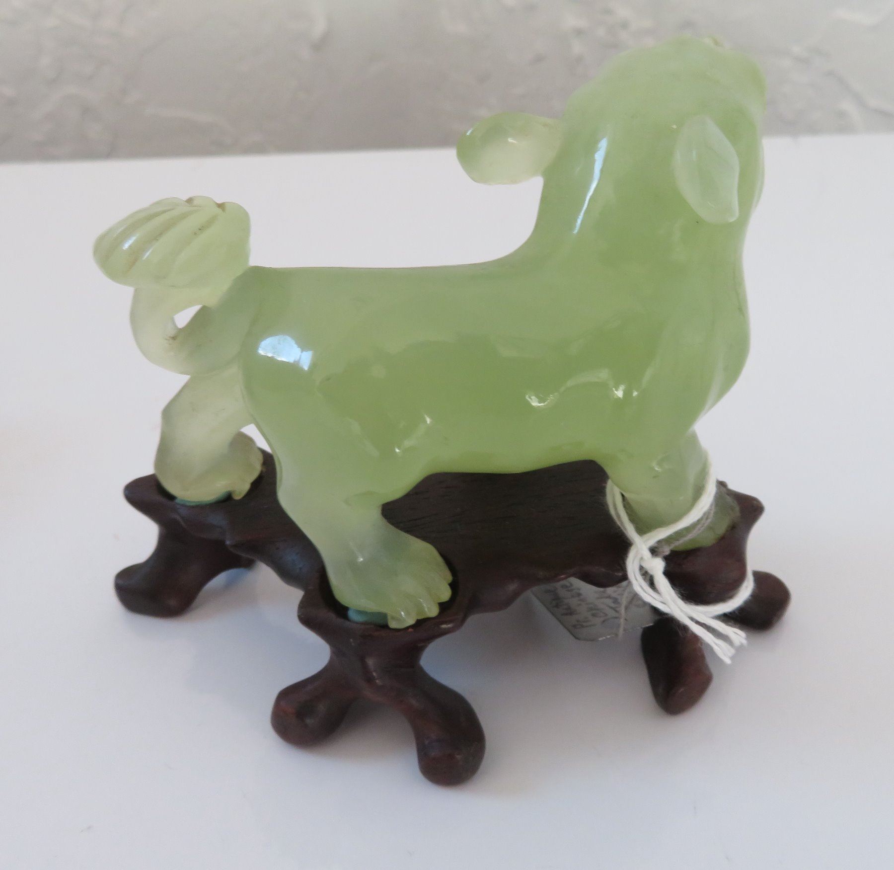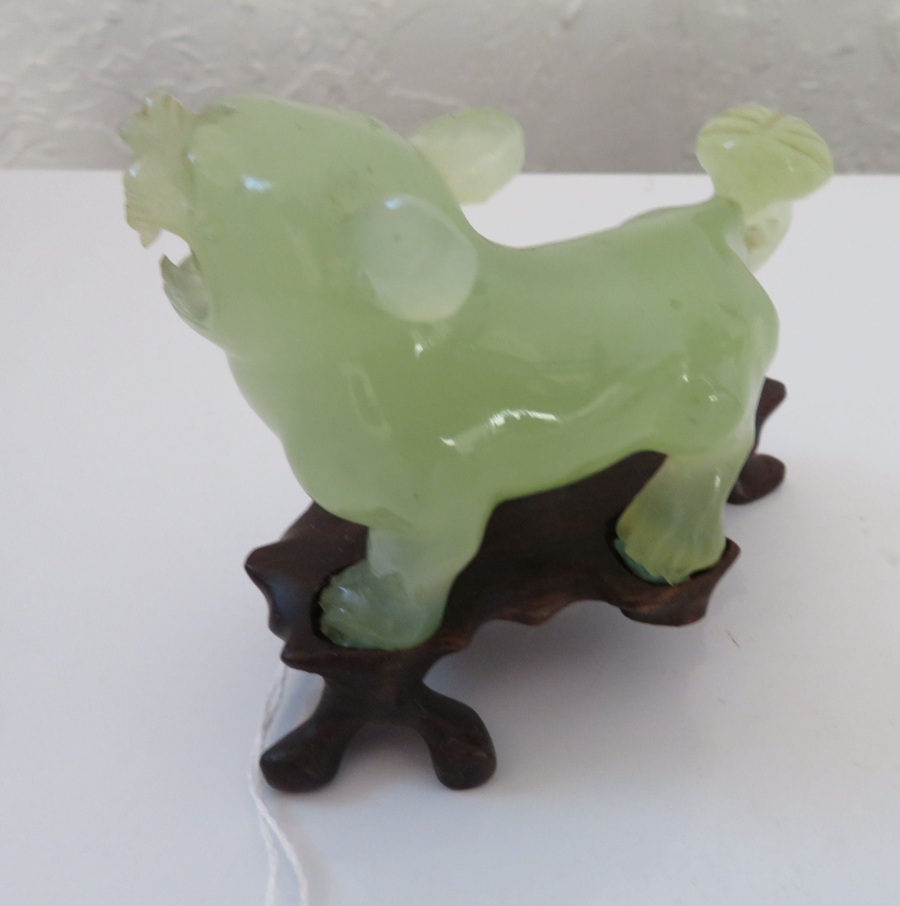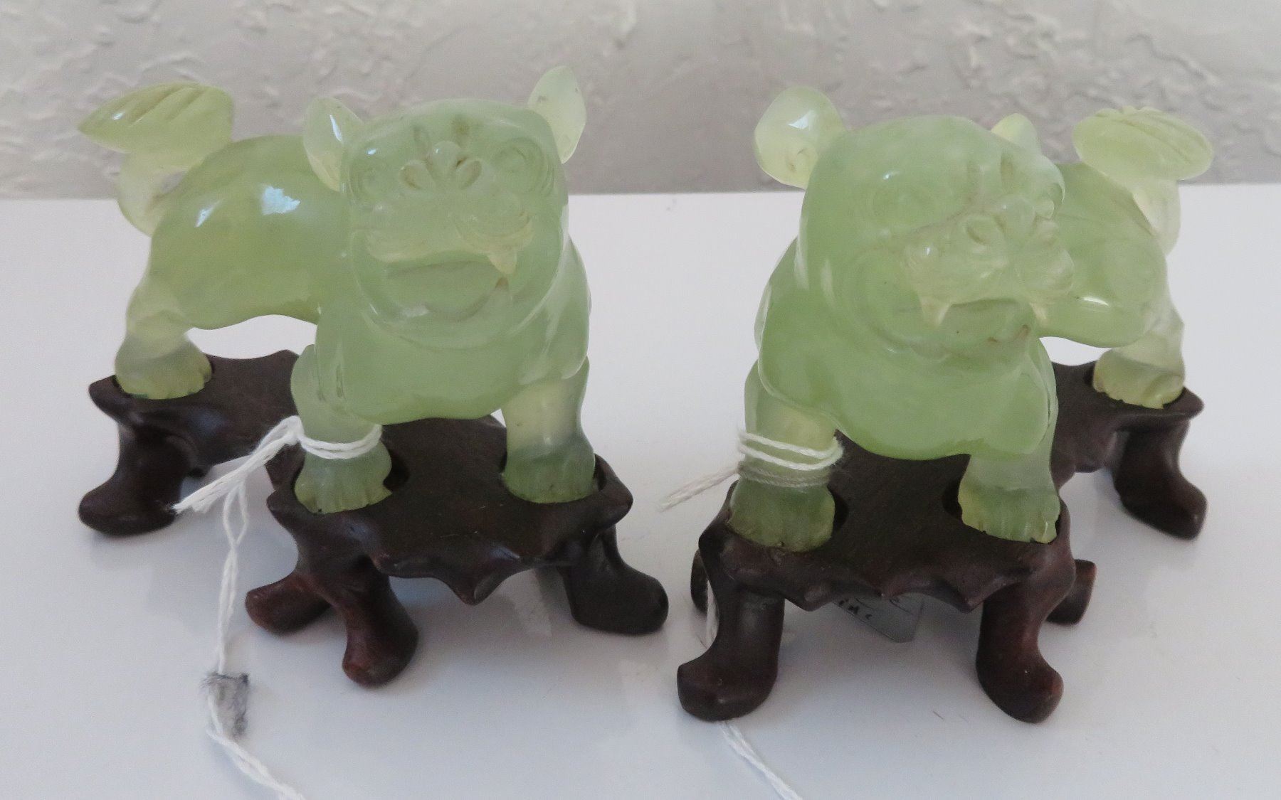 Pair of Chinese Jade Qilin, antique items. Made of jade, the item measures approx. 4 " x 3 1/2". Chinese. Dogs are on wooden bases. Condition: Good, see images. Shipping: $25.50 w/insurance and signature, double-boxed, due to value.