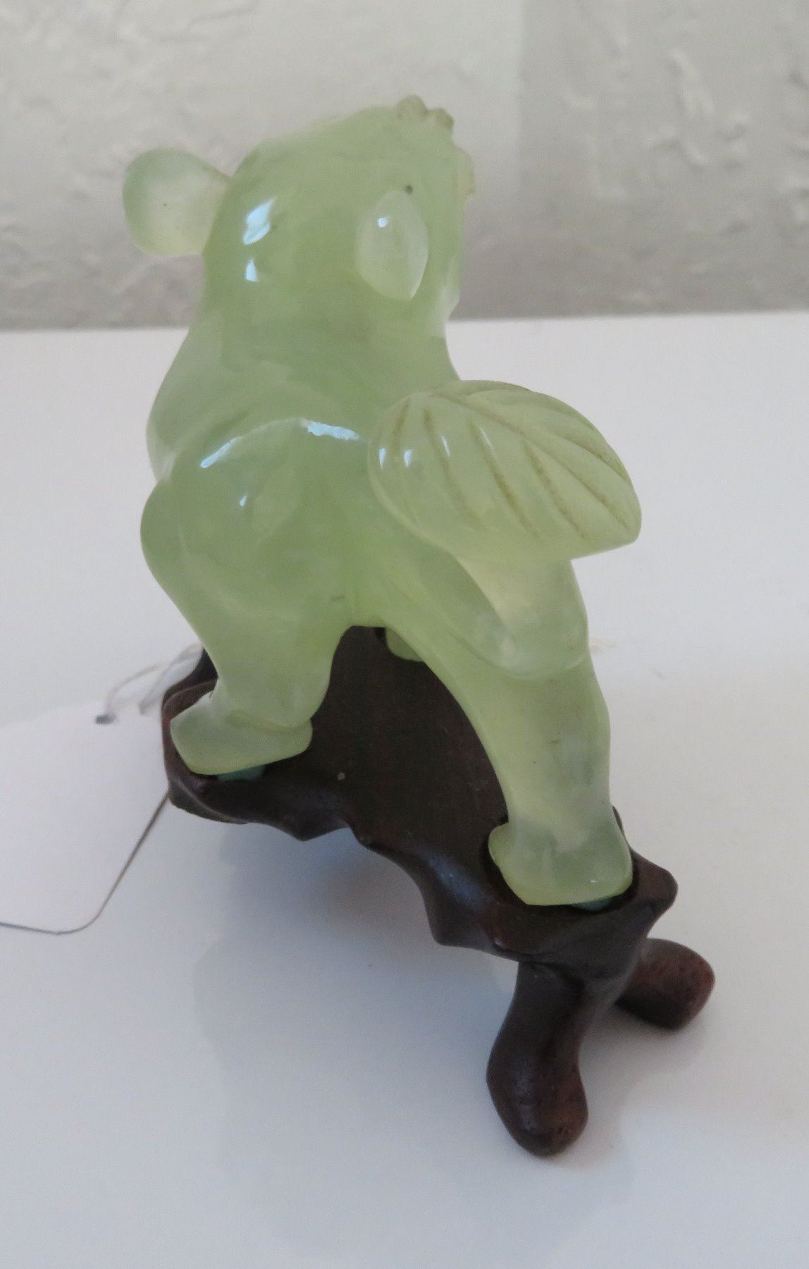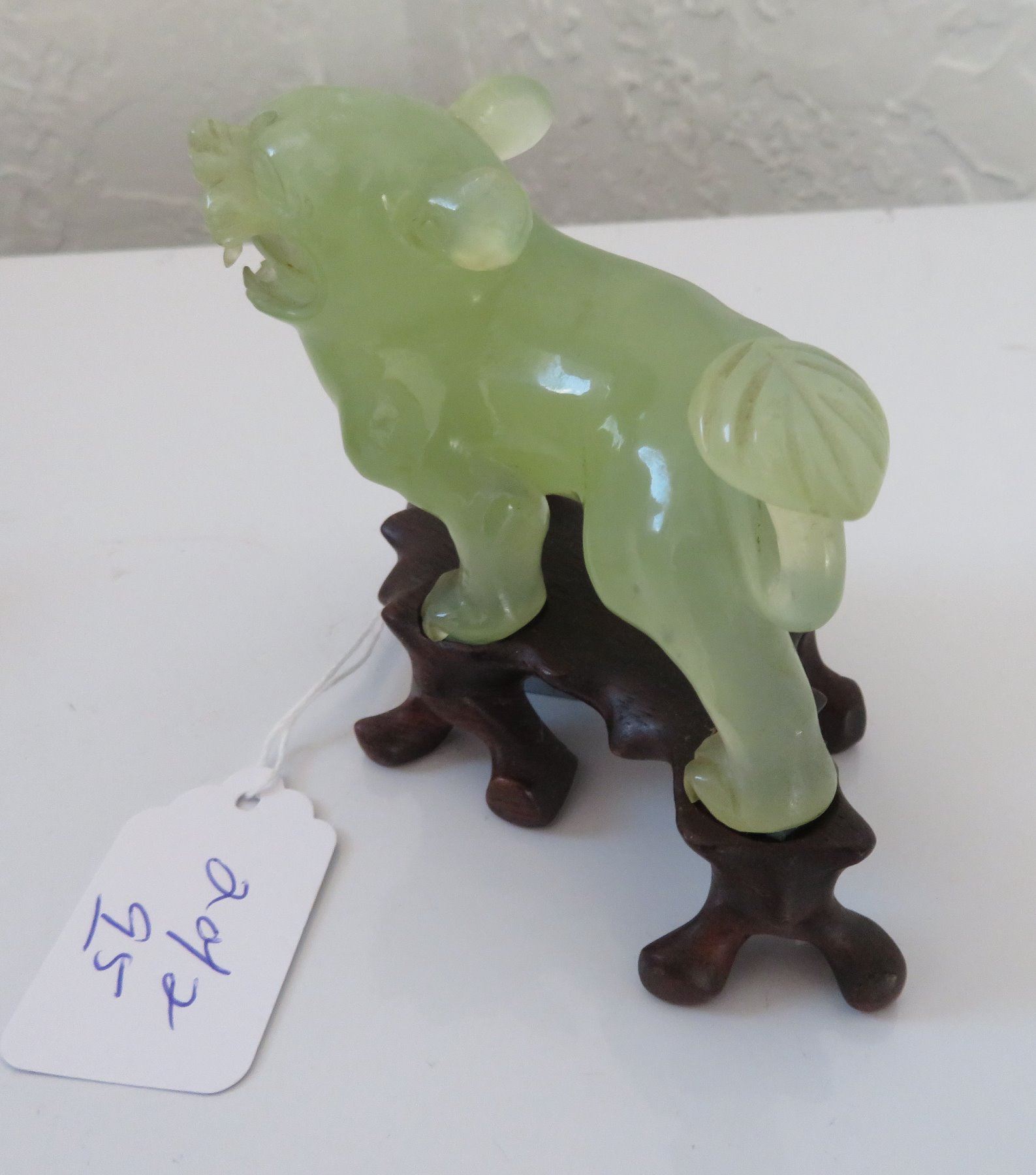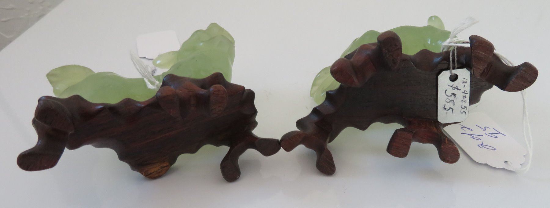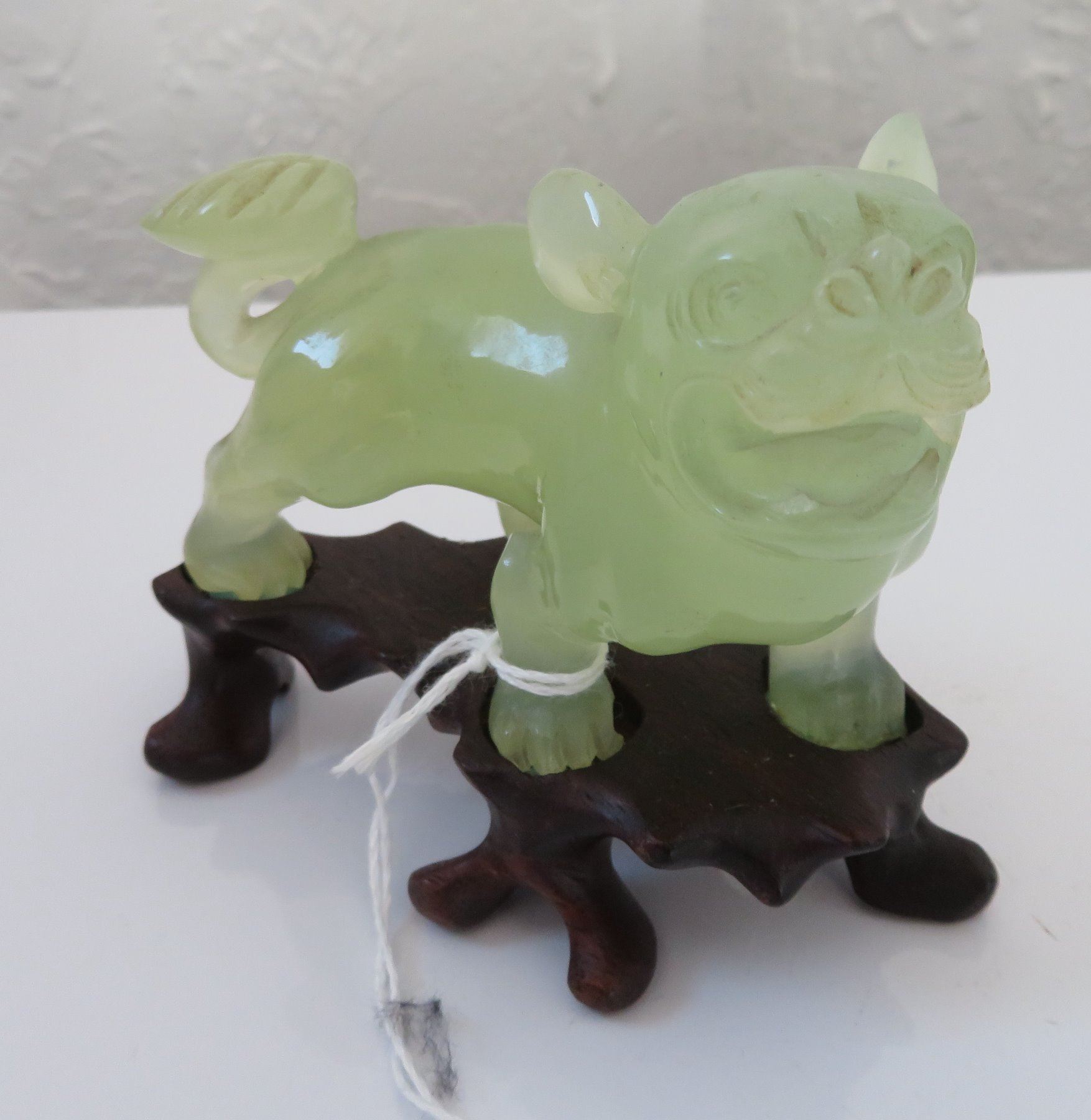 Pair of Chinese Jade Qilin, antique items. Made of jade, the item measures approx. 4 " x 3 1/2". Chinese. Dogs are on wooden bases. Condition: Good, see images. Shipping: $25.50 w/insurance and signature, double-boxed, due to value.
